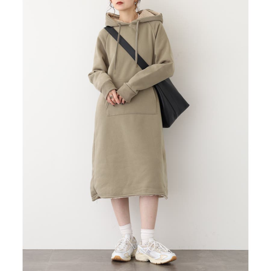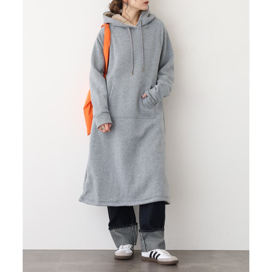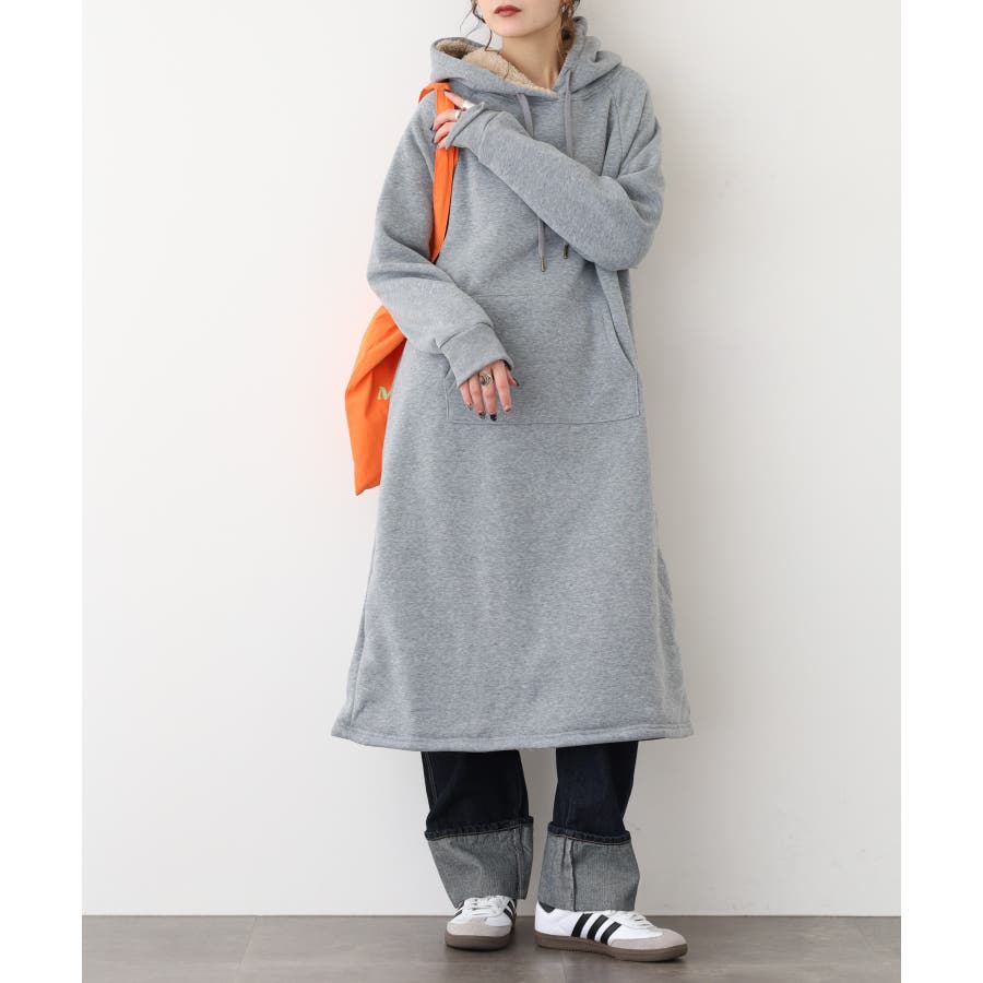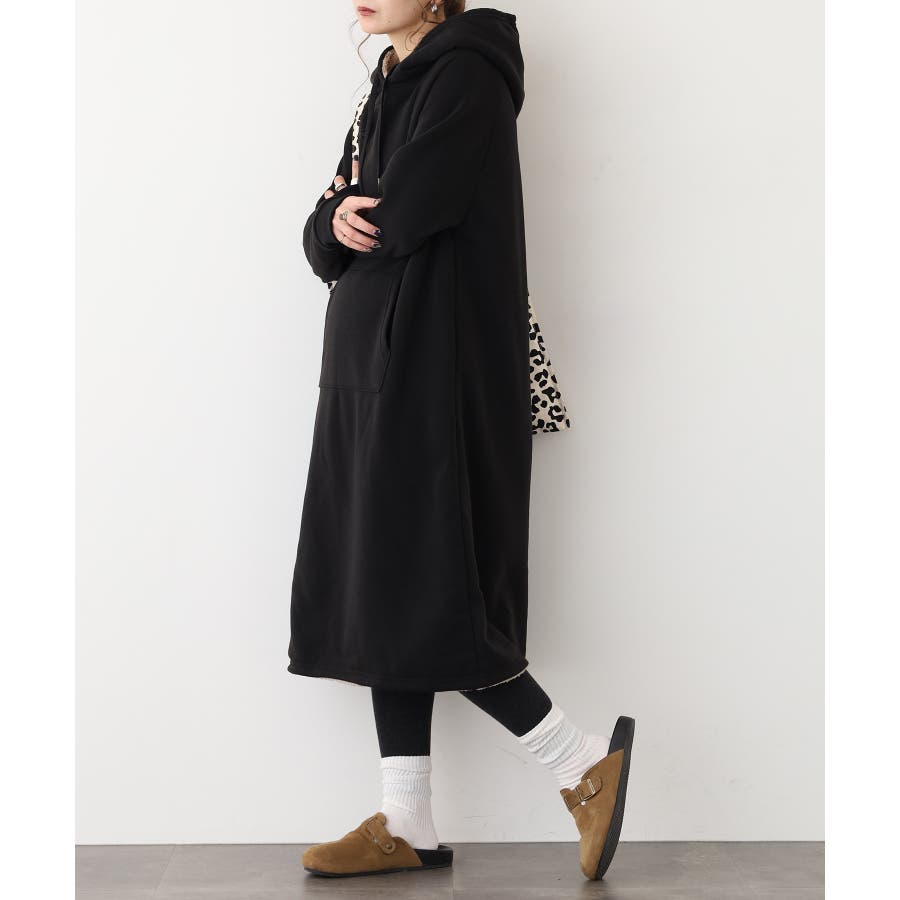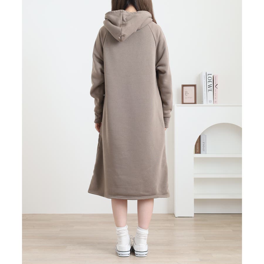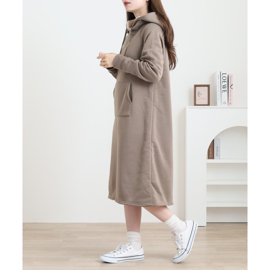 袖は裏起毛で着ぶくれしにくく、冬の一枚着としても重宝するパーカーワンピースです。