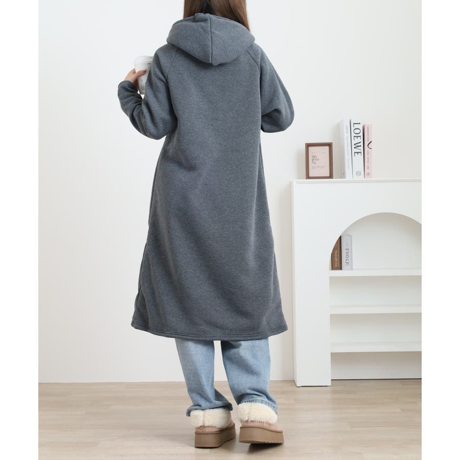 裏ボア仕様で全身をふわもこに包み込み、ロング丈でしっかり防寒。