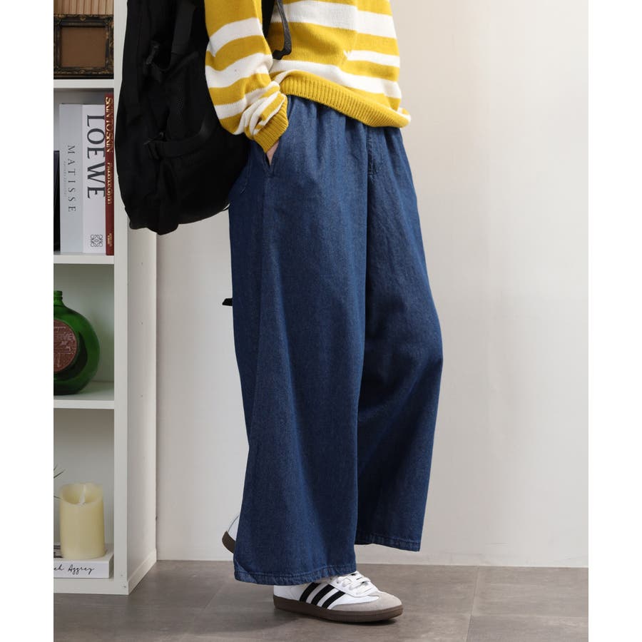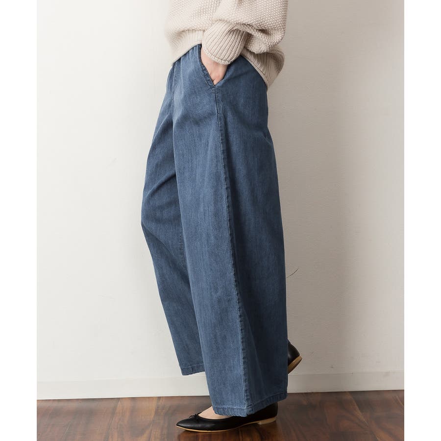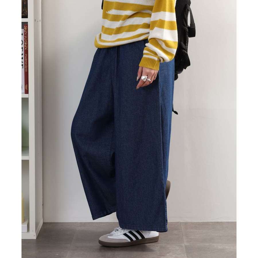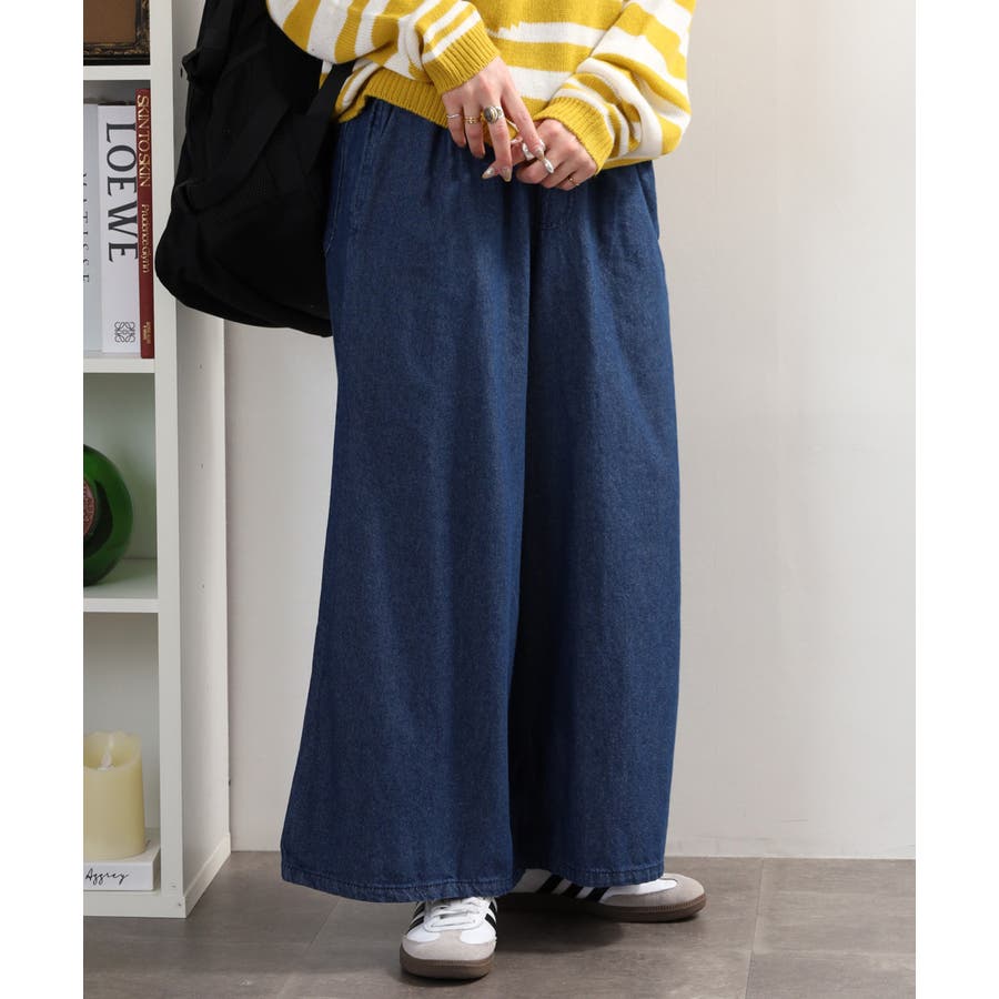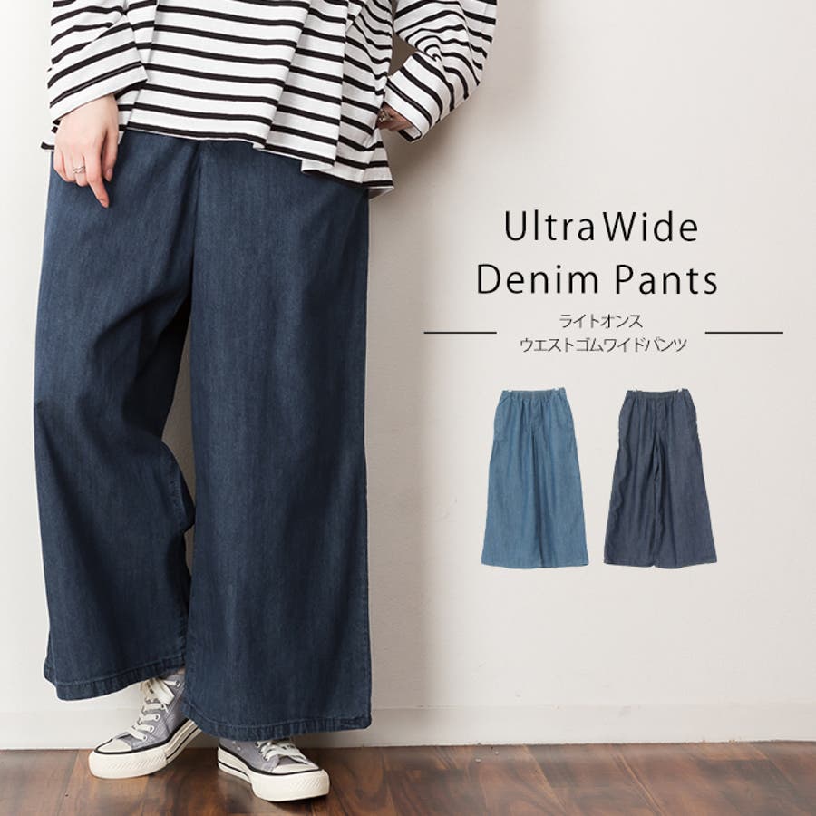 ウエストゴムで楽ちんなのにこなれたおしゃれ感のあるデニムワイドパンツ♪綿100%のライトデニムなので軽やかで夏でもはきやすい一枚です!ポケットは両サイドと後ろにも一つ付いていてオシャレなだけでなく使いやすい♪ウエストインしてベルトをつけても良し!トップスをインせずして着ても良し!あわせやすいのでヘビロテ間違いなしです!