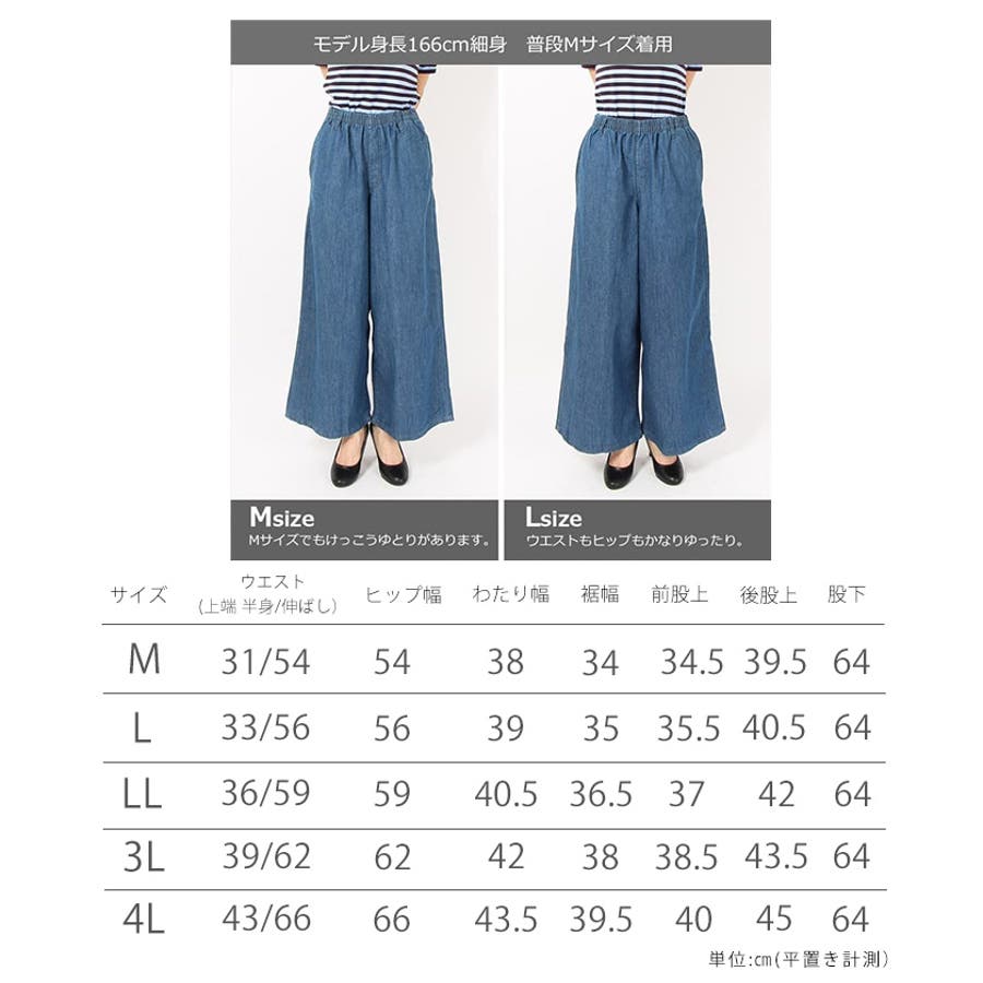 L:ウエスト約68 ヒップ約108 総丈約95 股下約 64 わたり幅約36 裾幅約35