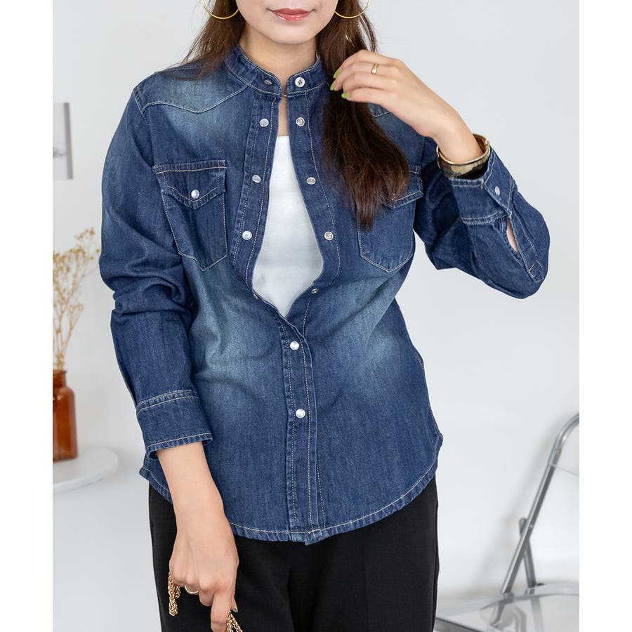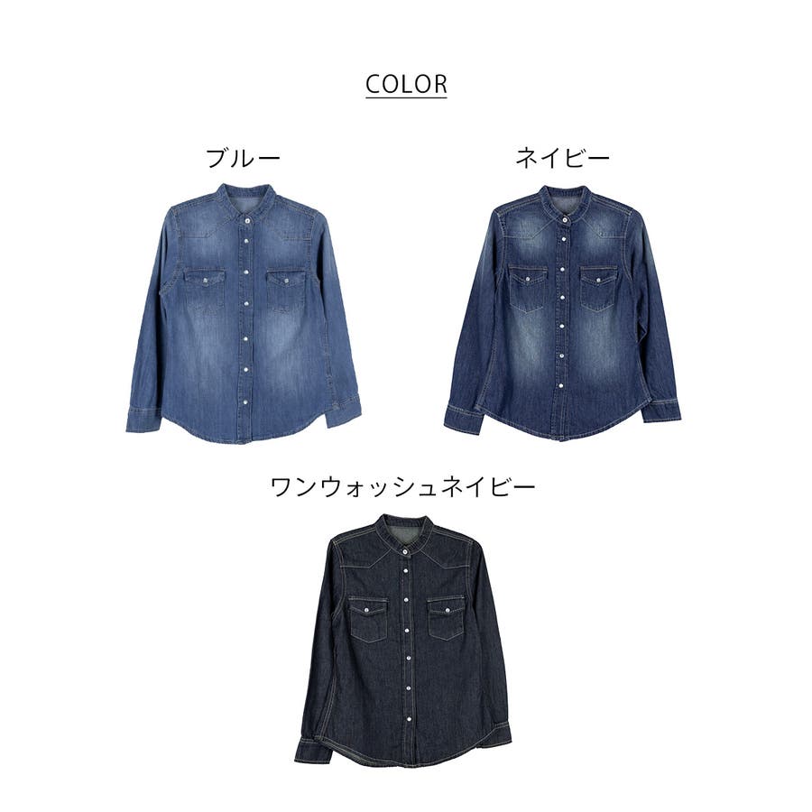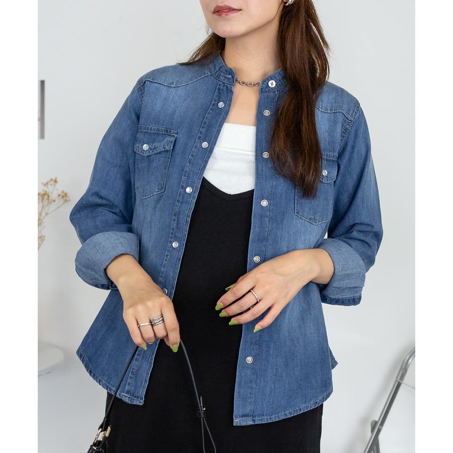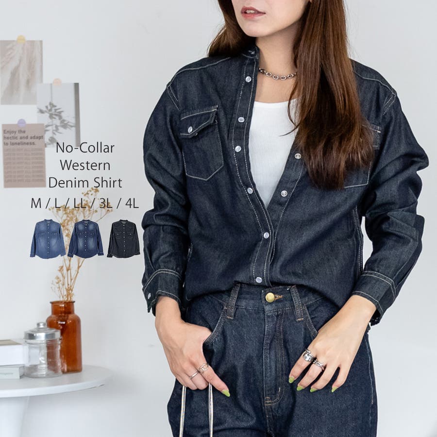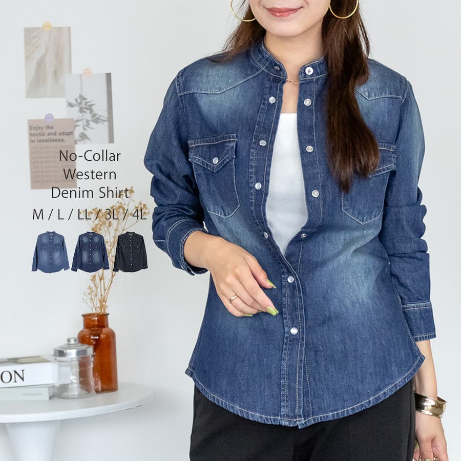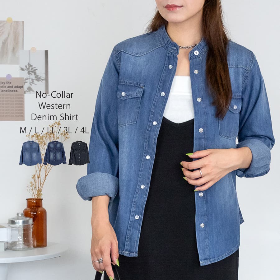 ノーカラーウエスタンデニムシャツ レディース 大きいサイズ レビュー特典あり