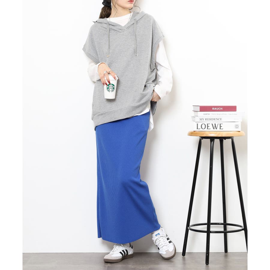 ノースリーブパーカーにナロースカートを合わせて、縦ラインを強調したすっきりシルエットに。