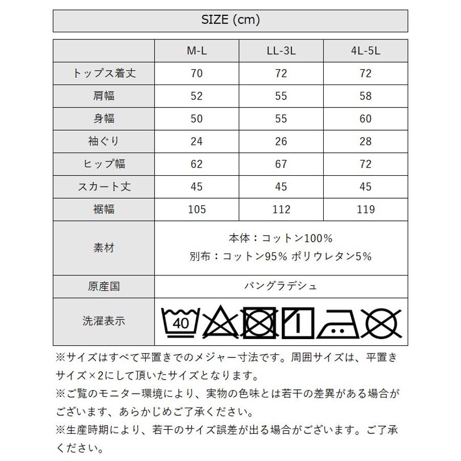 LL-3Lサイズ:着丈72cm、身幅55cm、肩幅55cm、スカート丈45cm、裾幅112cm、そで丈6cm