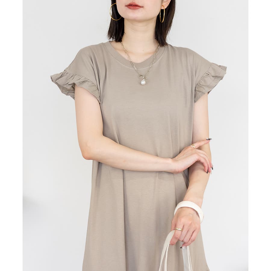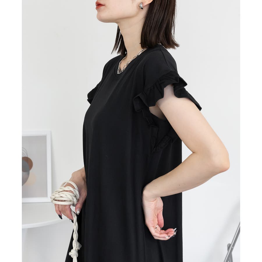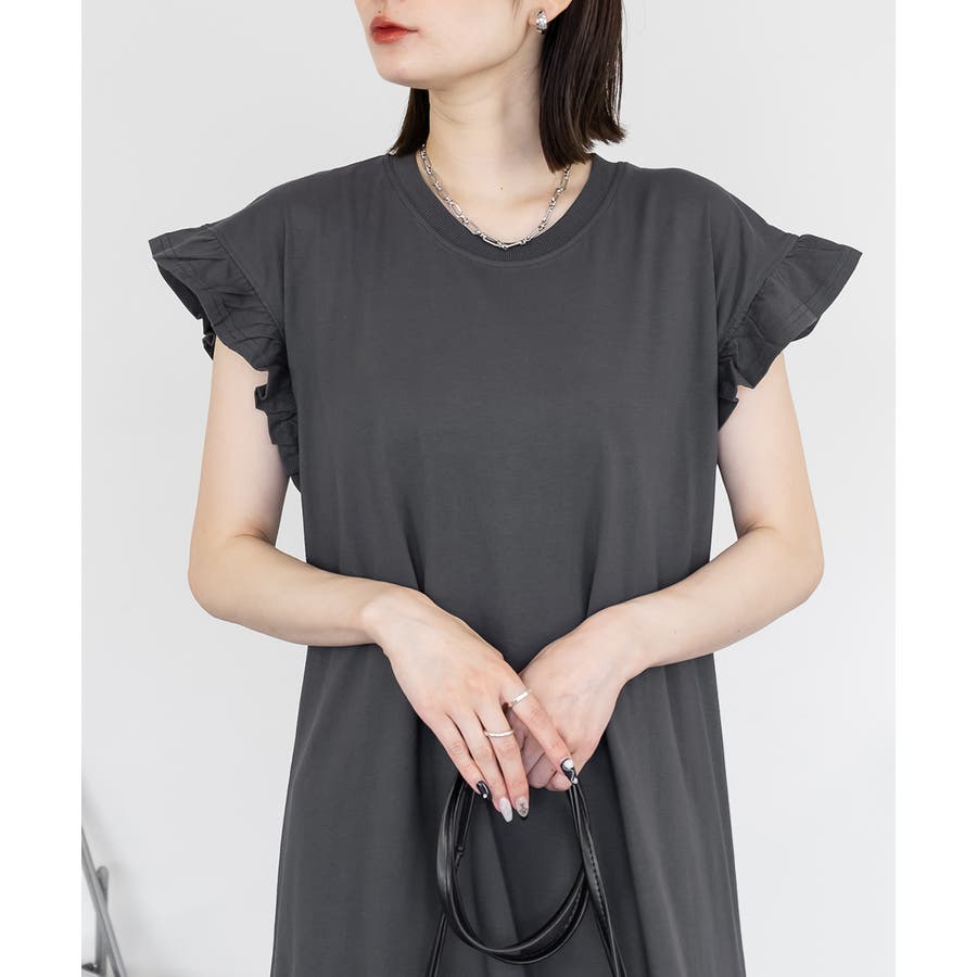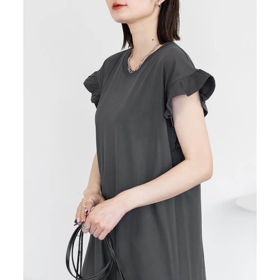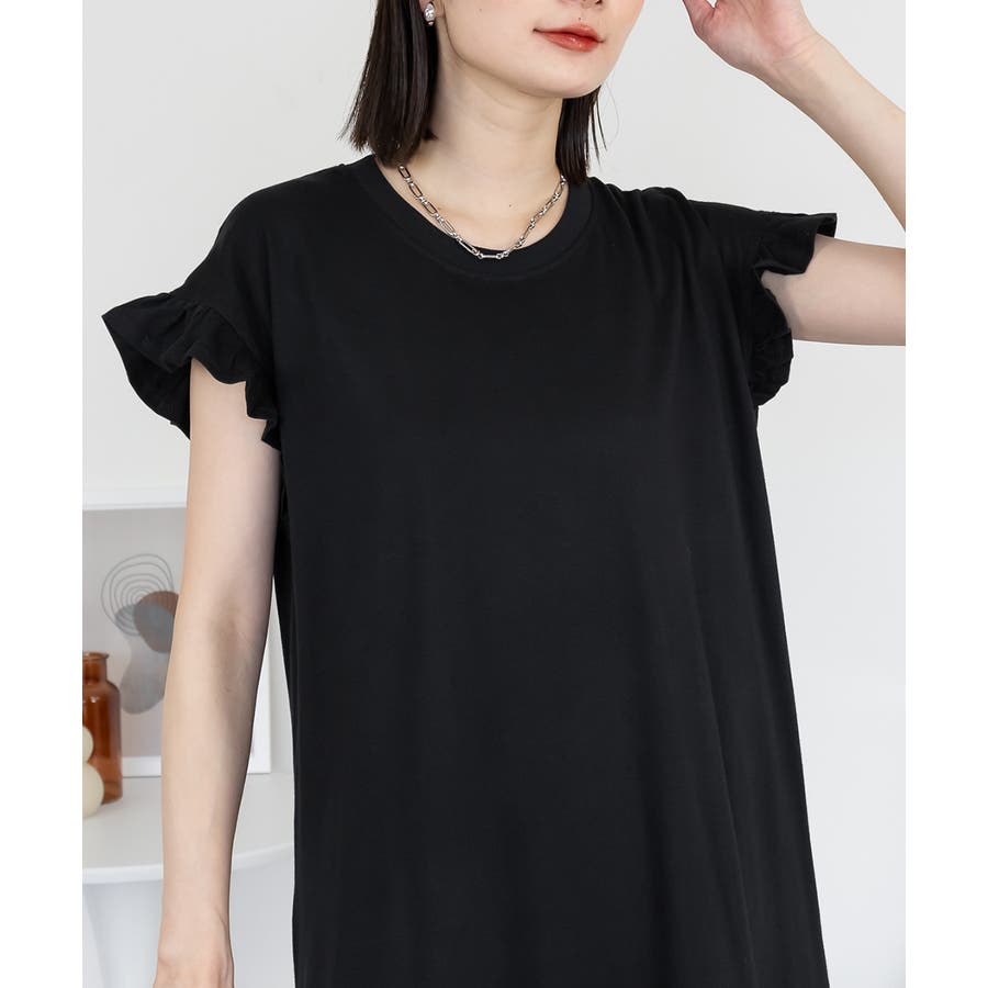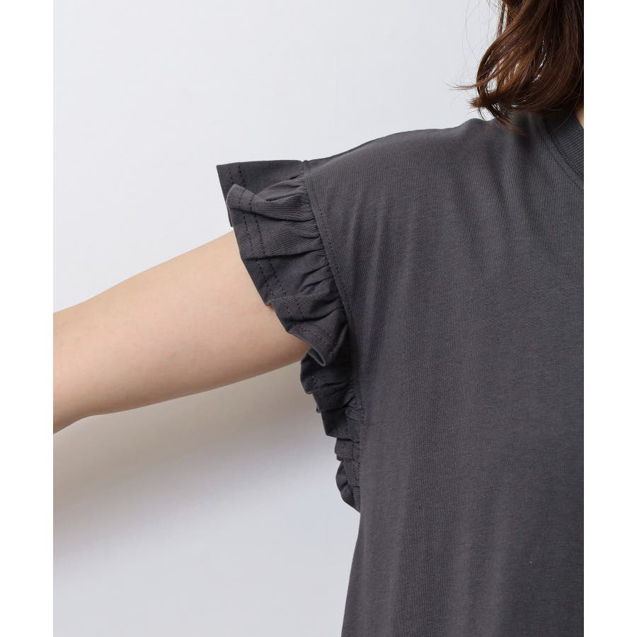 袖部分のフレアデザインが女性らしさを引き立て、シンプルなシルエットに華やかさをプラス。
