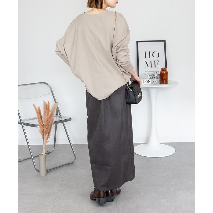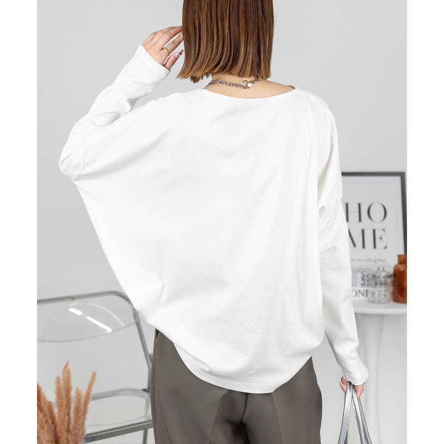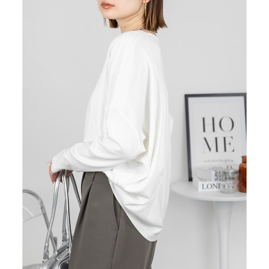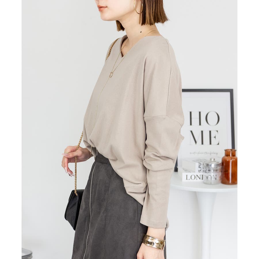 体のラインを拾いにくいドルマンスリーブが自然に体形をカバーし、シンプルながらもこなれた印象に。