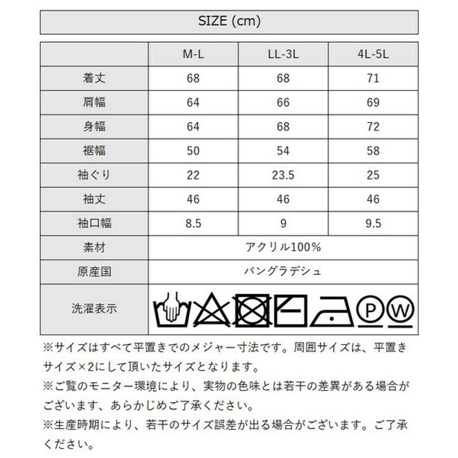 [LL-3Lサイズ]着丈:68cm、身幅:68cm、肩幅:66cm、袖幅:22.5cm、袖丈:46cm、袖口幅:9cm、裾幅:54cm