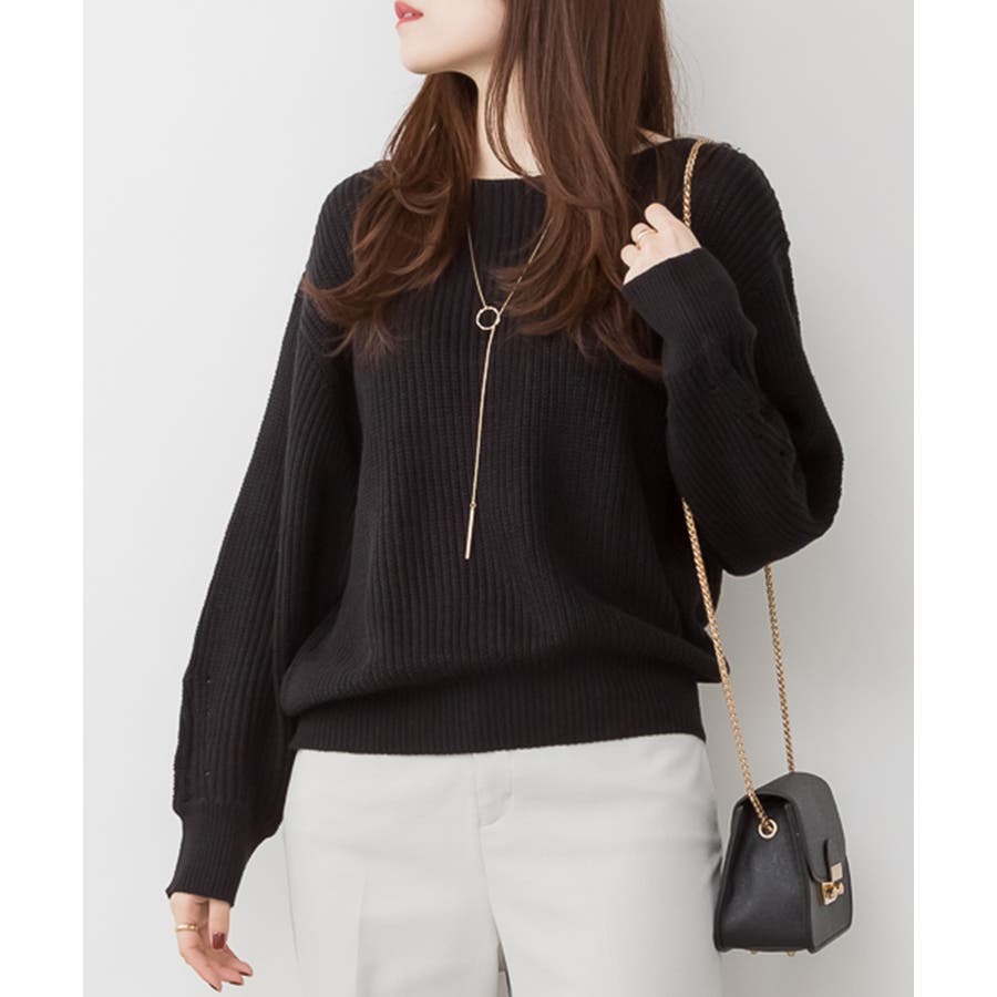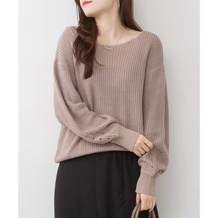 広めのネックラインが洗練された印象を与え、畔編みの独特なテクスチャーがスタイリッシュな雰囲気を演出します。