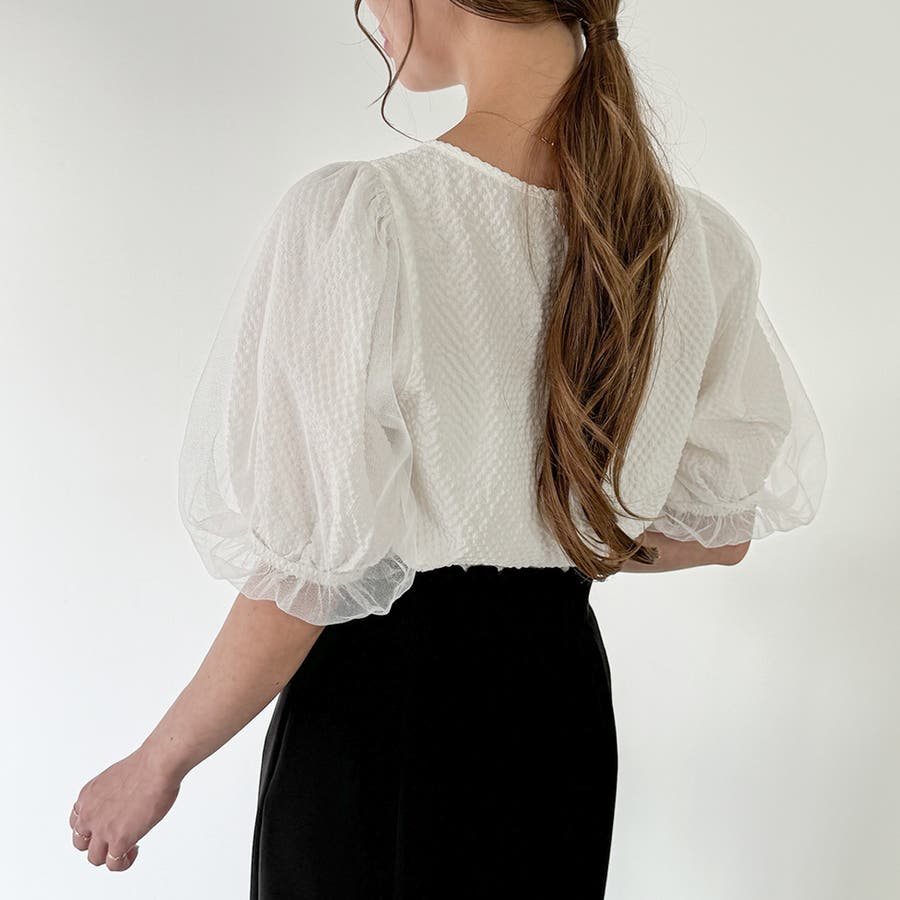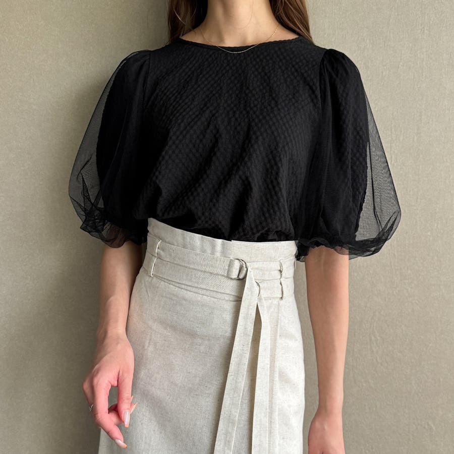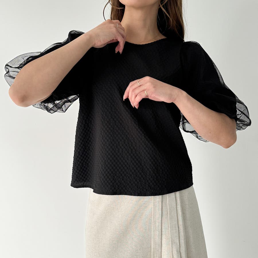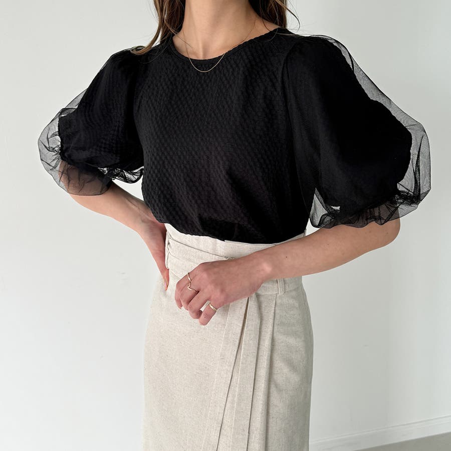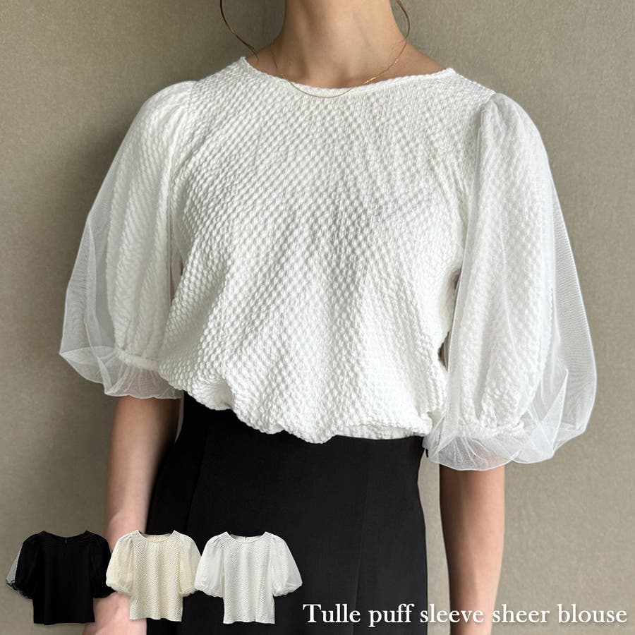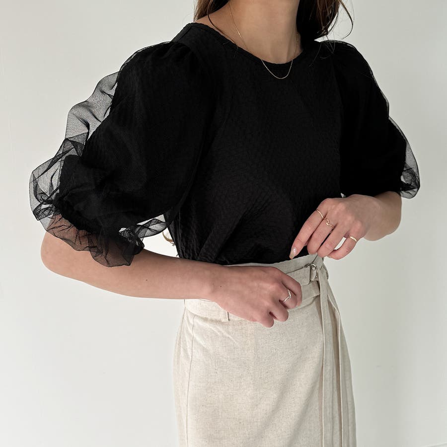 【ブラック】チュールパフスリーブシアーブラウス