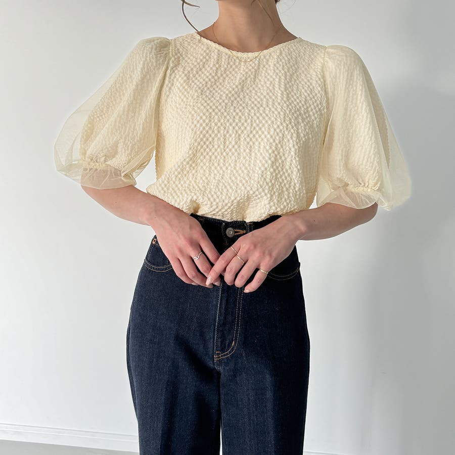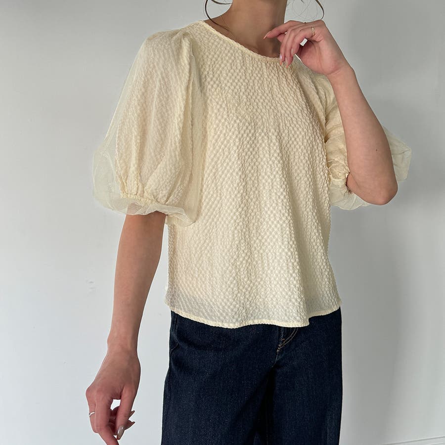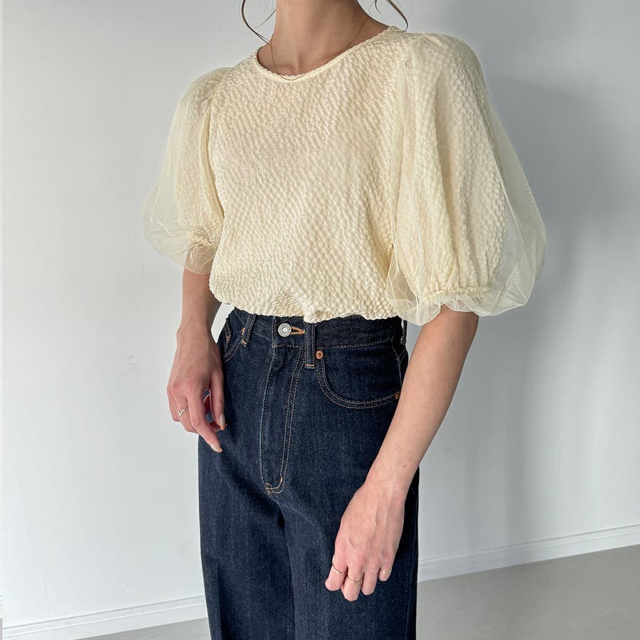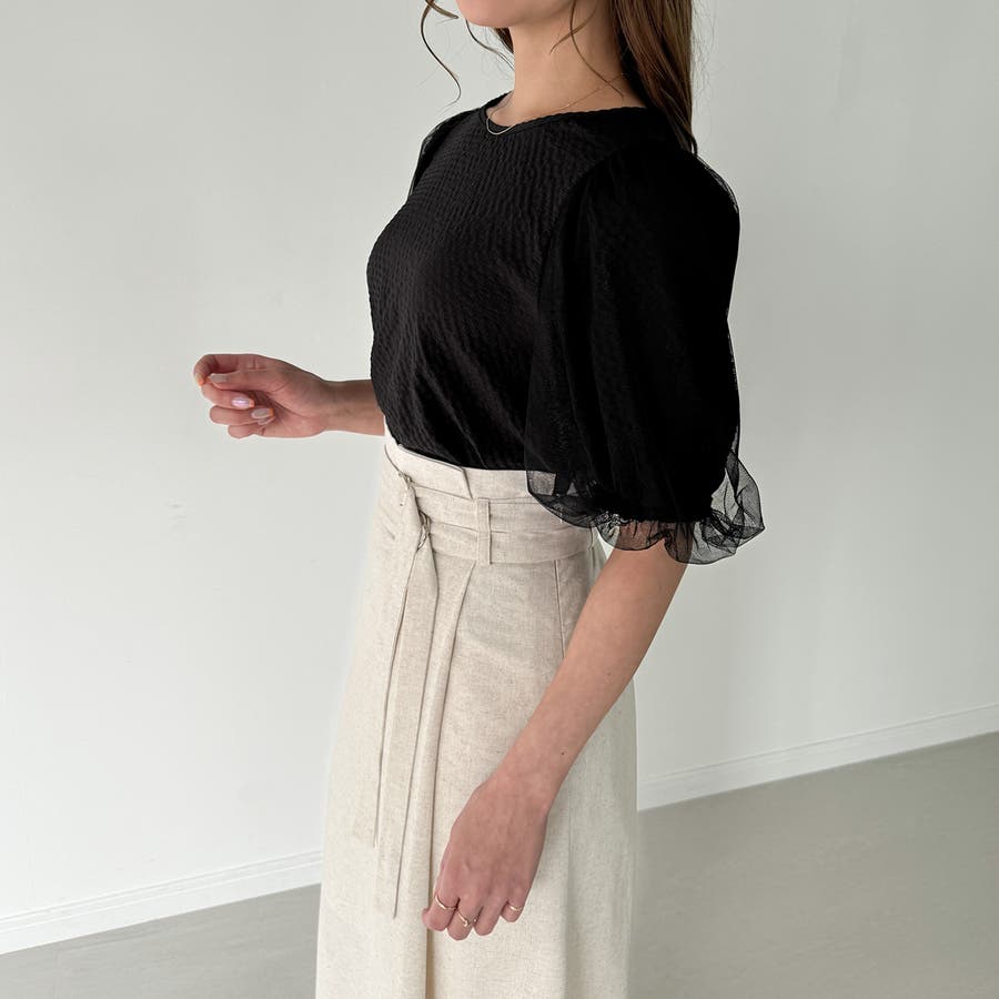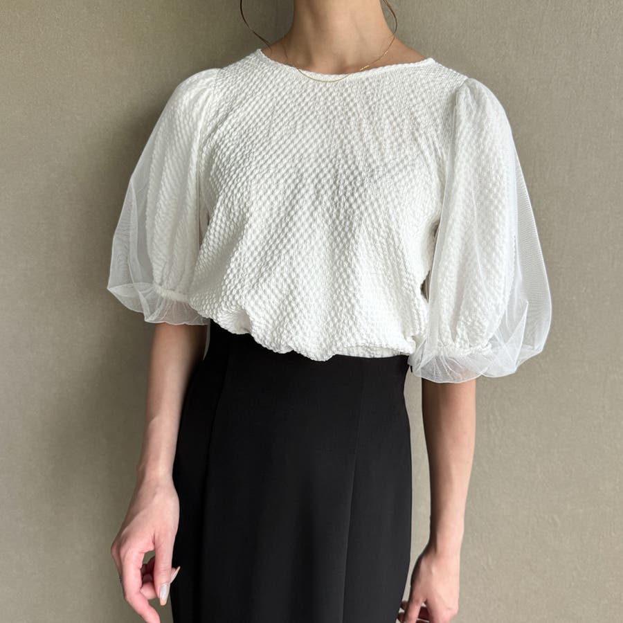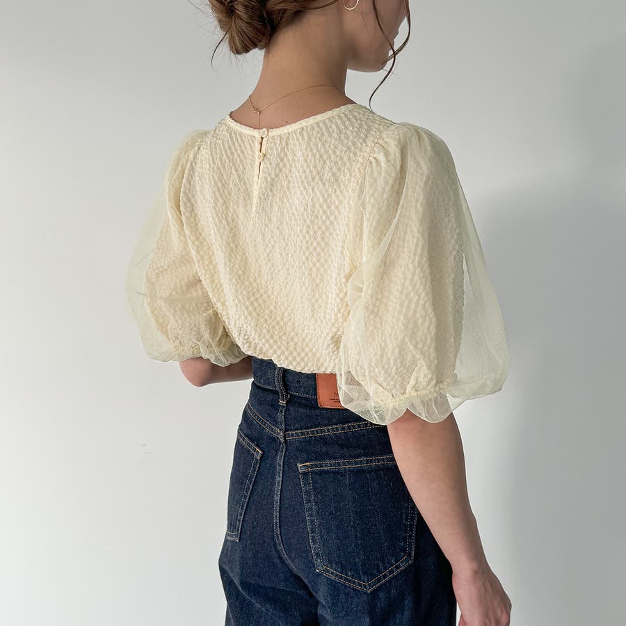 【ブラック】チュールパフスリーブシアーブラウス