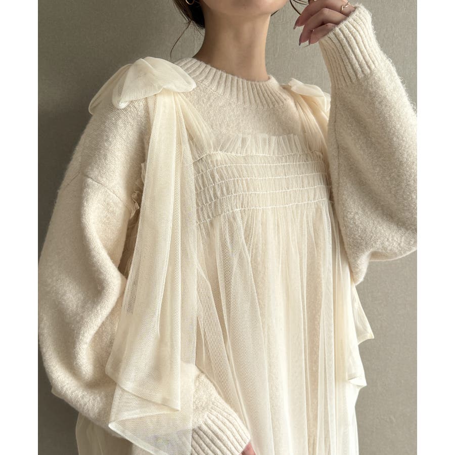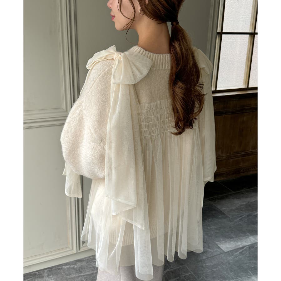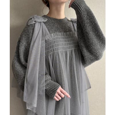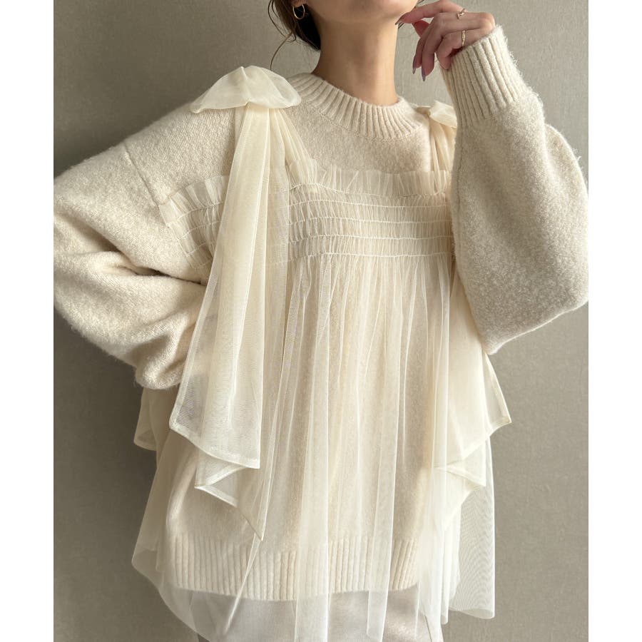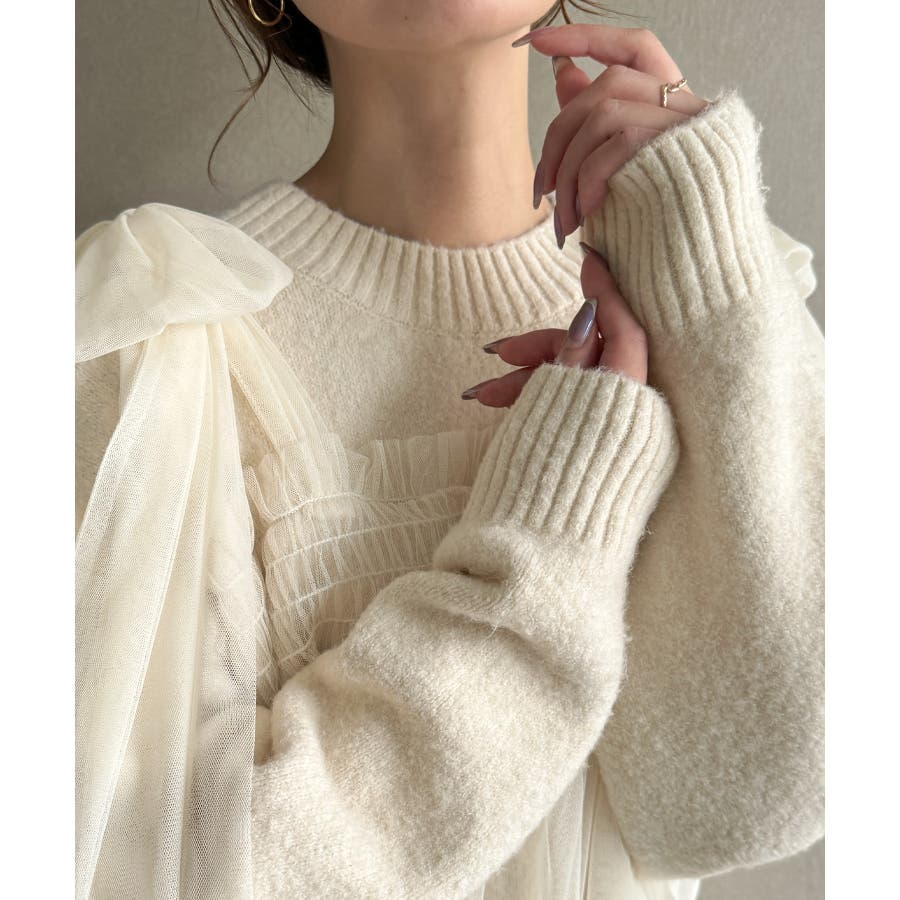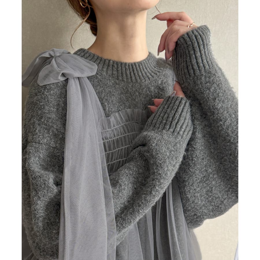 肩リボンチュールドッキングニットプルオーバー