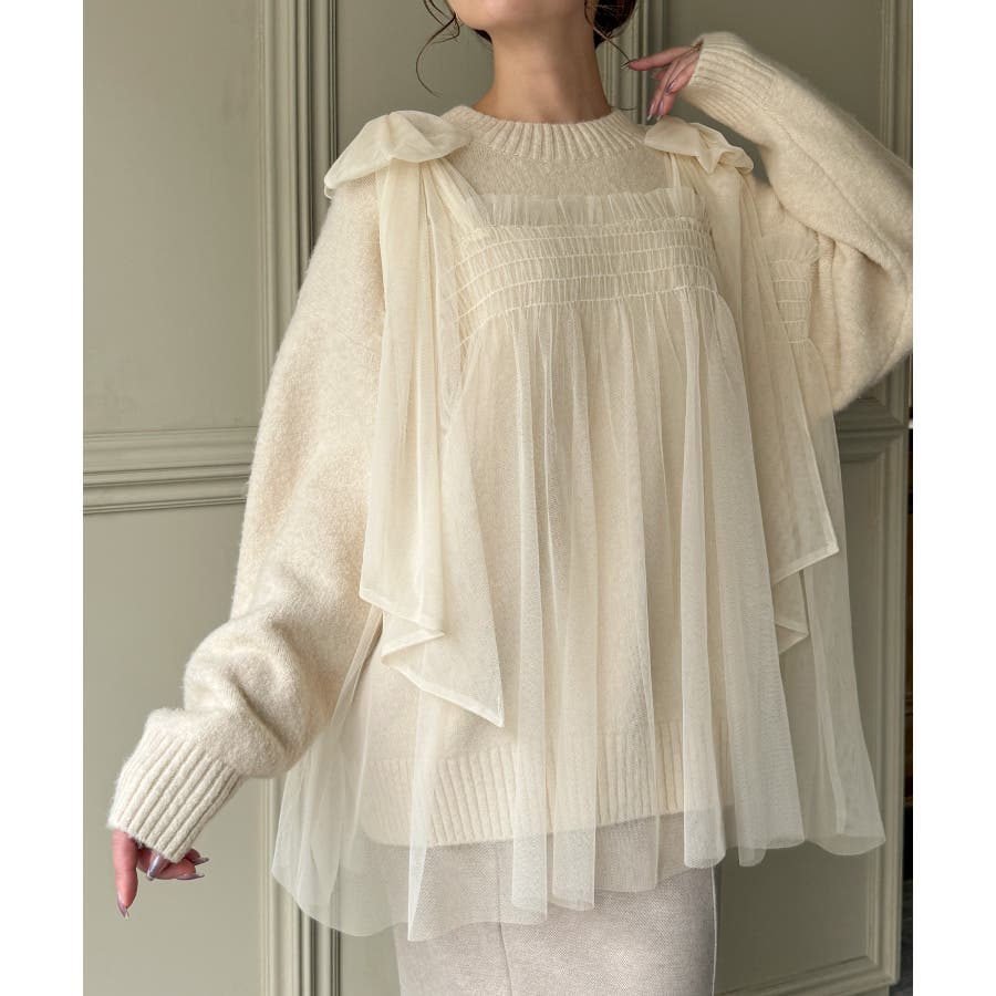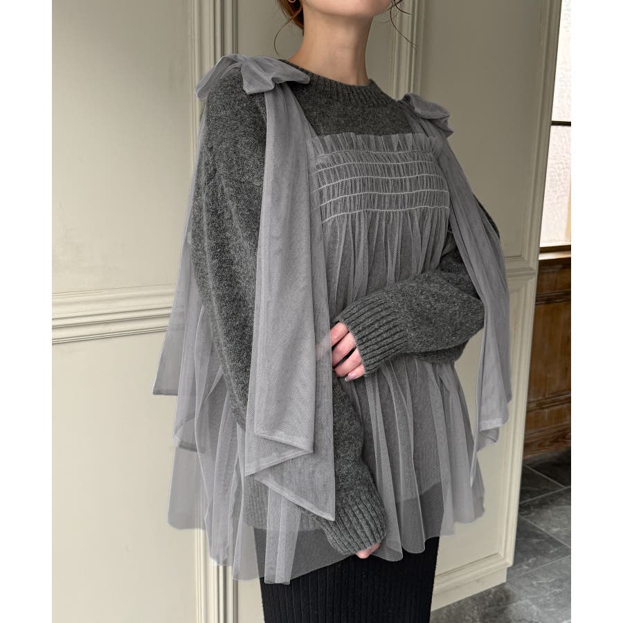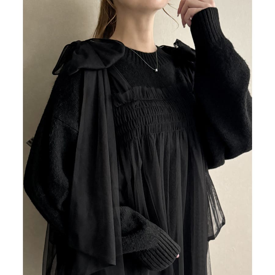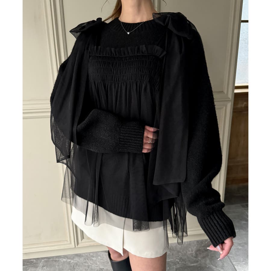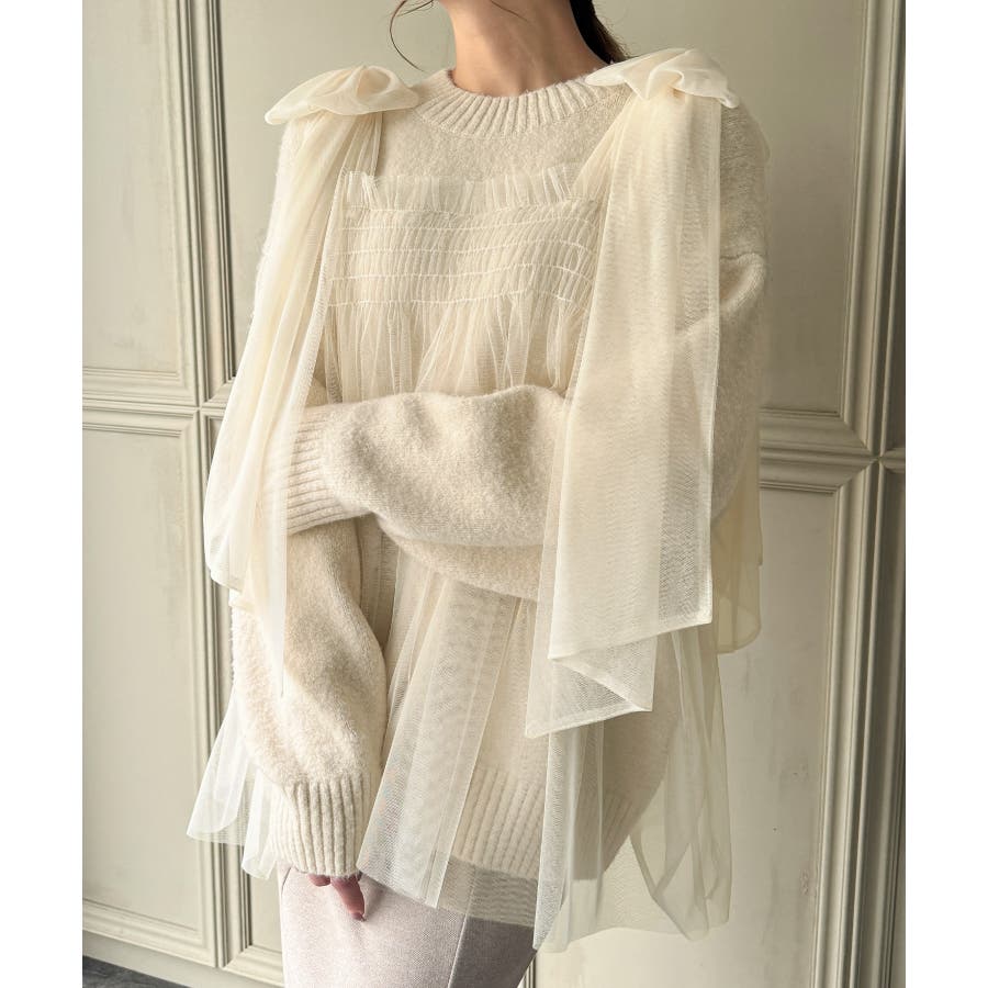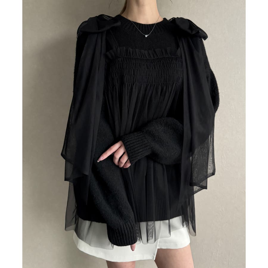 肩リボンチュールドッキングニットプルオーバー