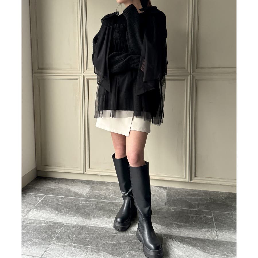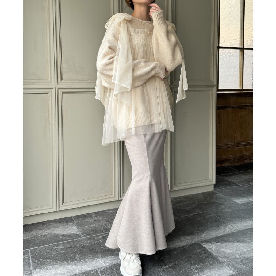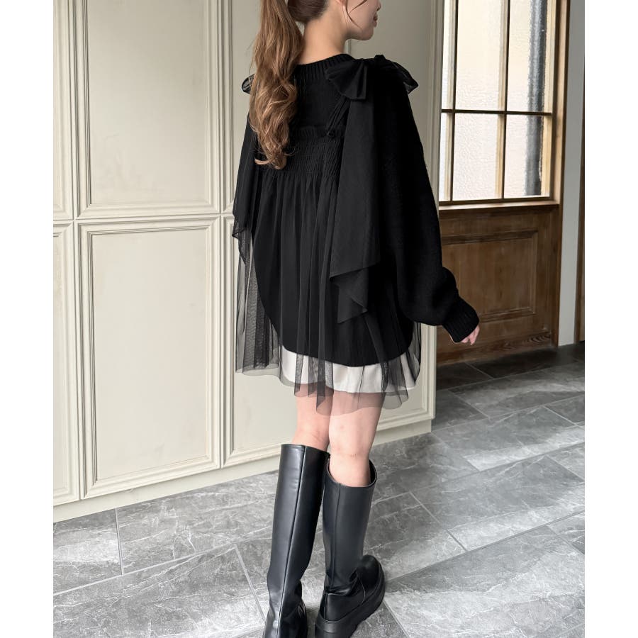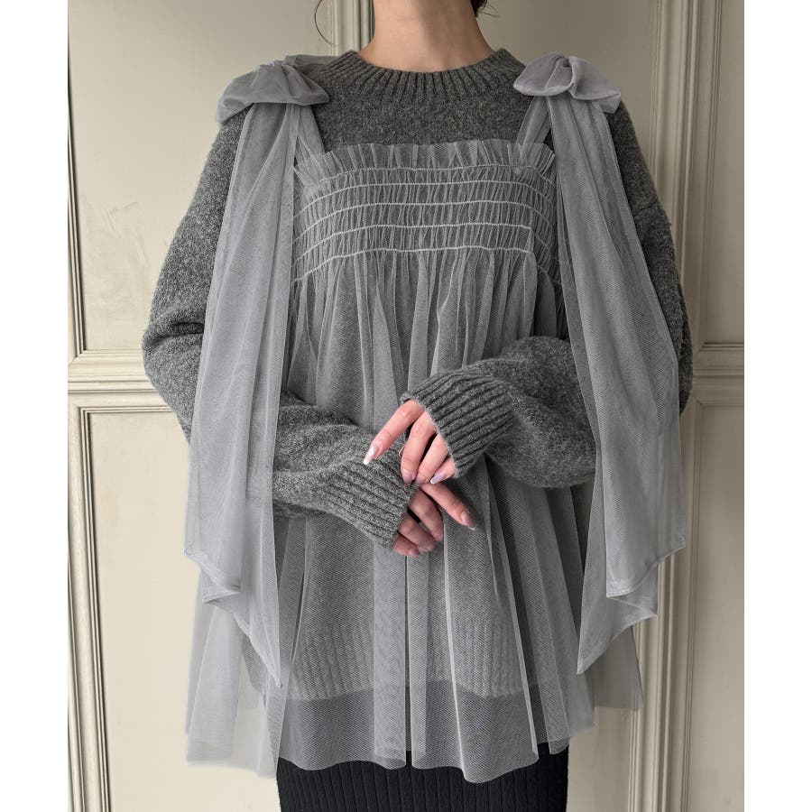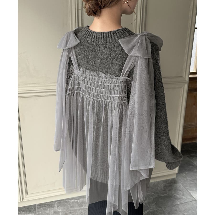 肩リボンチュールドッキングニットプルオーバー