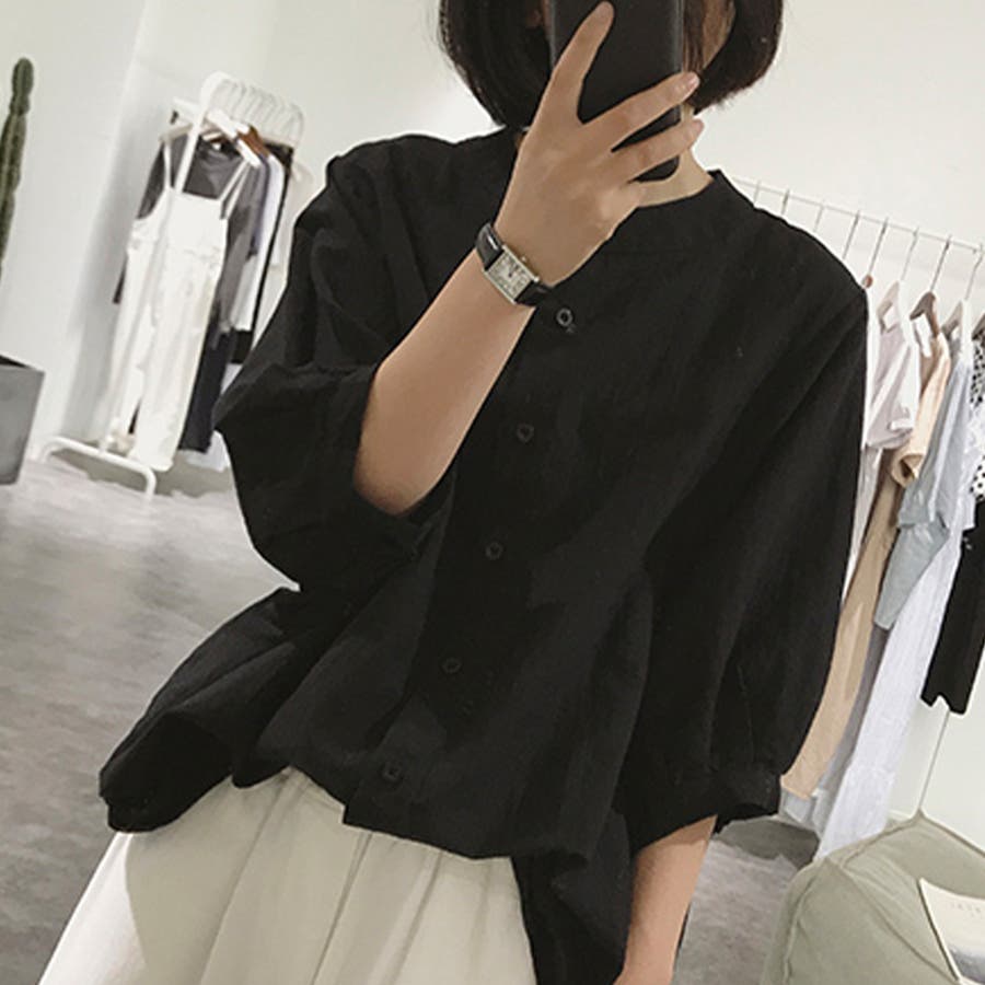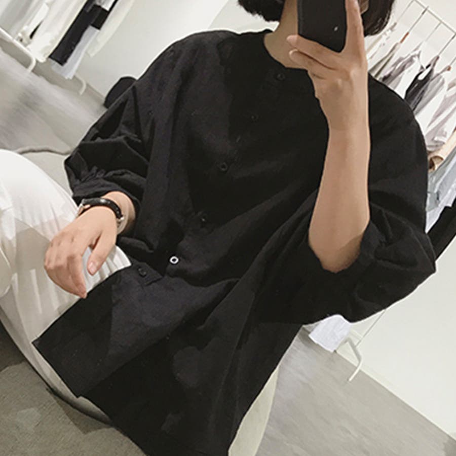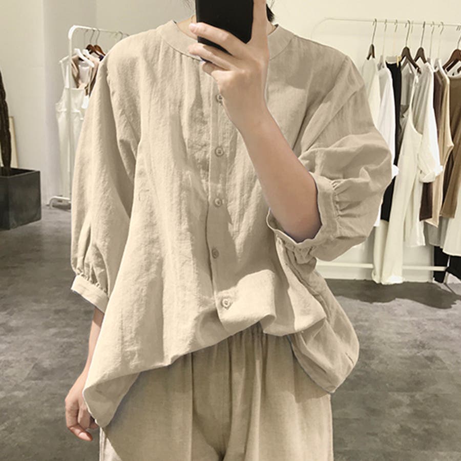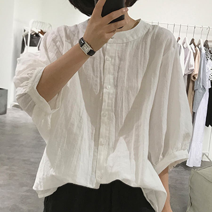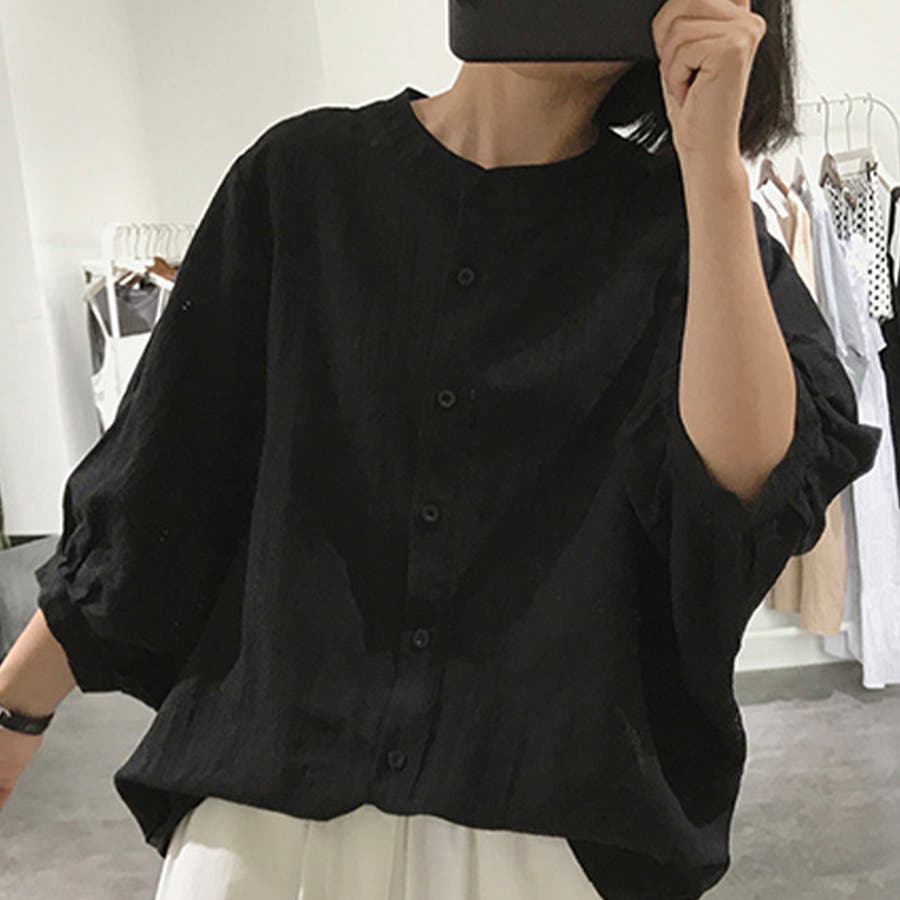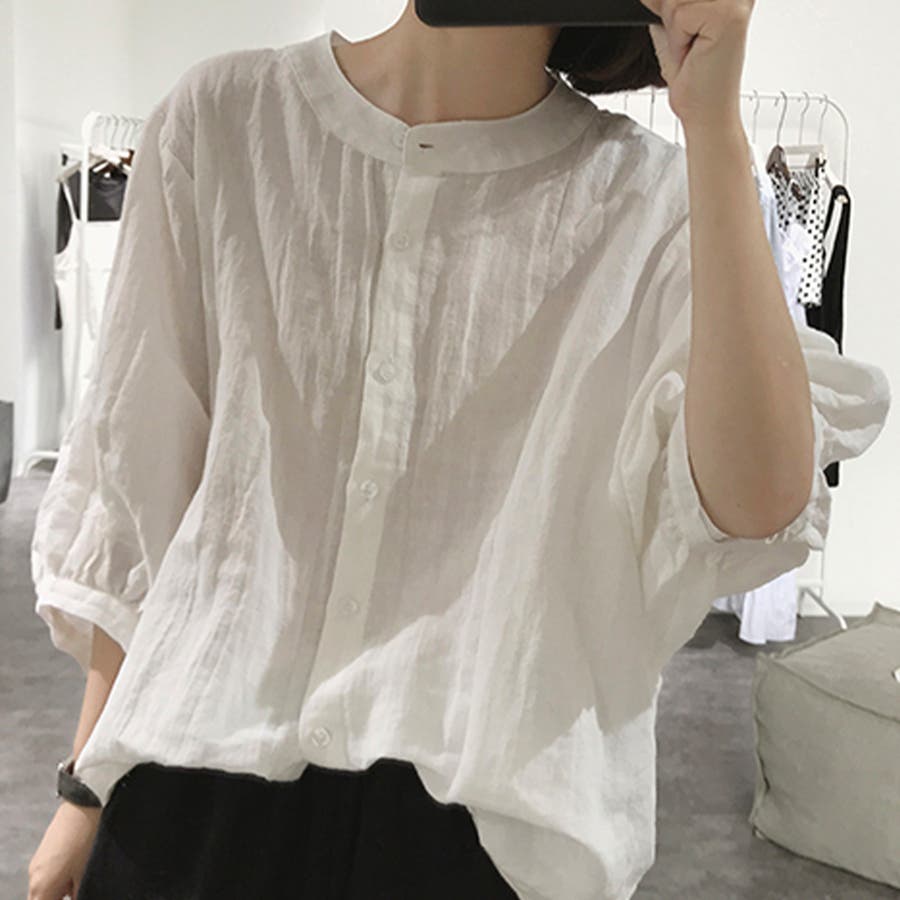 ノーカラーボリュームスリーブコットンシャツ 韓国ファッション