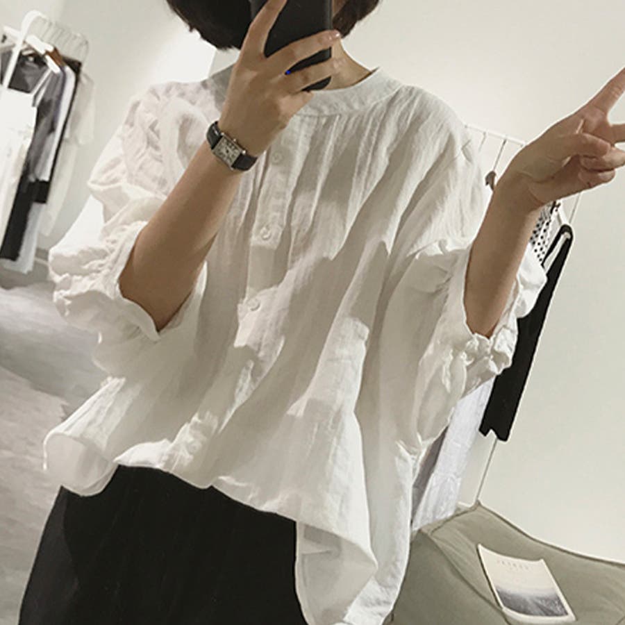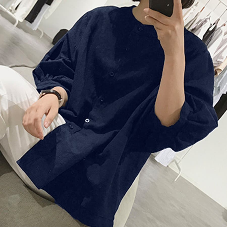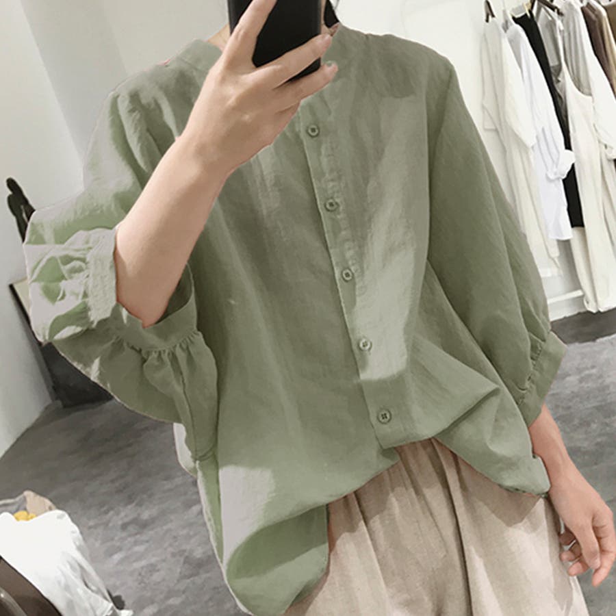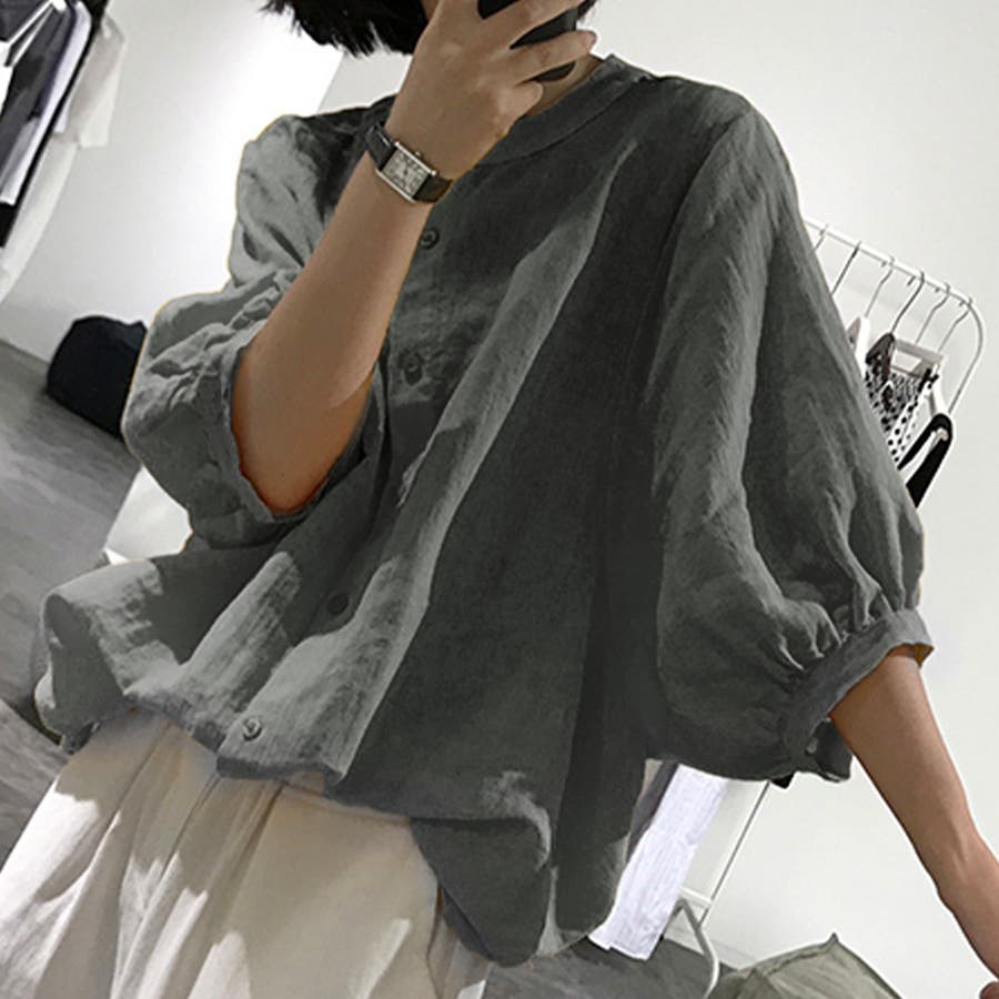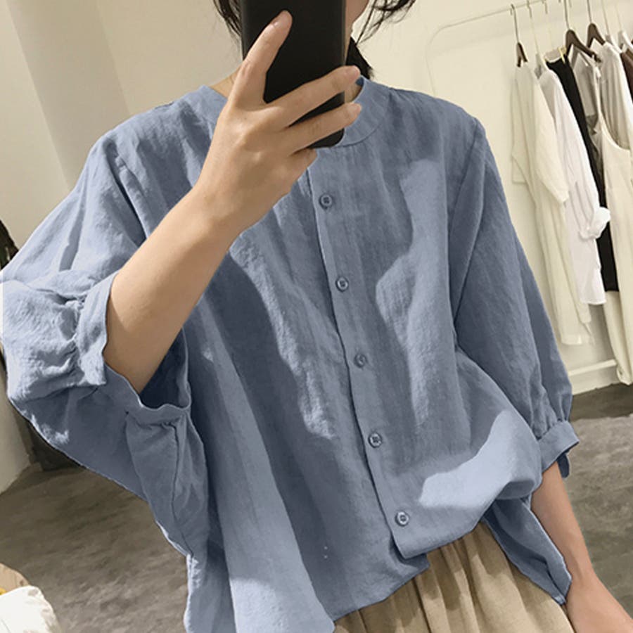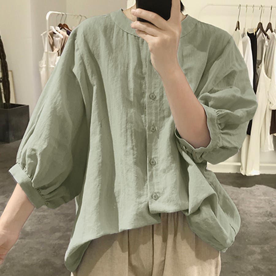 ノーカラーボリュームスリーブコットンシャツ 韓国ファッション