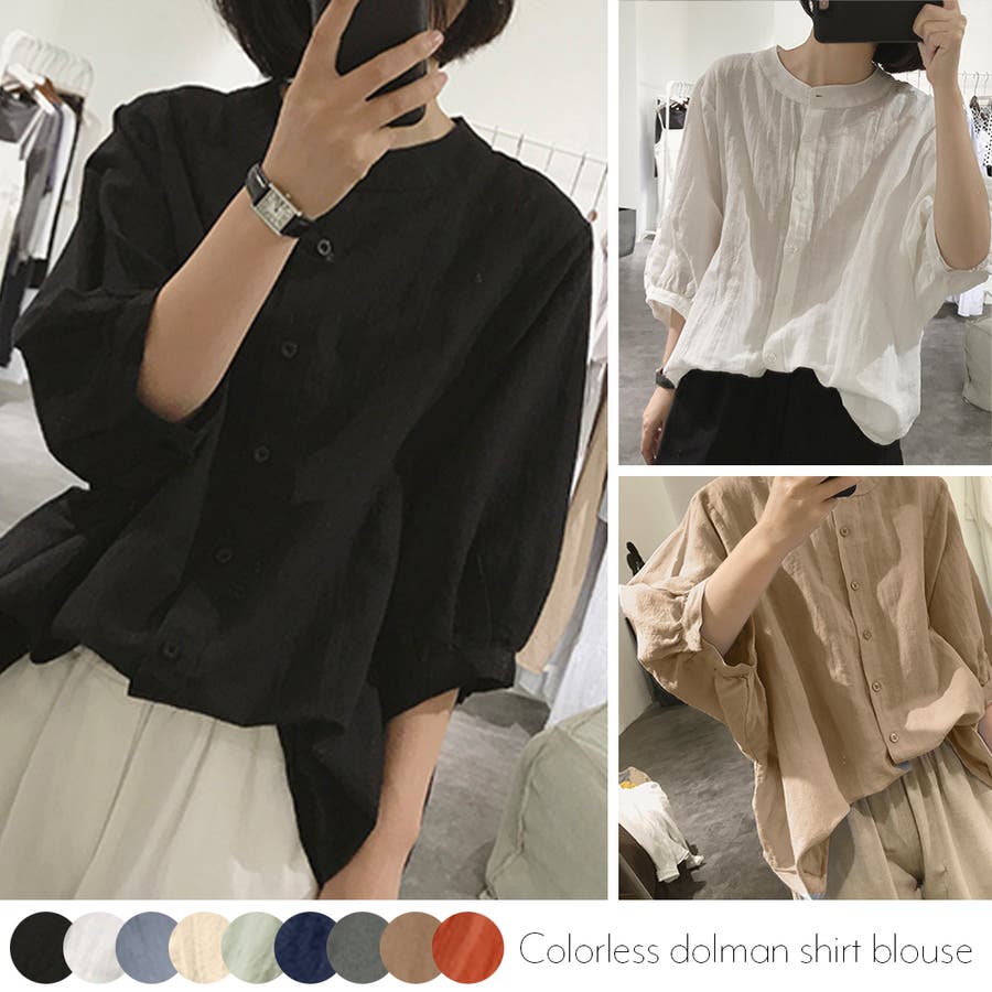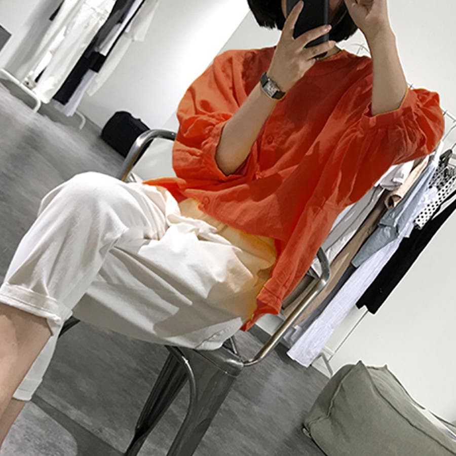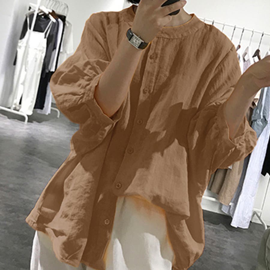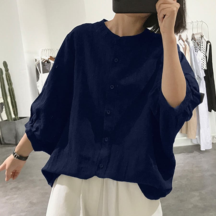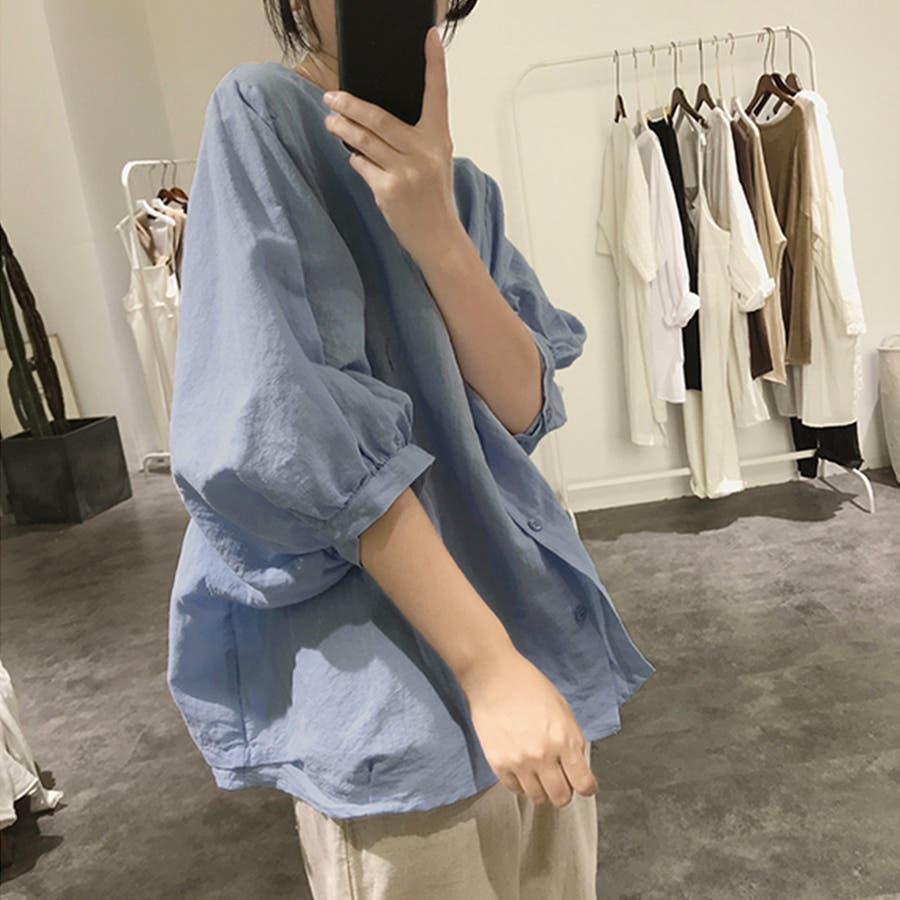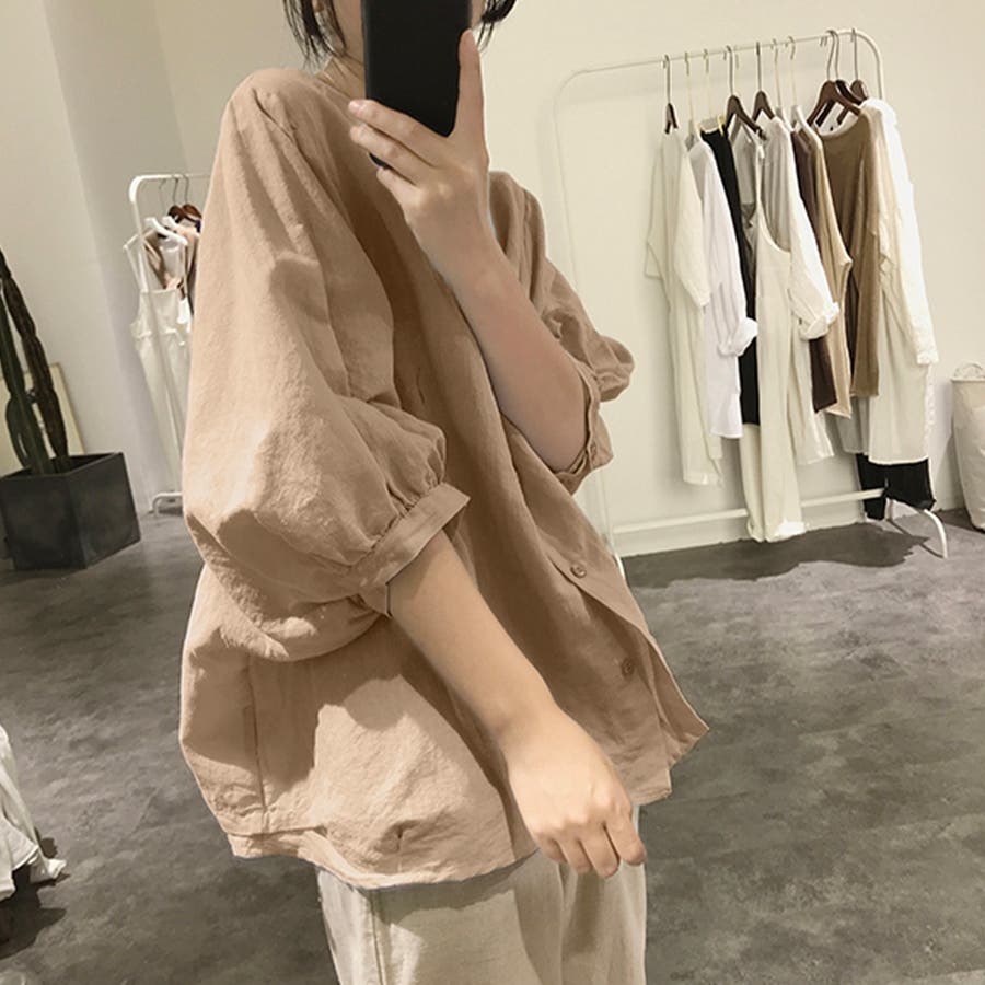 ノーカラーボリュームスリーブコットンシャツ 韓国ファッション