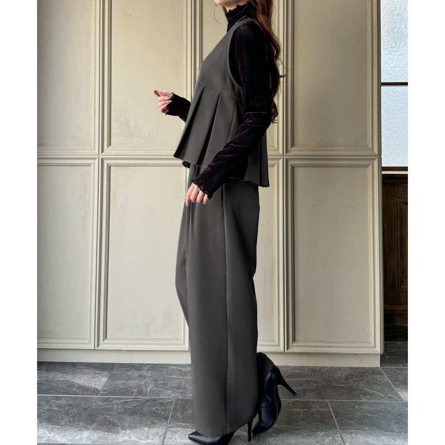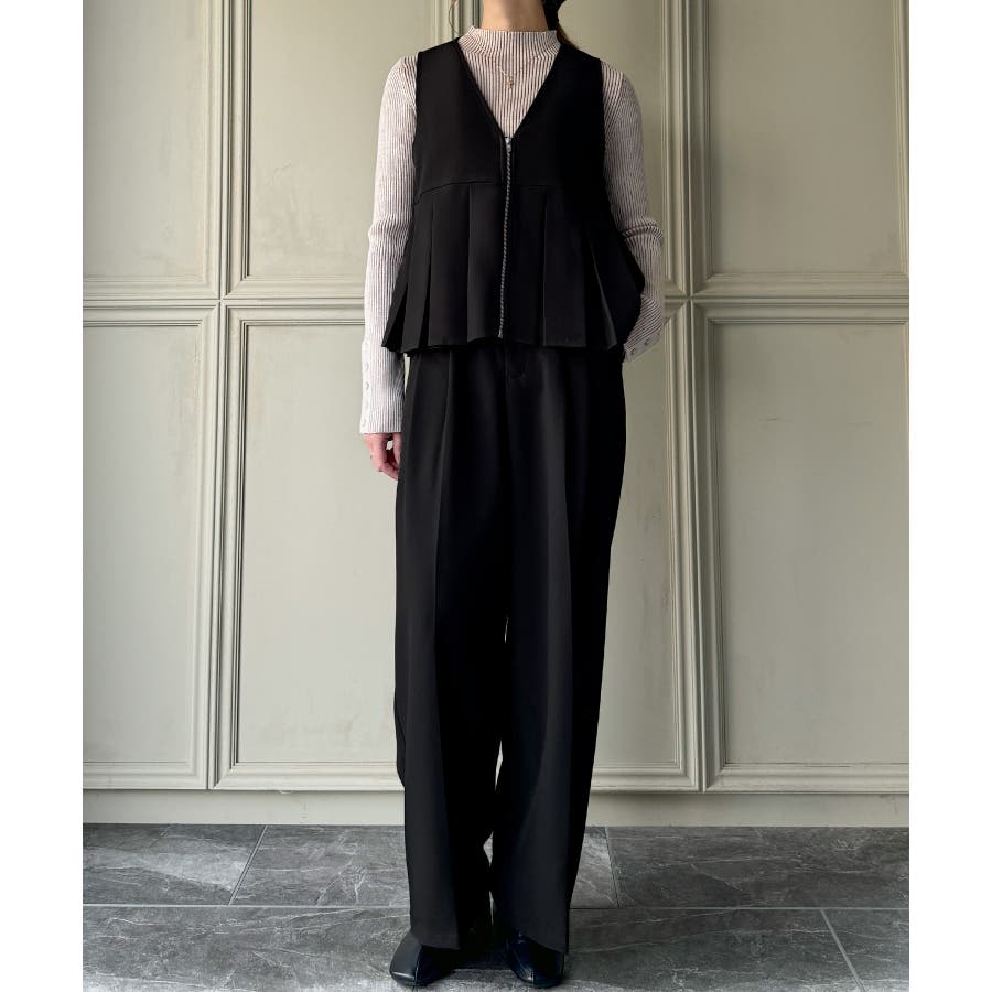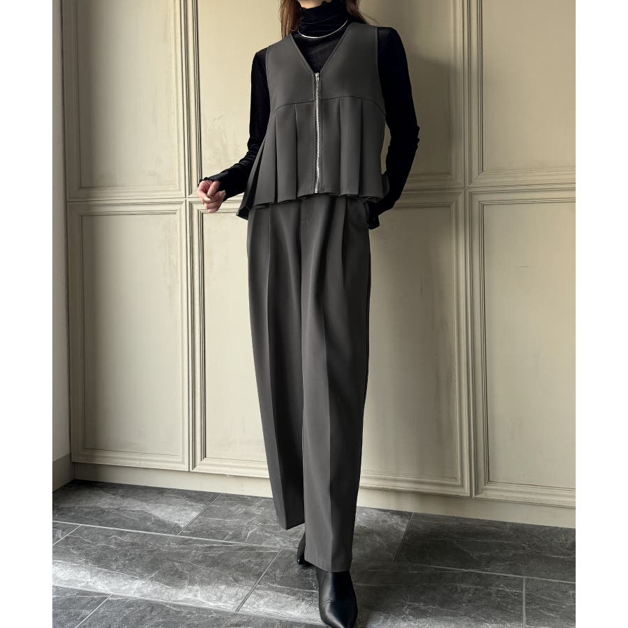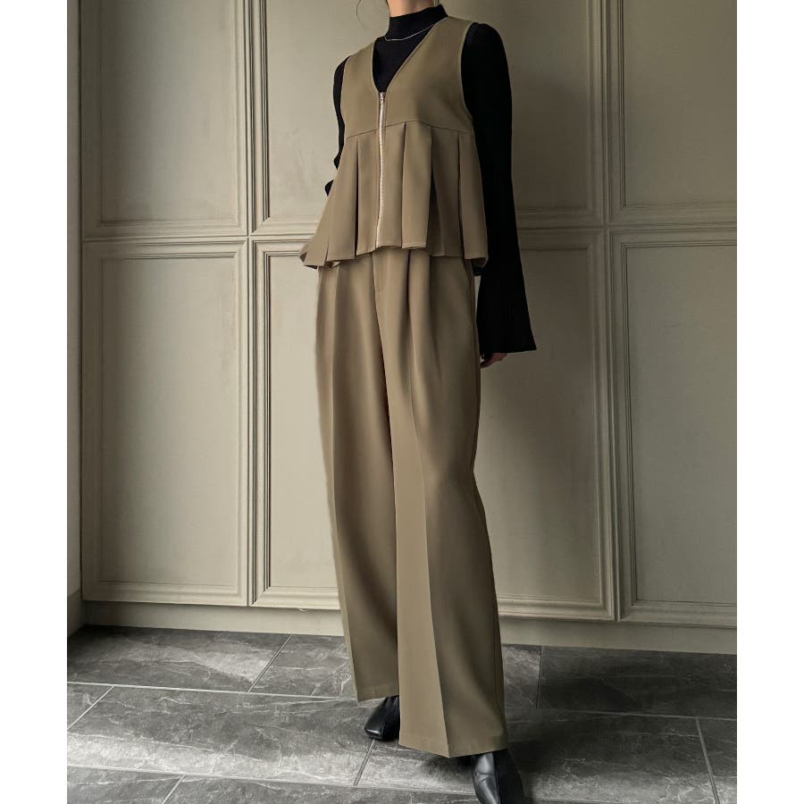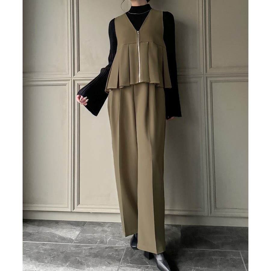 フロントジッププリーツペプラムジレ+タックワイドパンツセットアップ