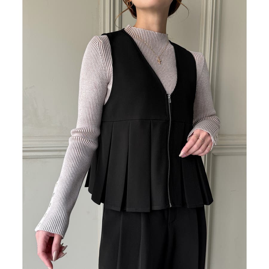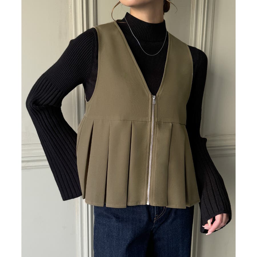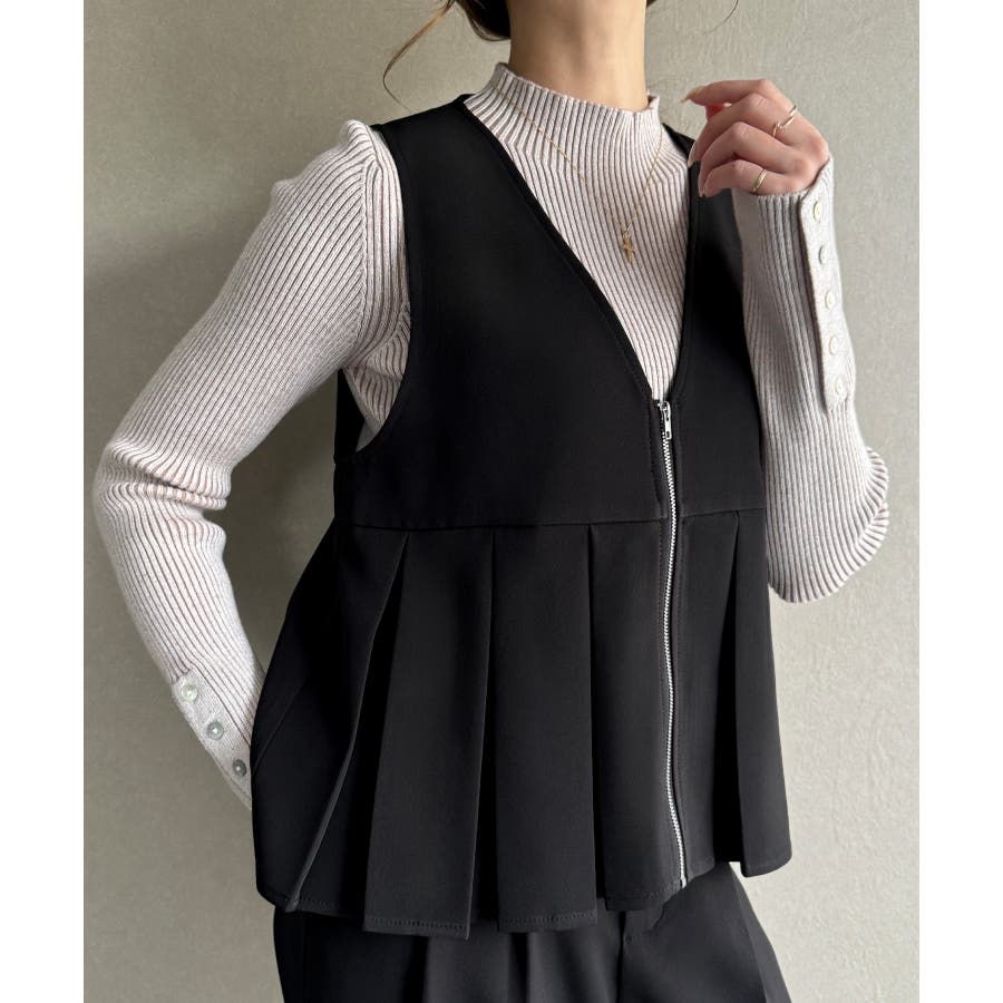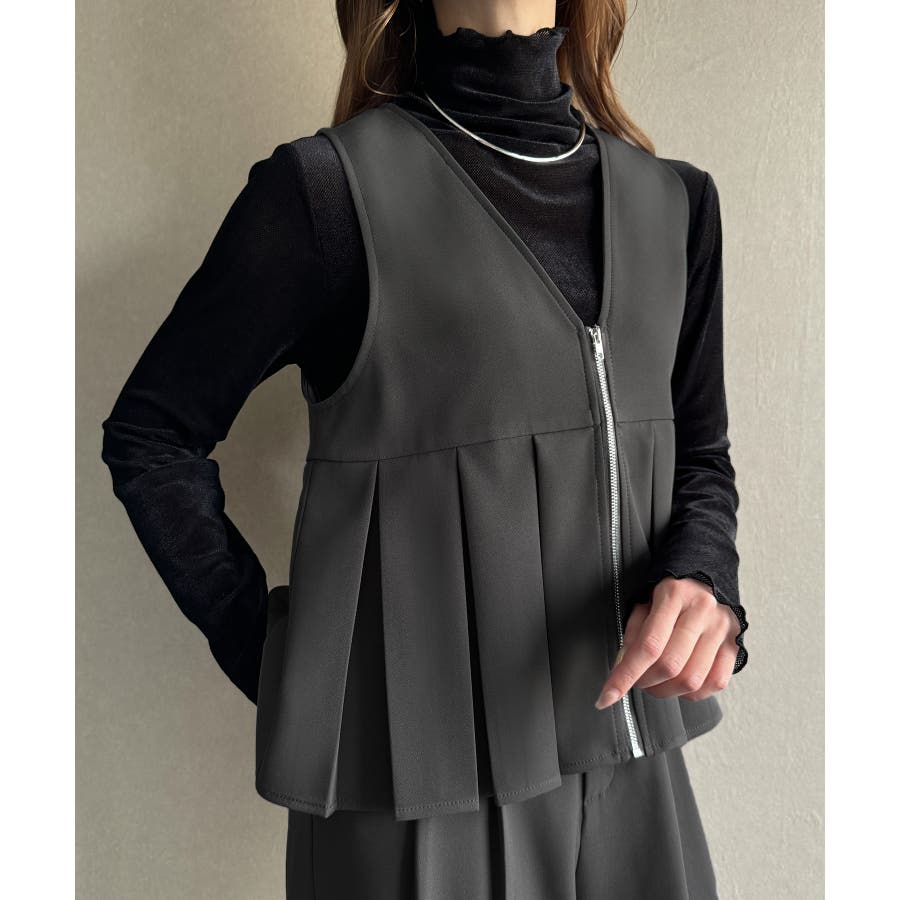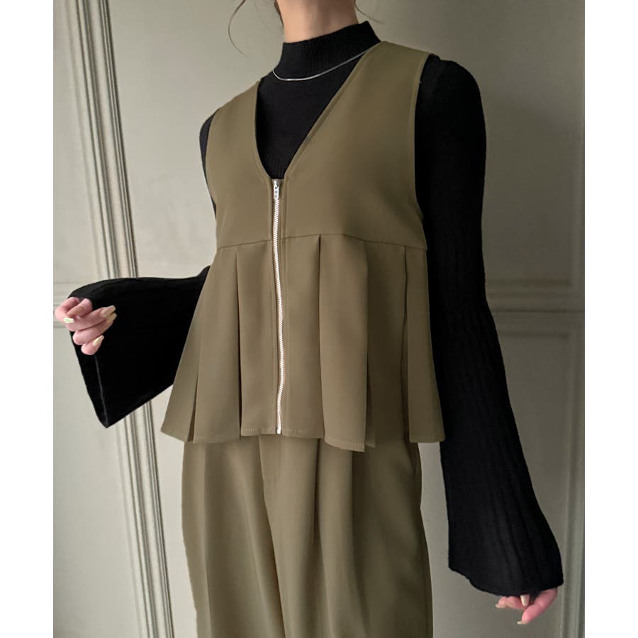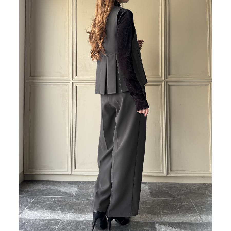 フロントジッププリーツペプラムジレ+タックワイドパンツセットアップ