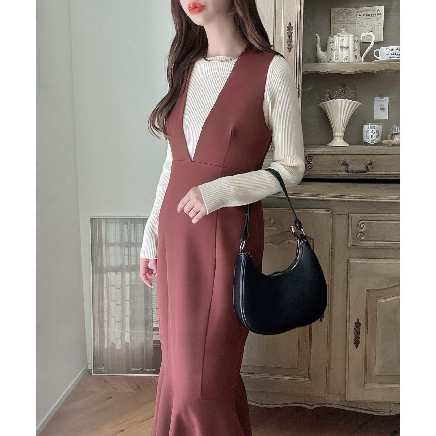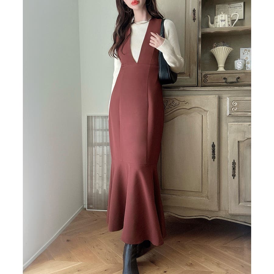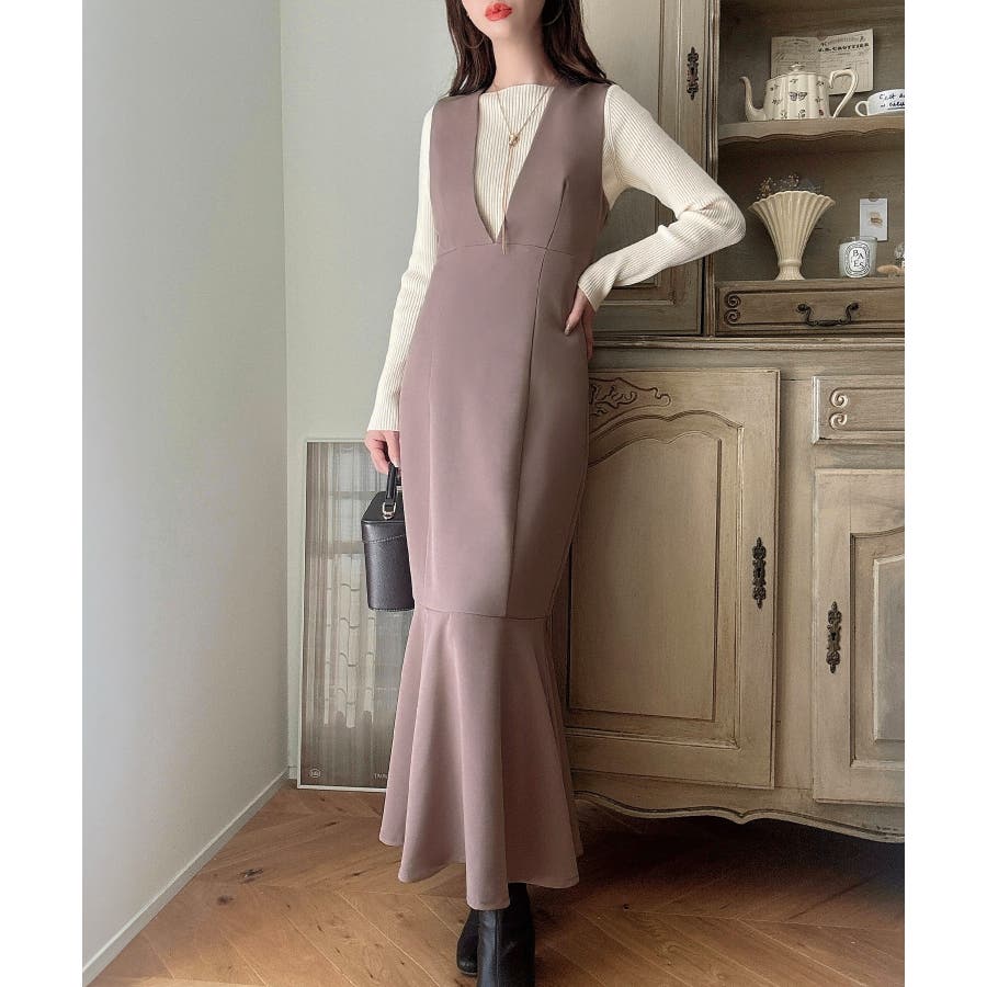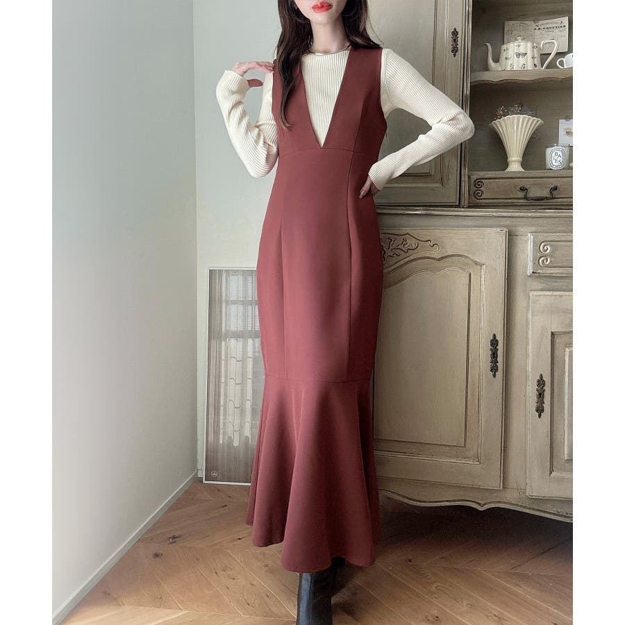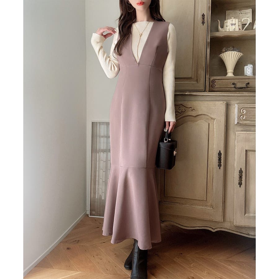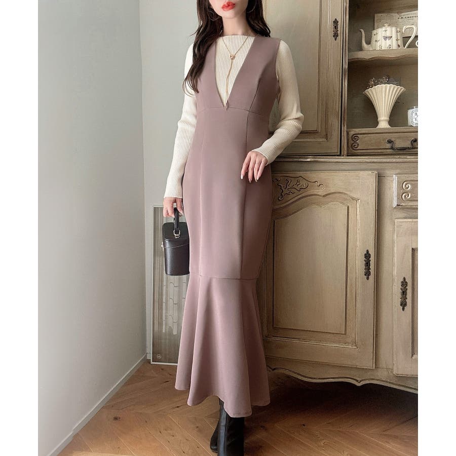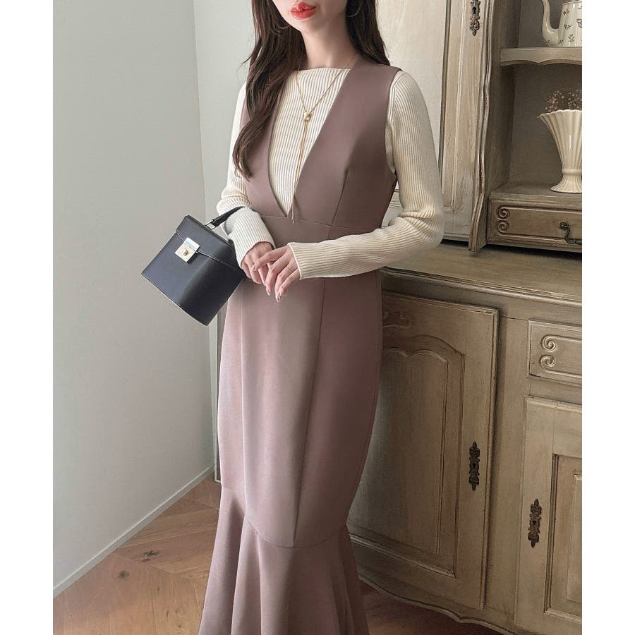 【ダスティピンク】Meiru 深Vネックジャンパーマーメイドスカート