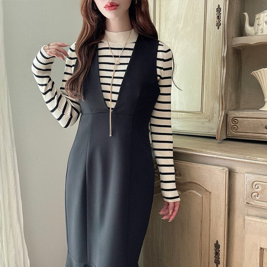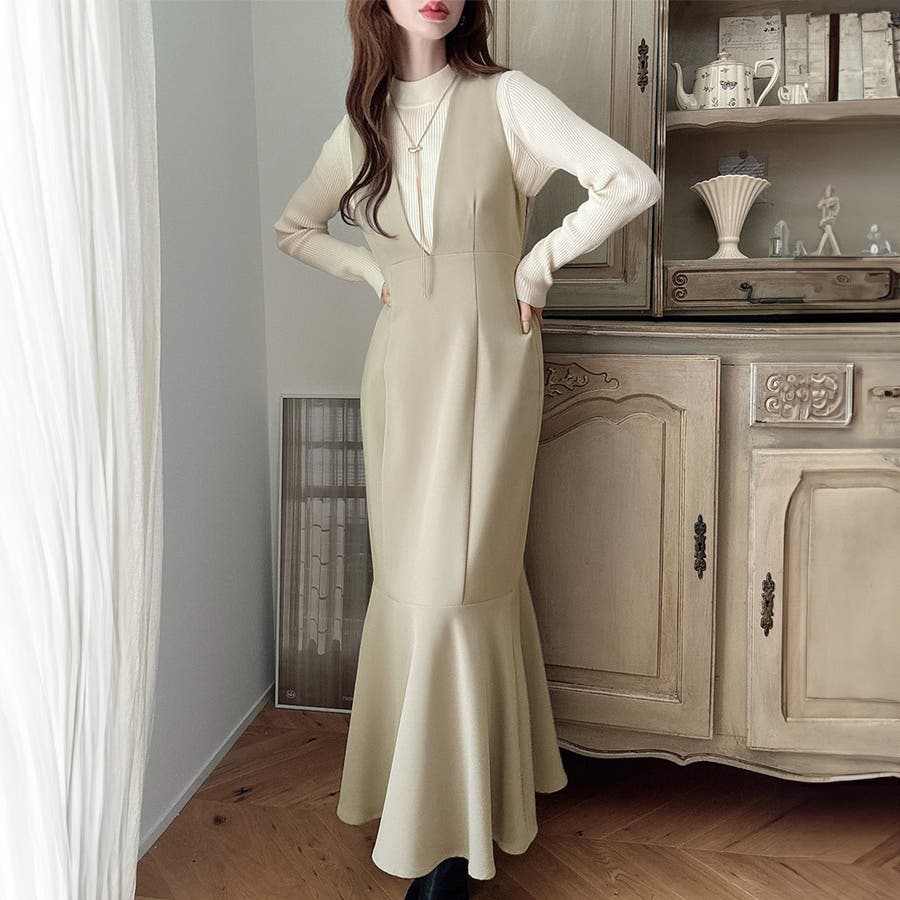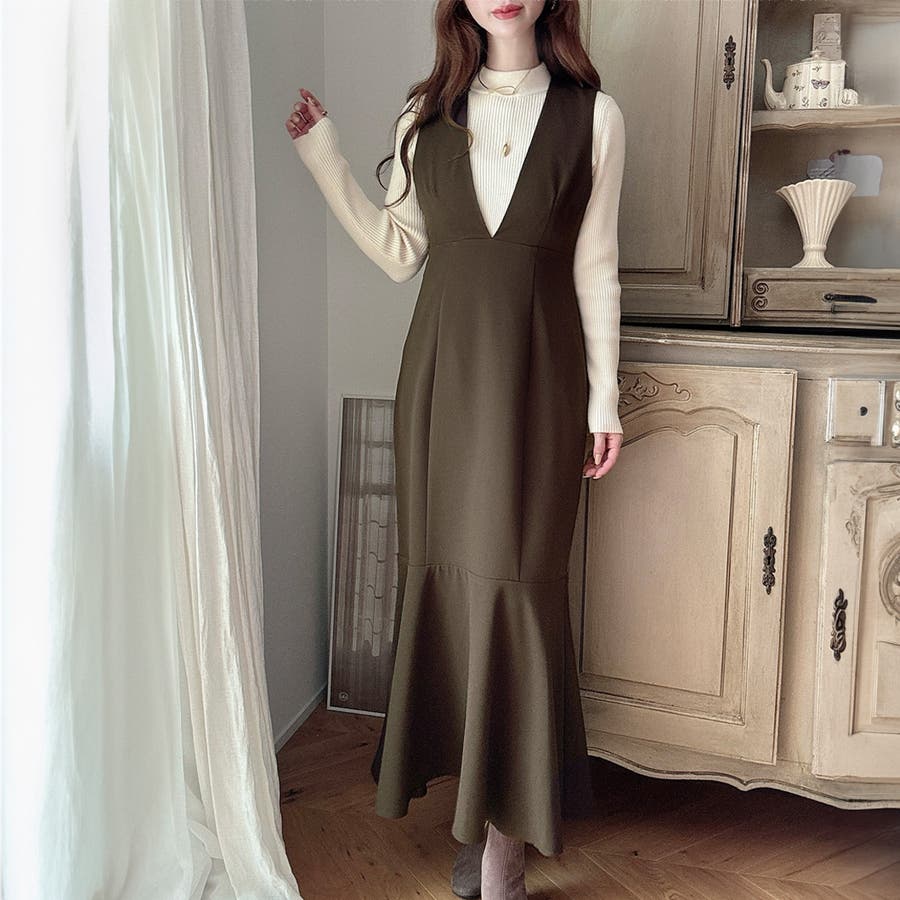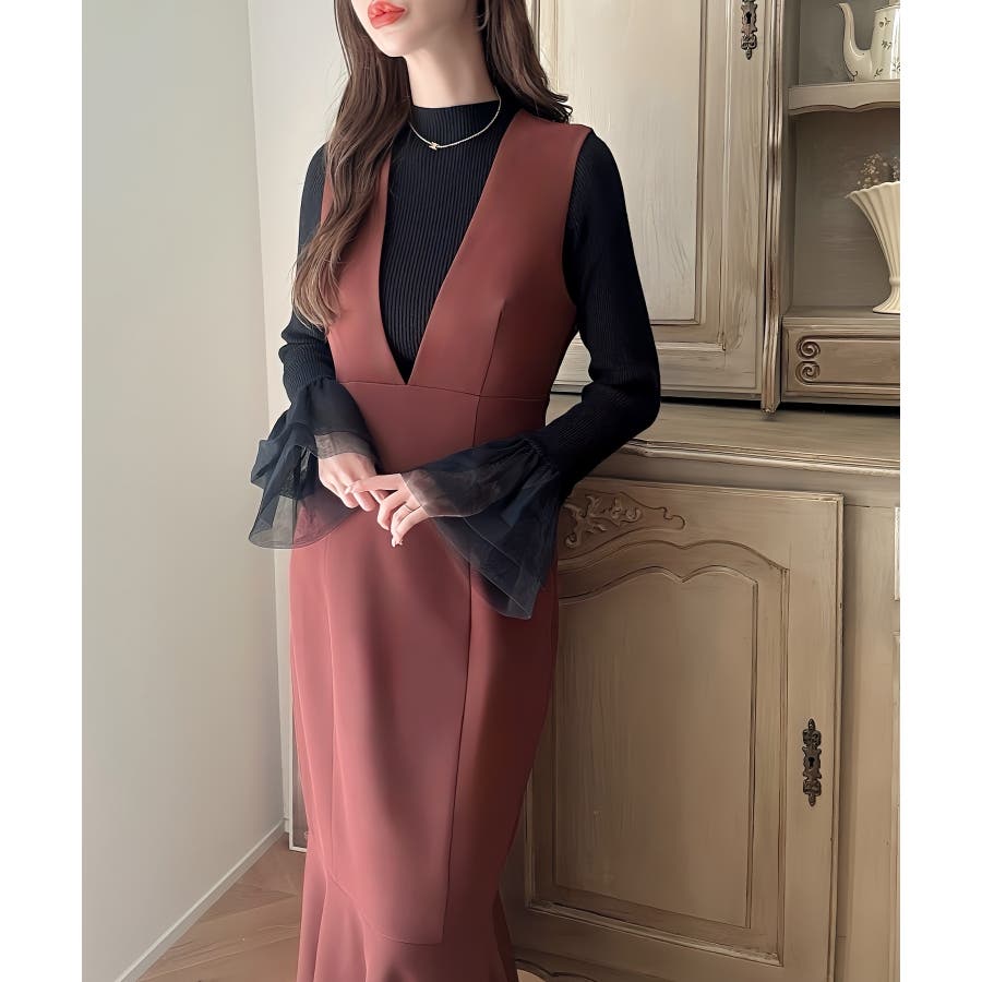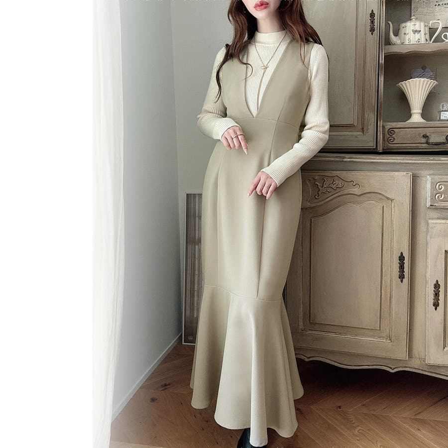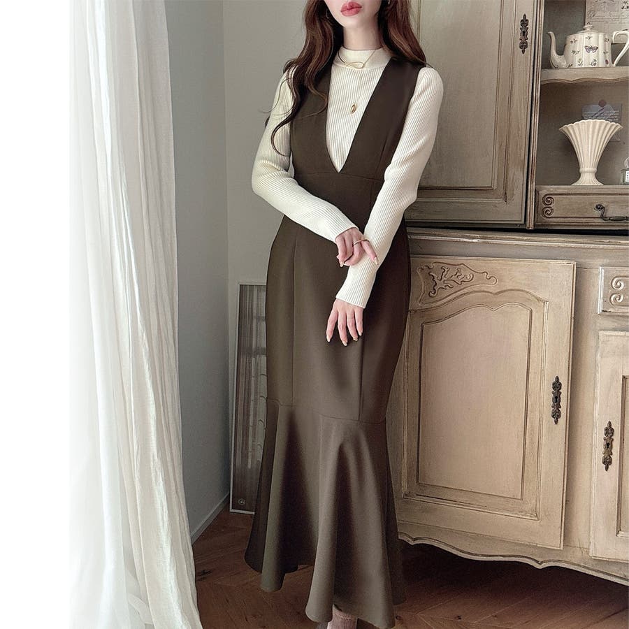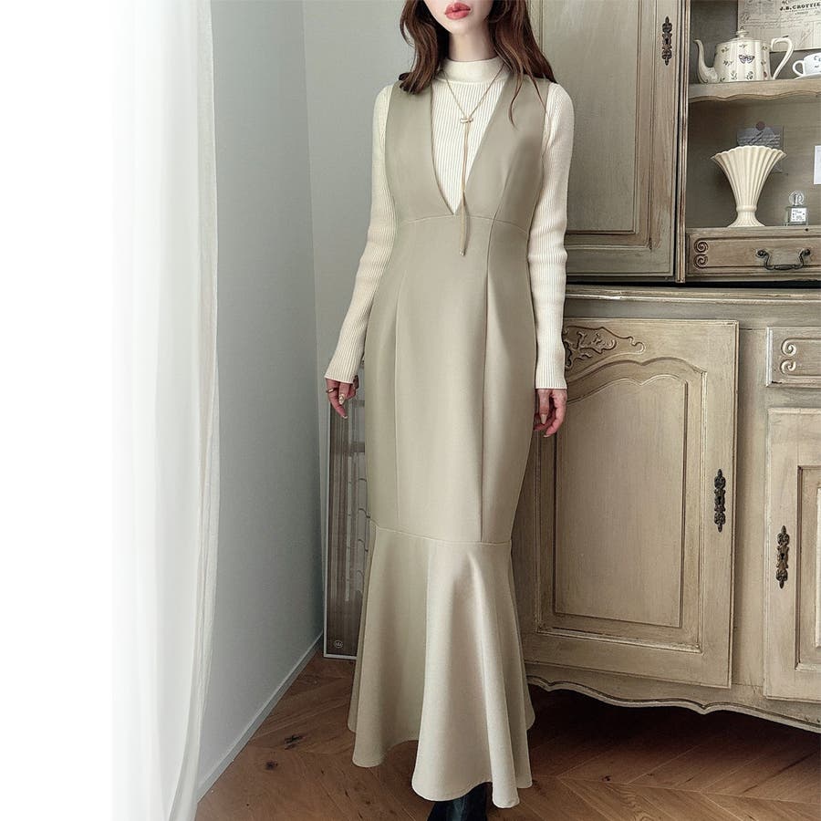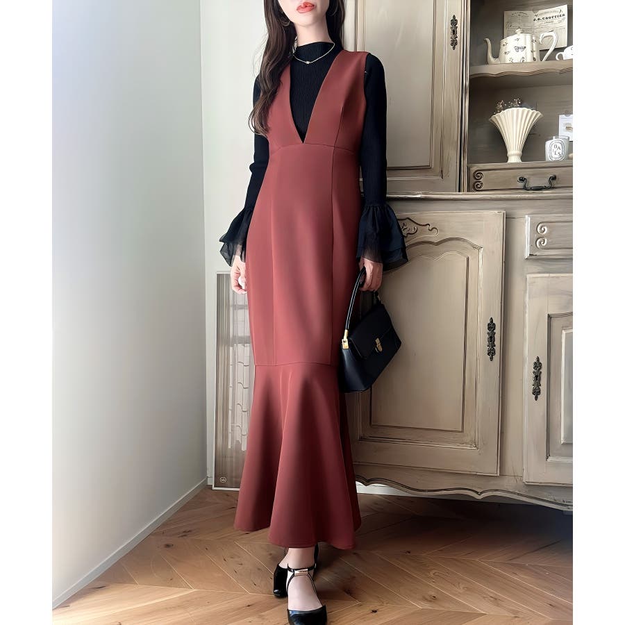 【ダスティピンク】Meiru 深Vネックジャンパーマーメイドスカート