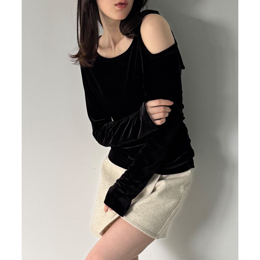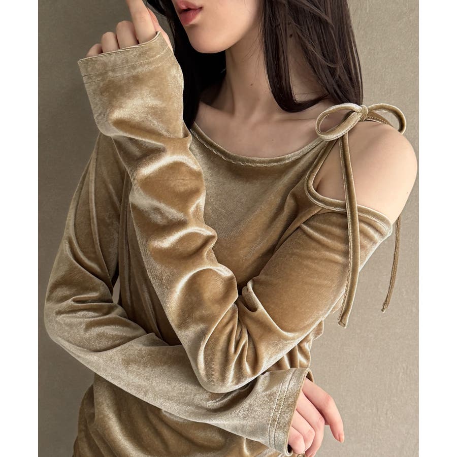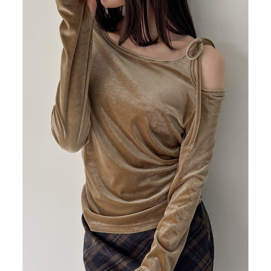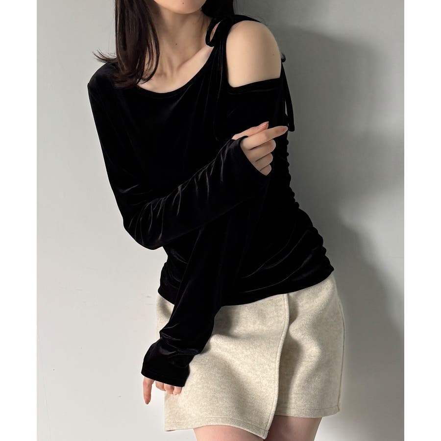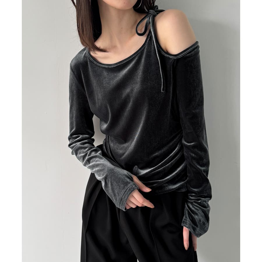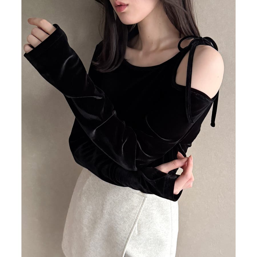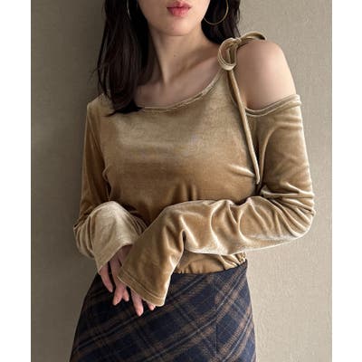 アシメ肩リボンベロアトップス