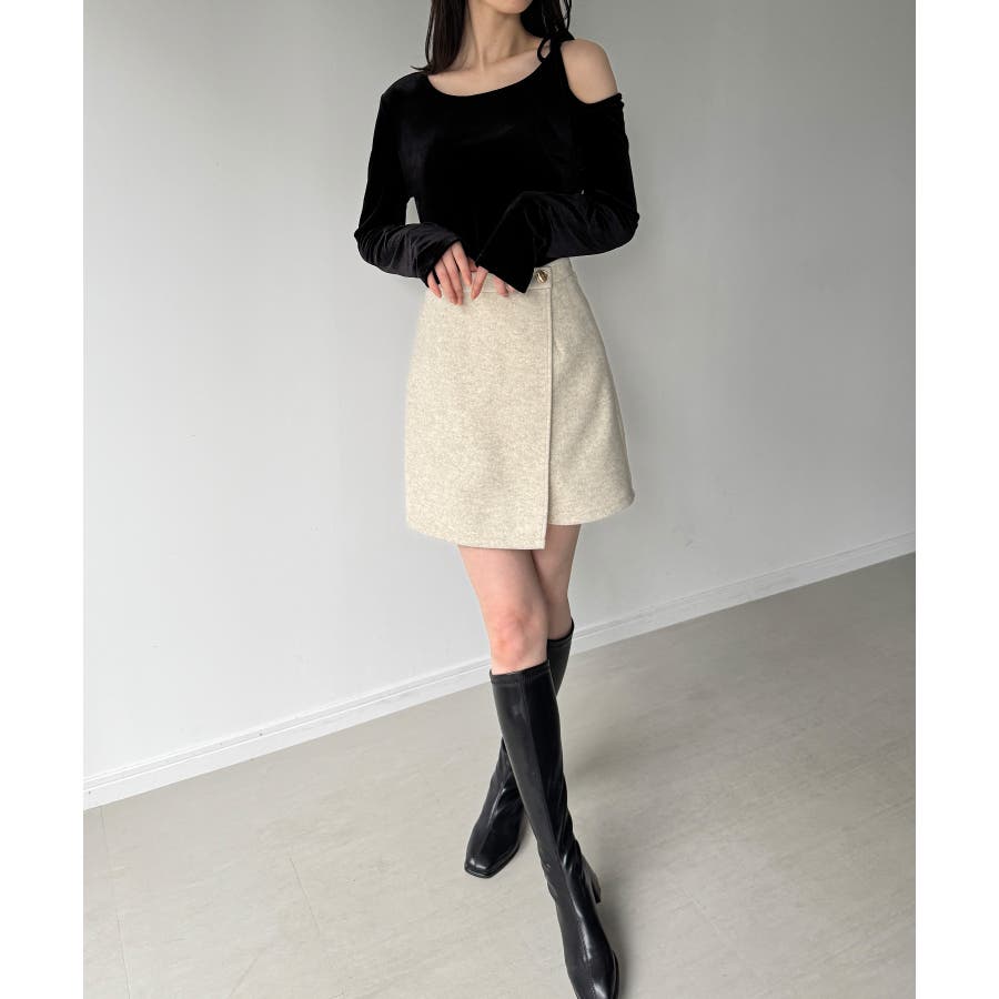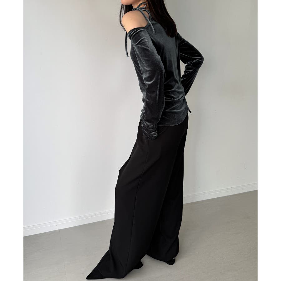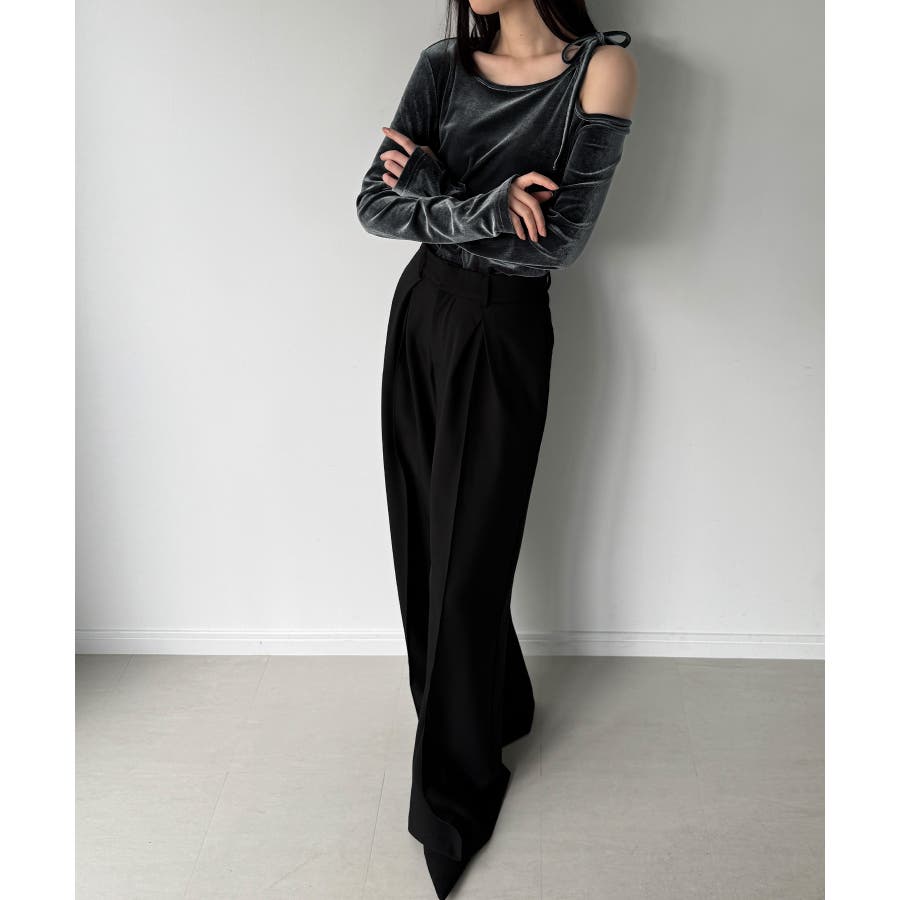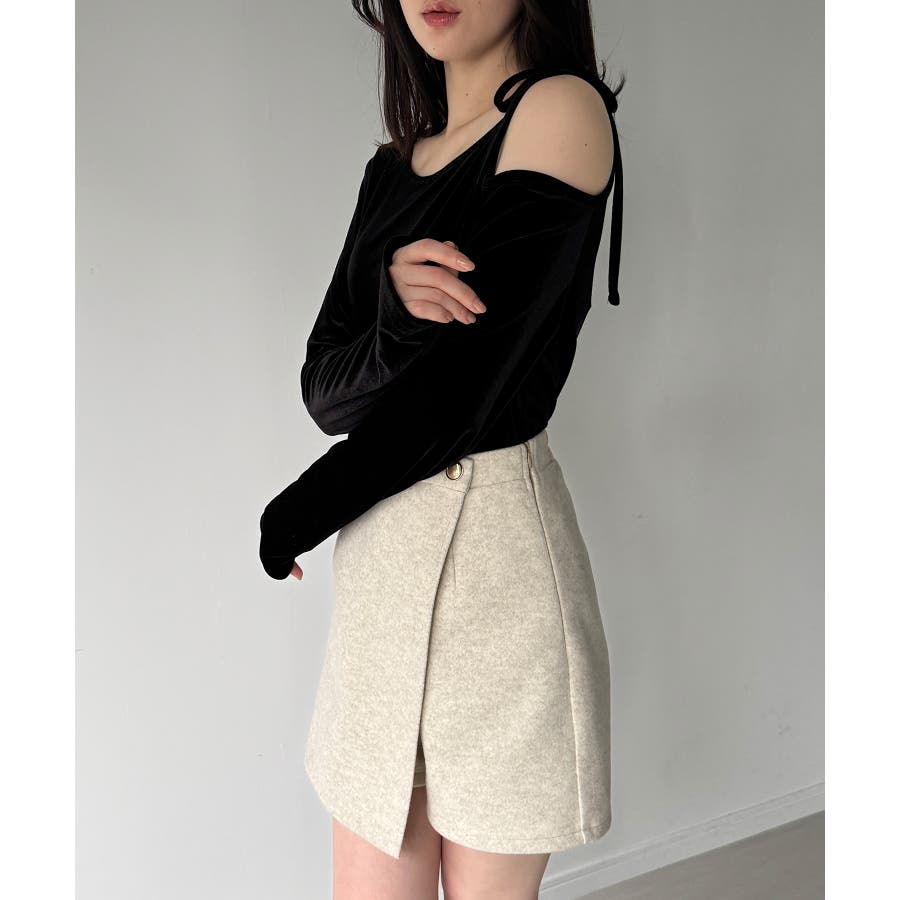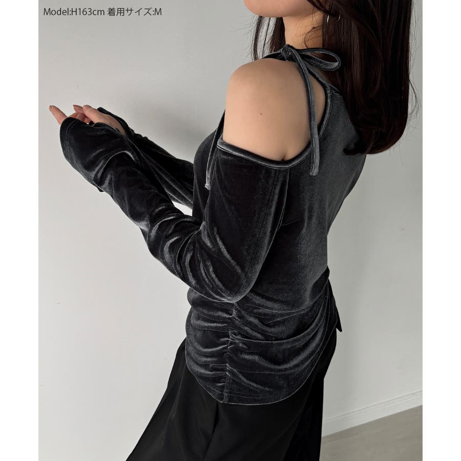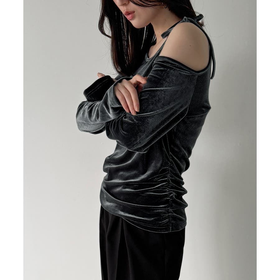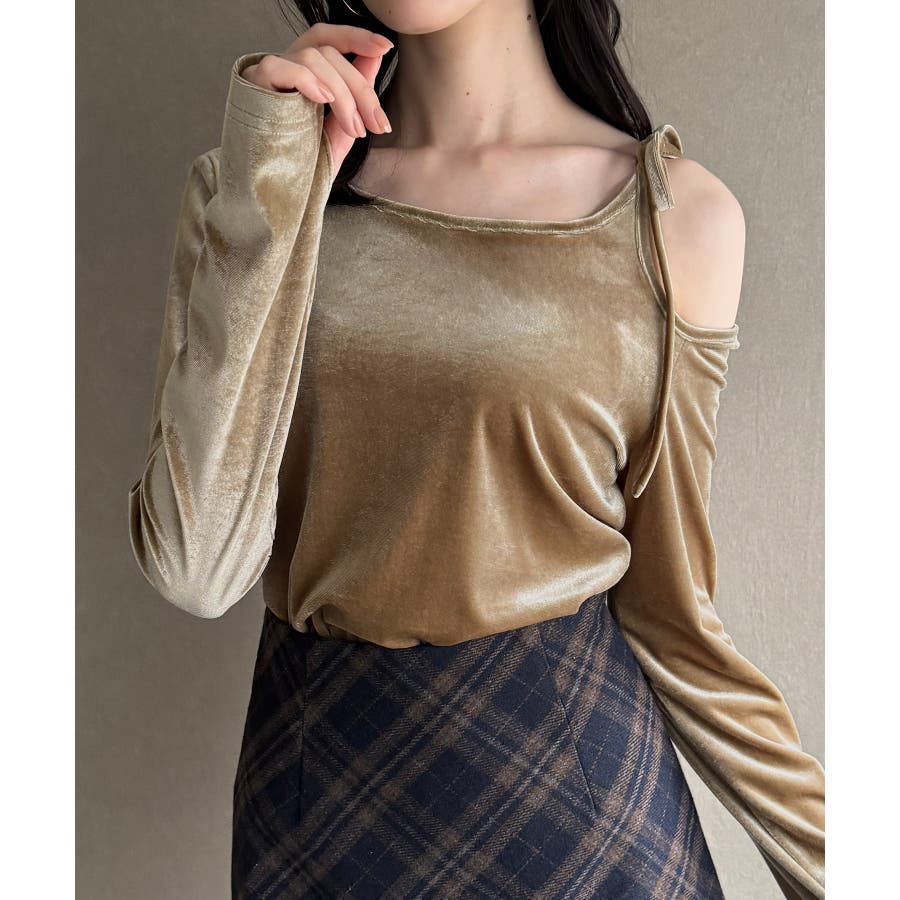 アシメ肩リボンベロアトップス