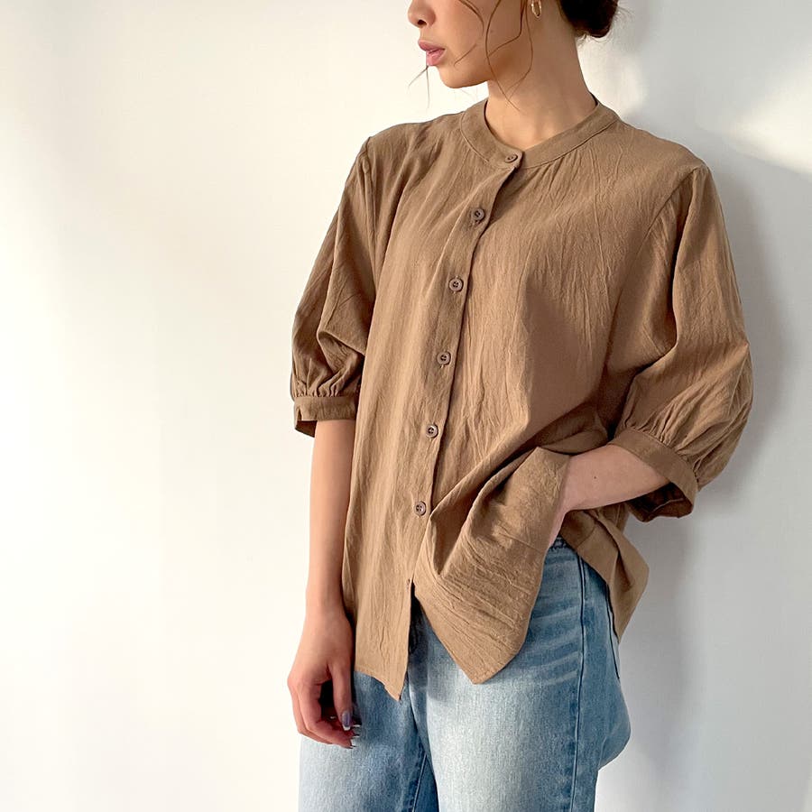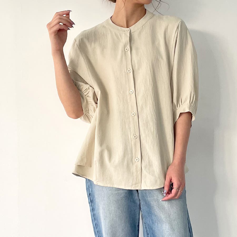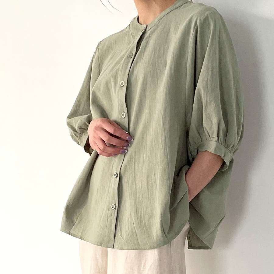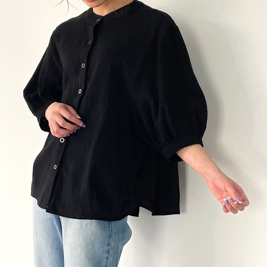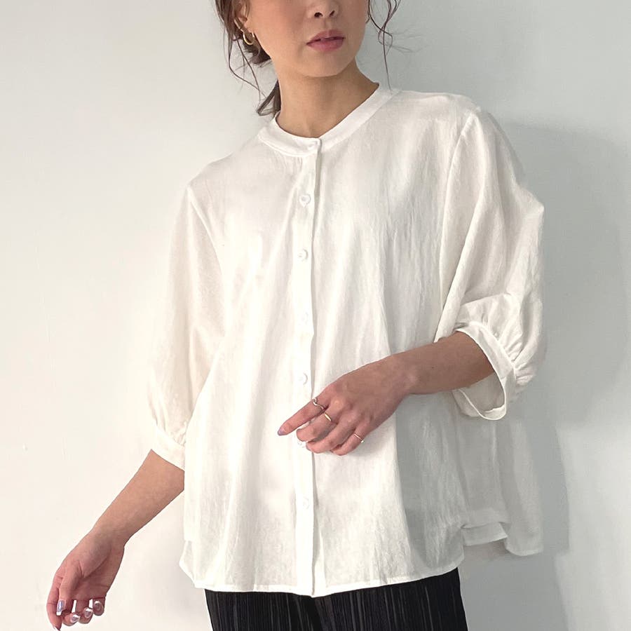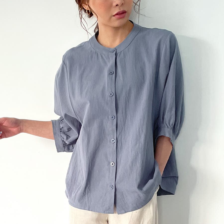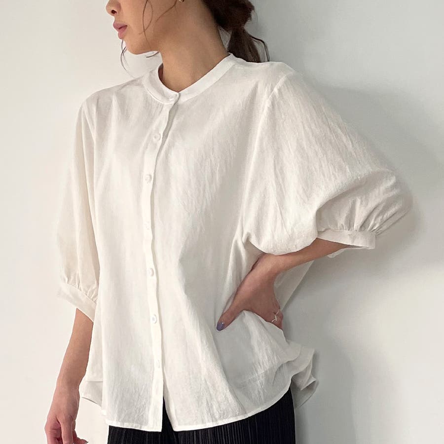ノーカラーボリュームスリーブコットンシャツ