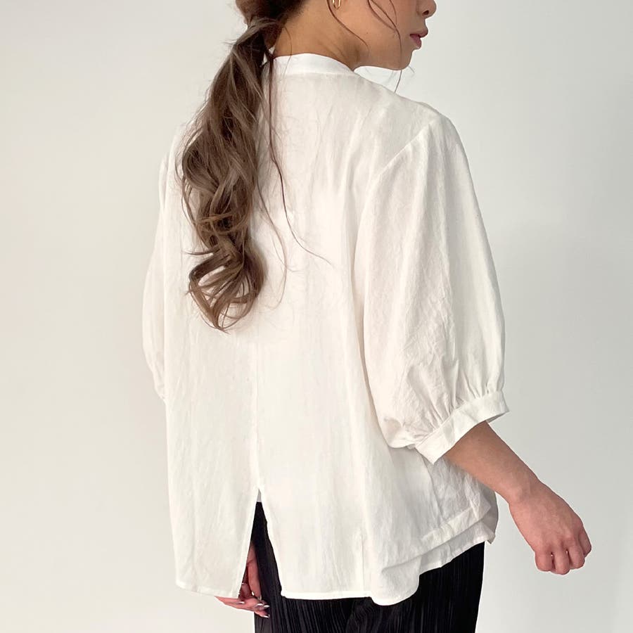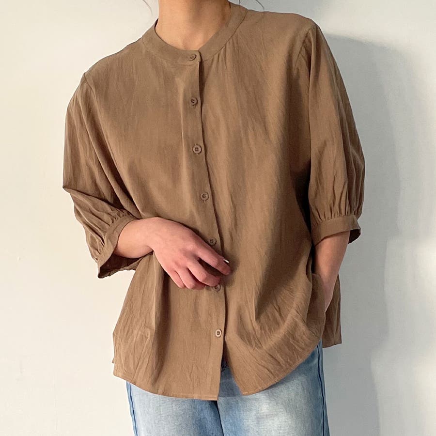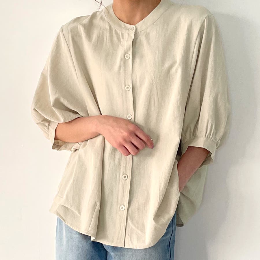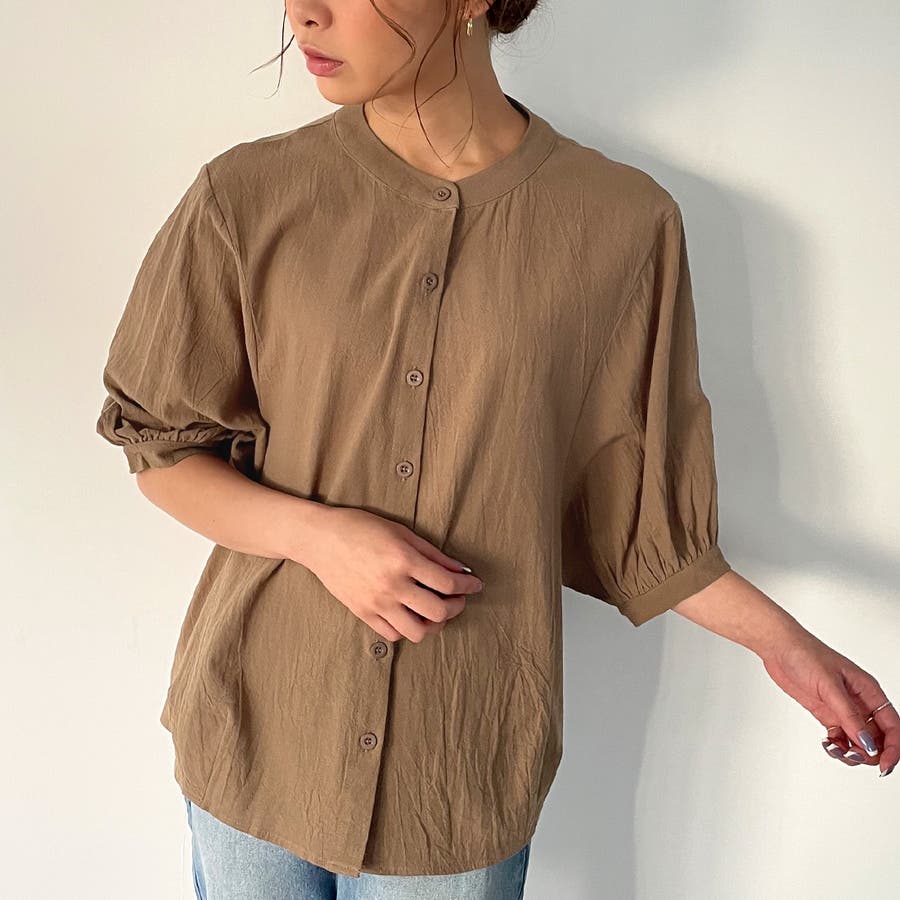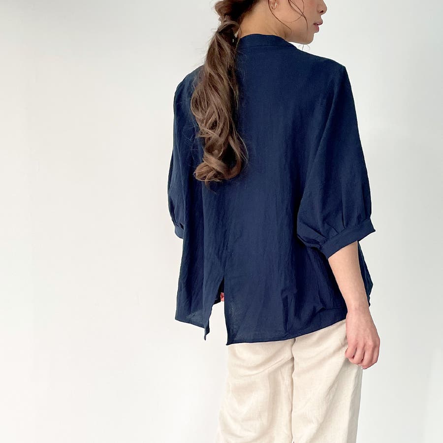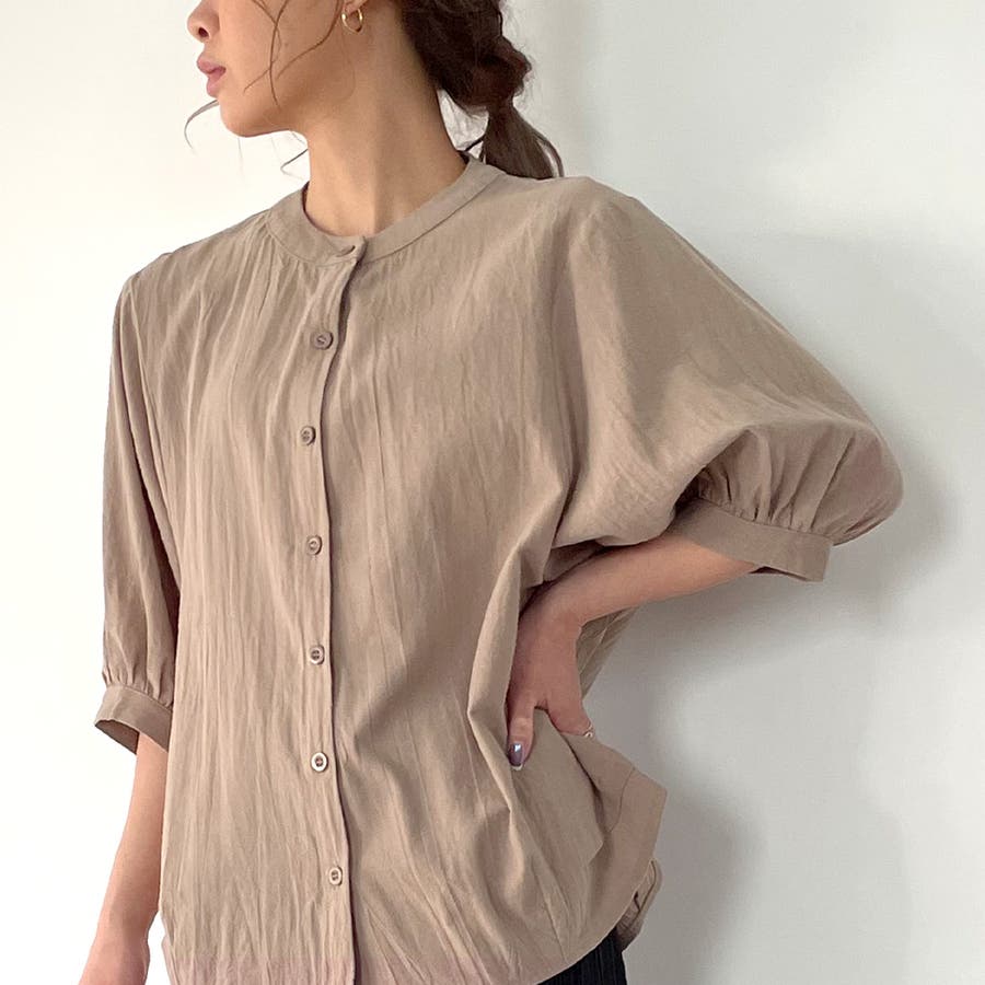 ノーカラーボリュームスリーブコットンシャツ