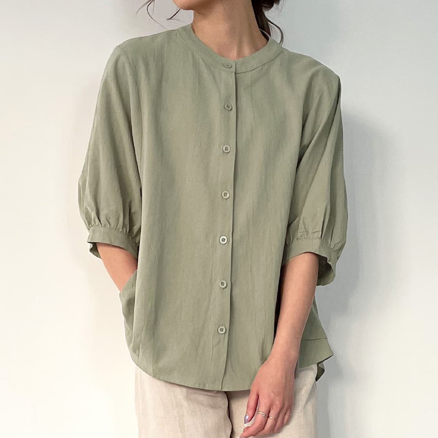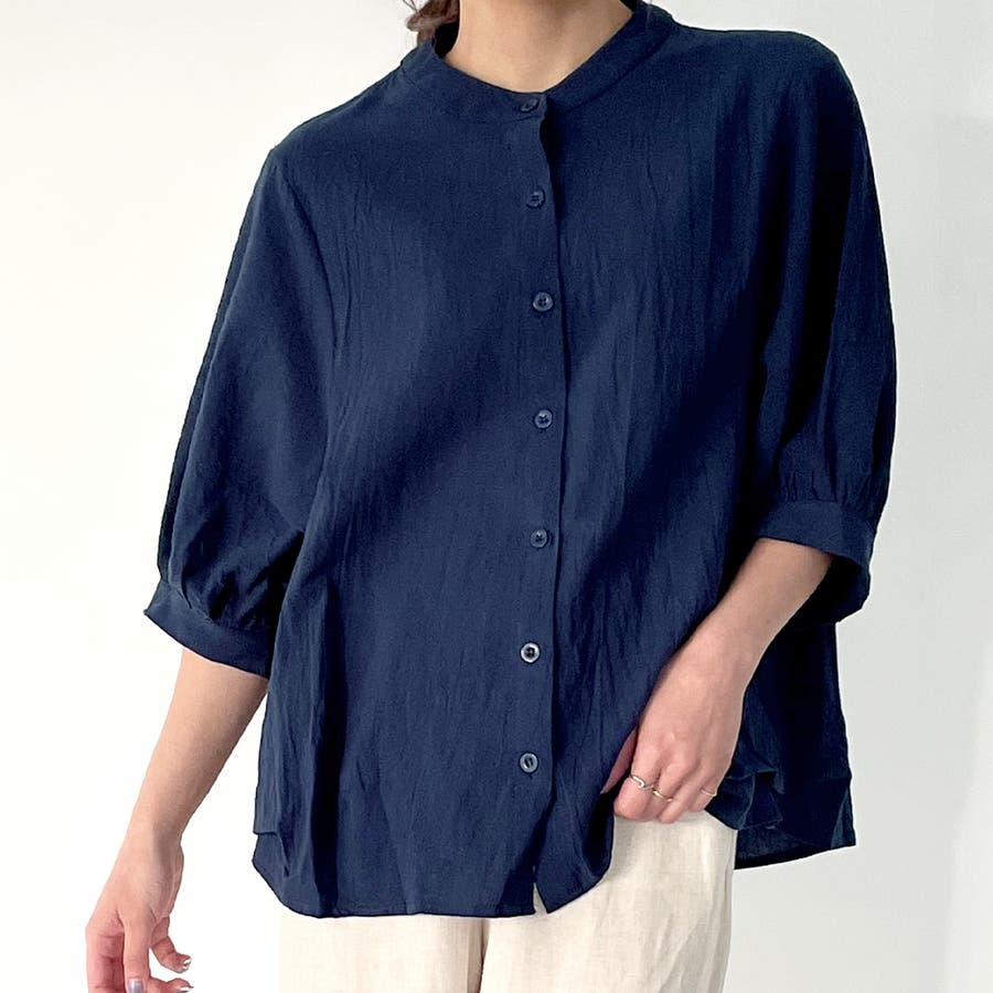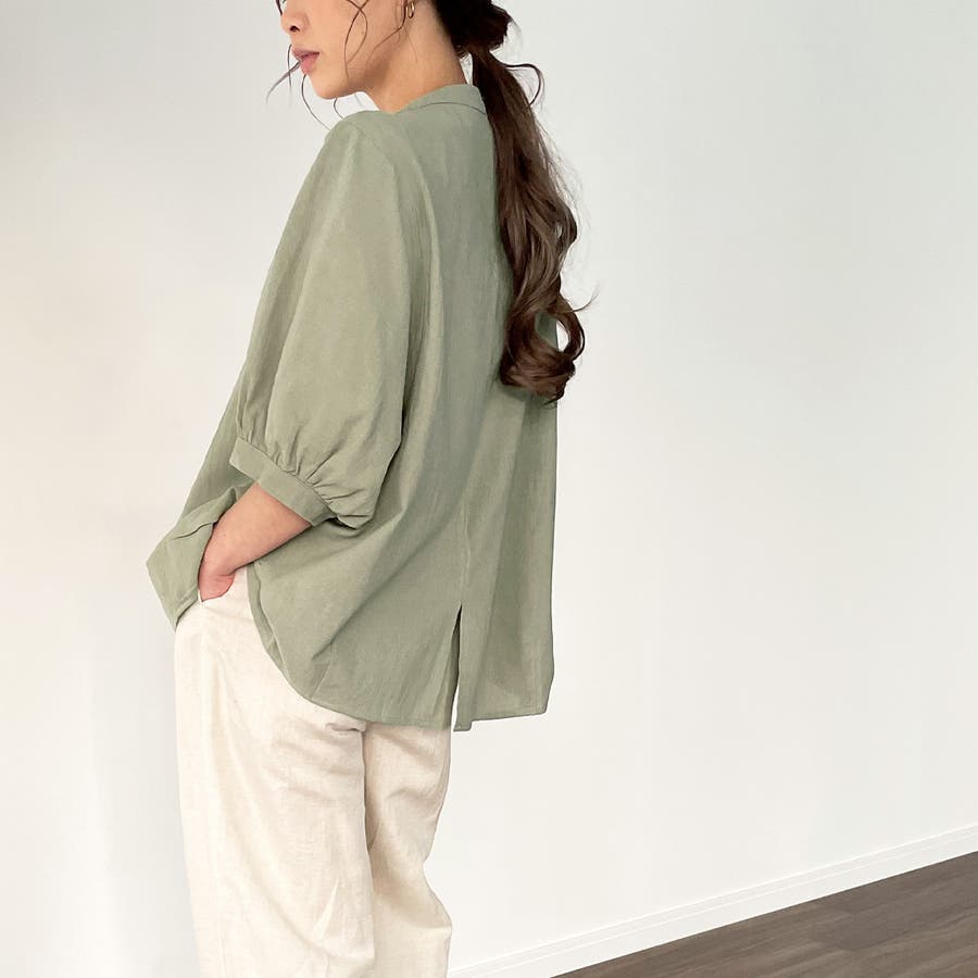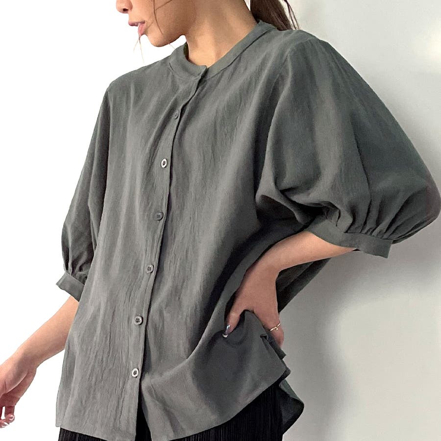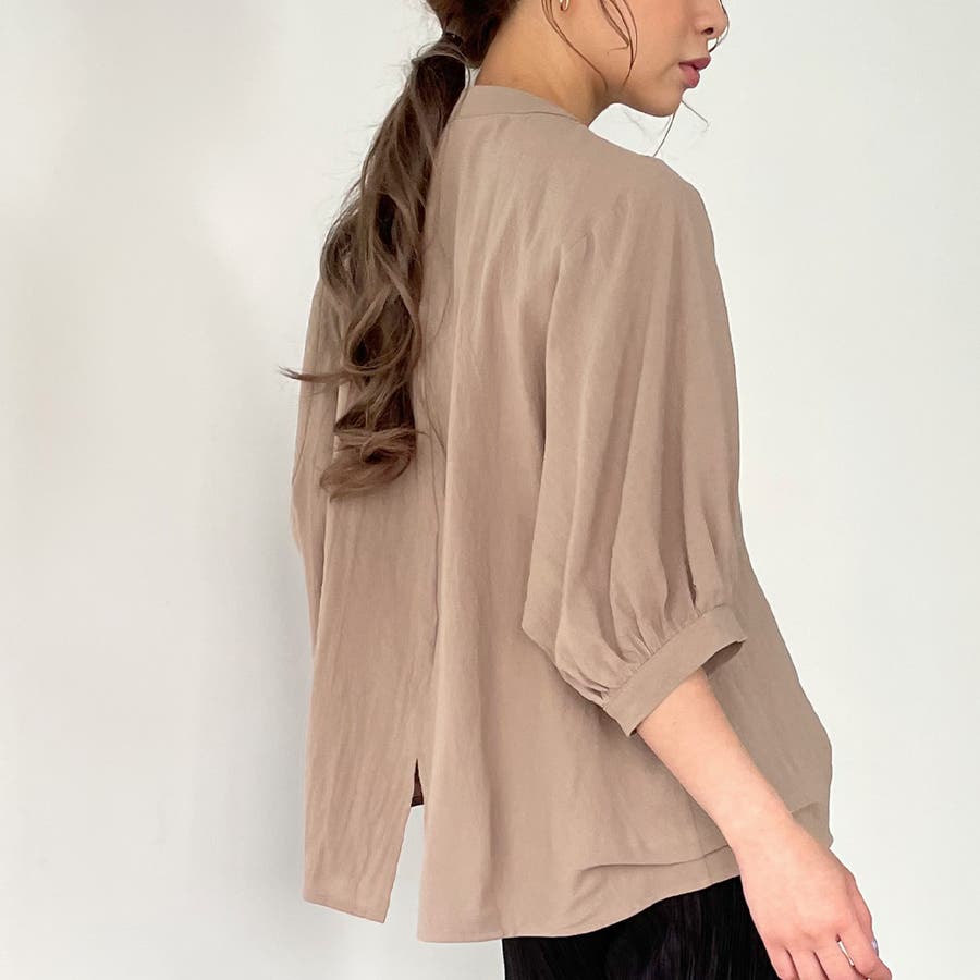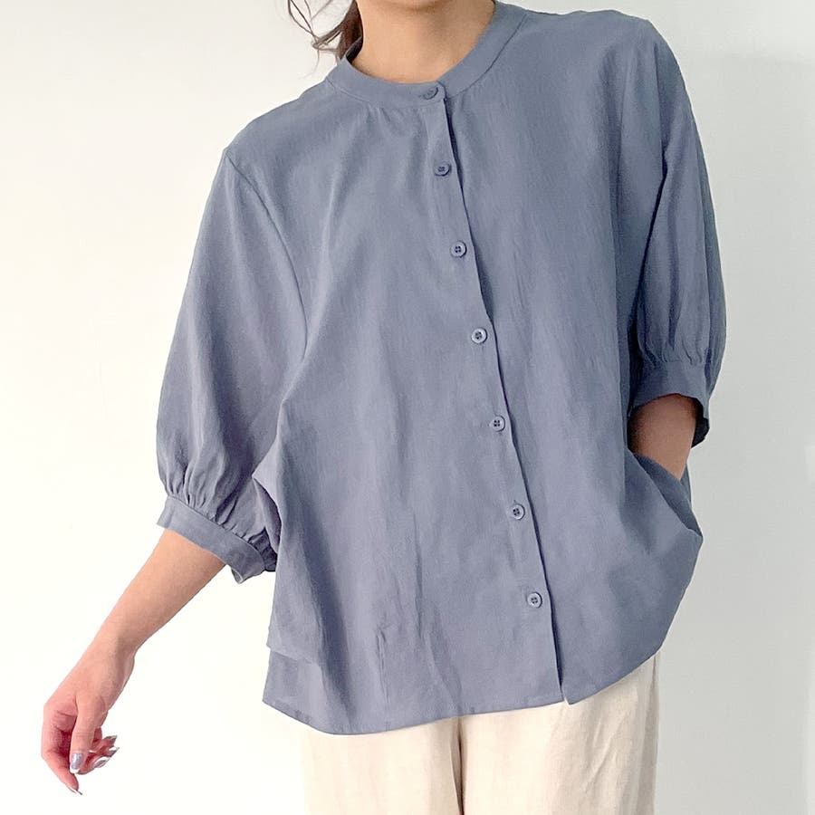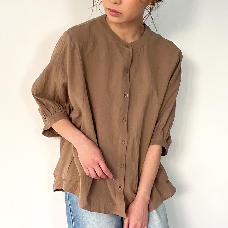ノーカラーボリュームスリーブコットンシャツ