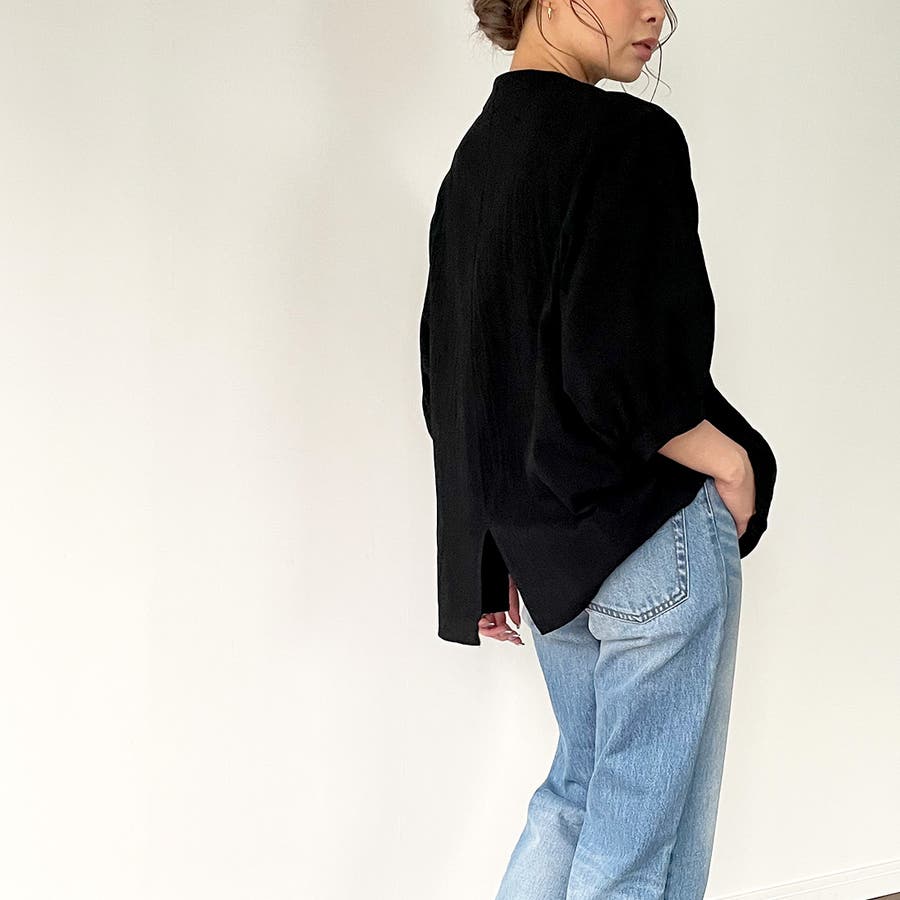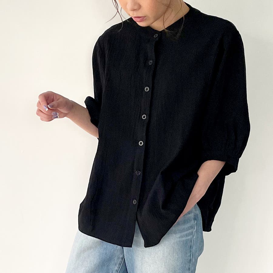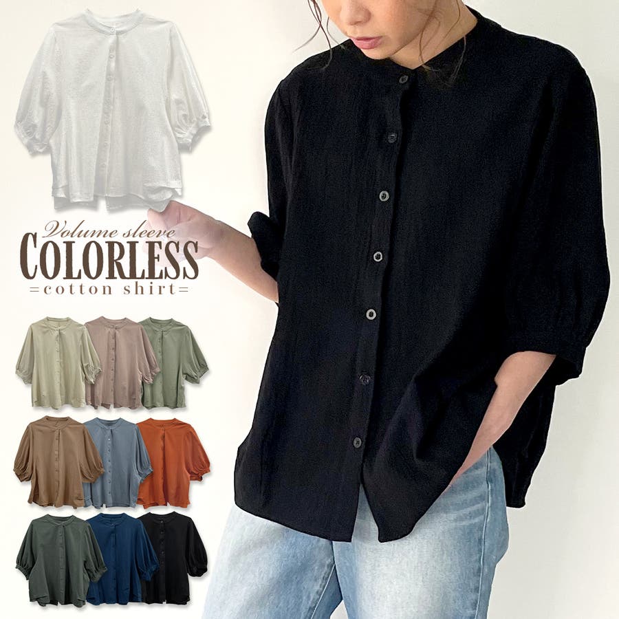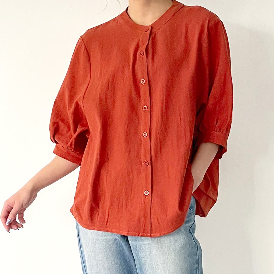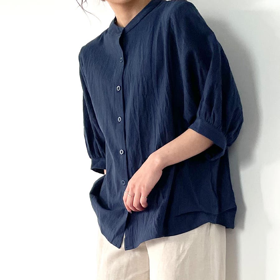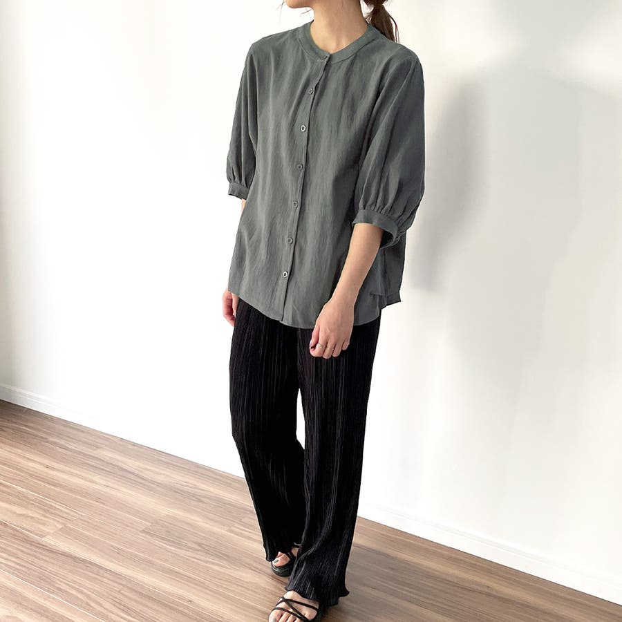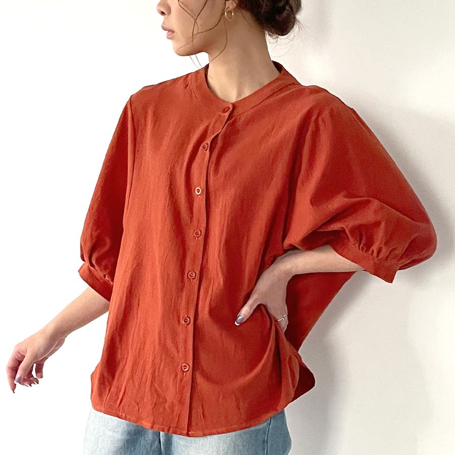 ノーカラーボリュームスリーブコットンシャツ