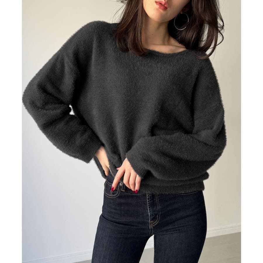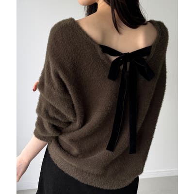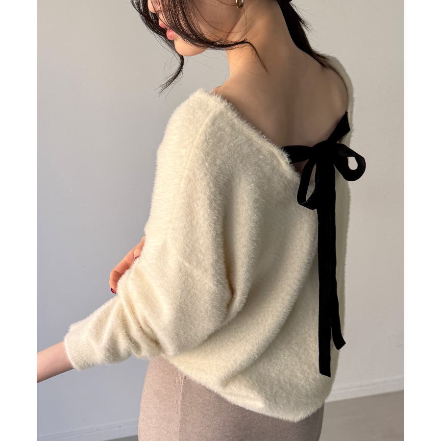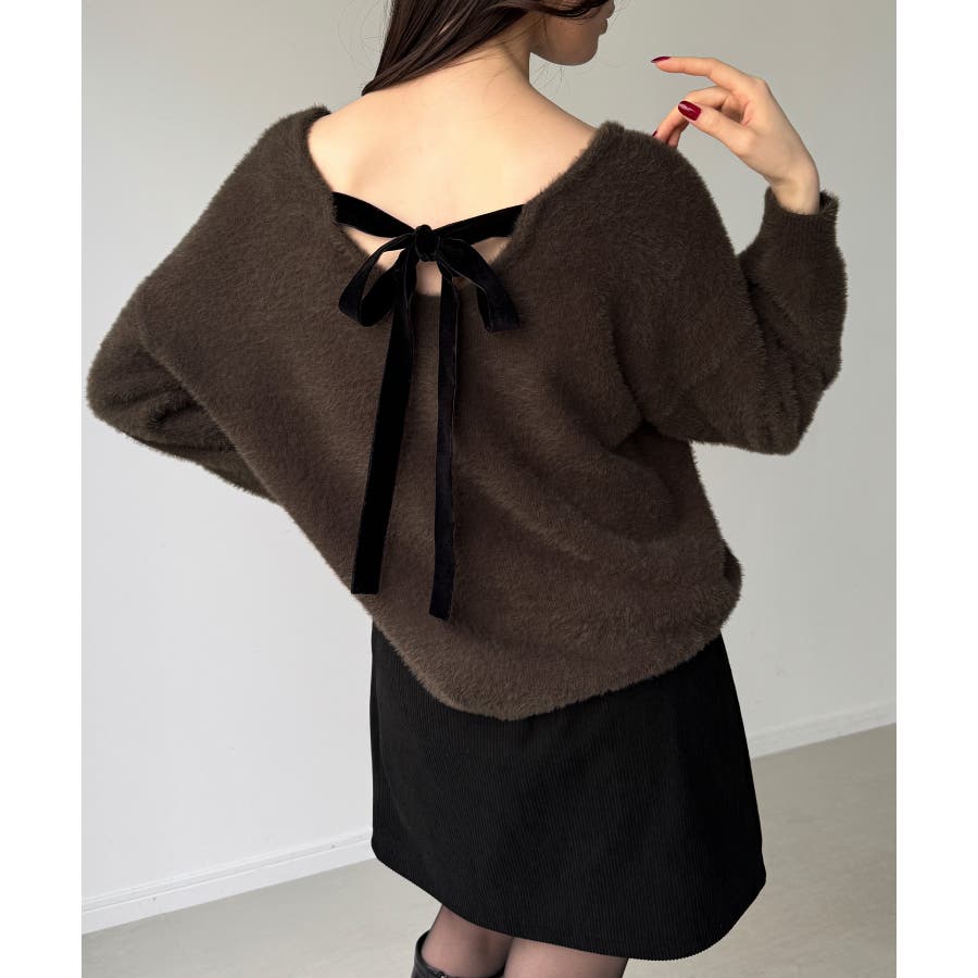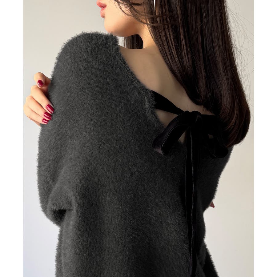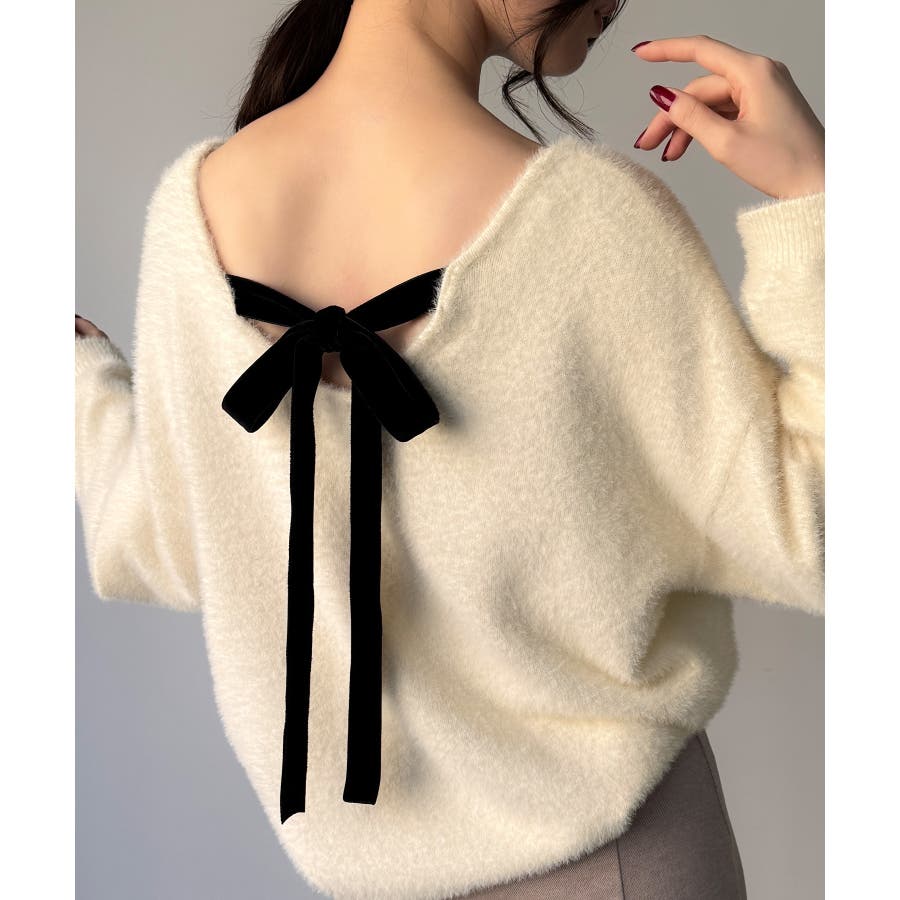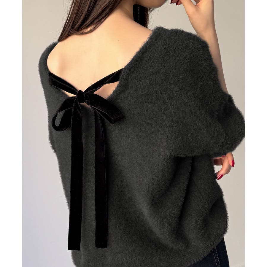 バックベロアリボンシャギーニットトップス