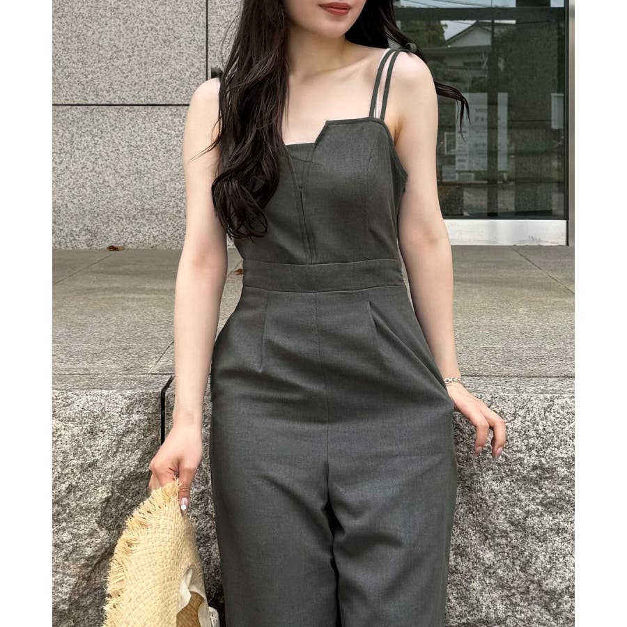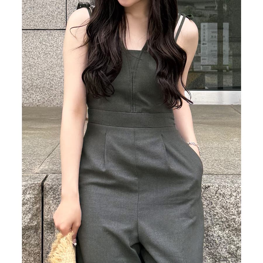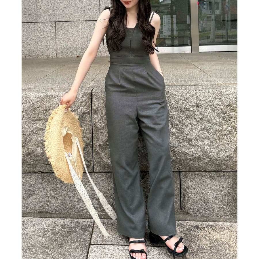 リネン混ショルダーリボンデザインオールインワン