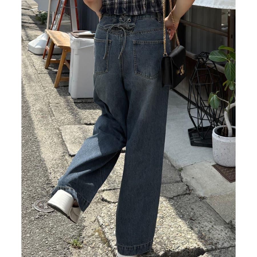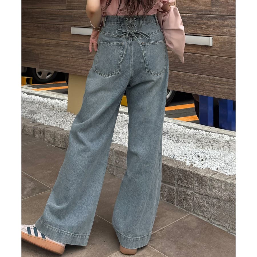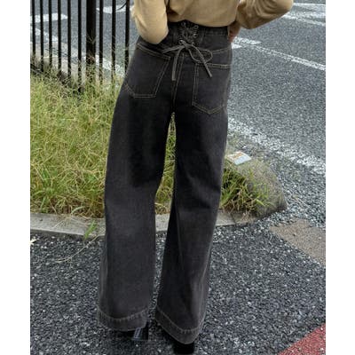 バックレースアップデニムワイドパンツ