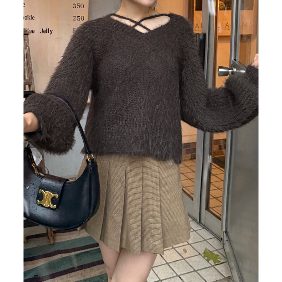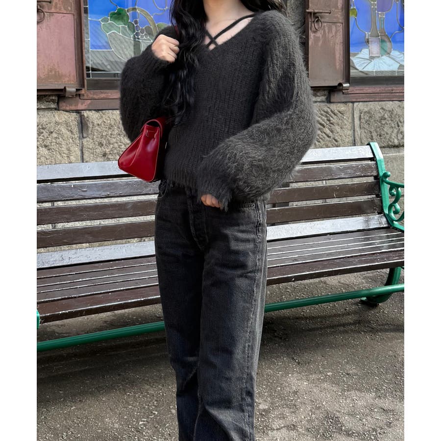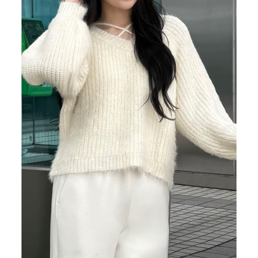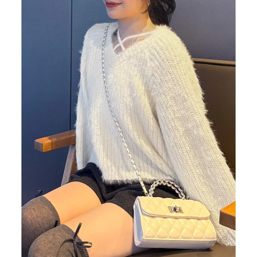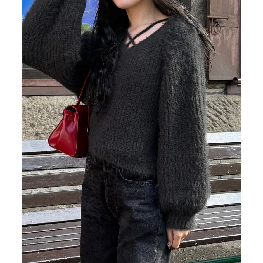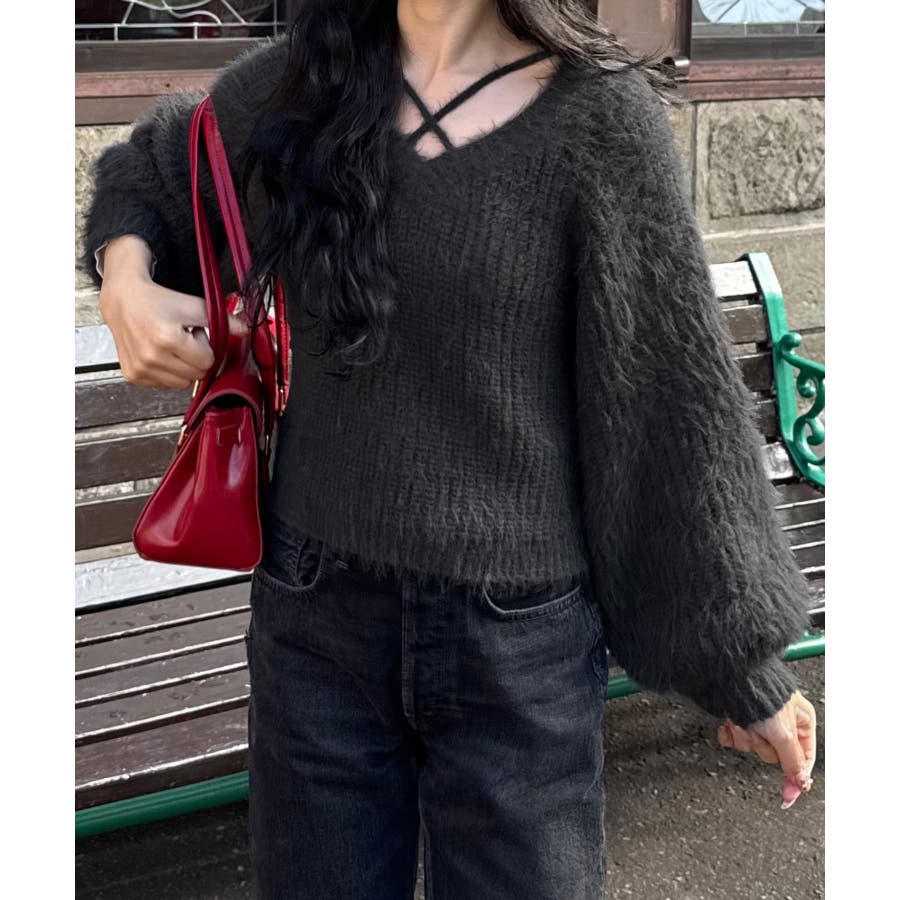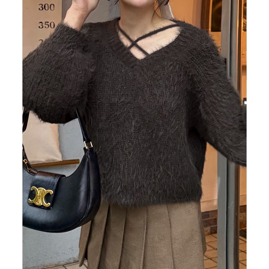クロスデザインショート丈シャギーニット