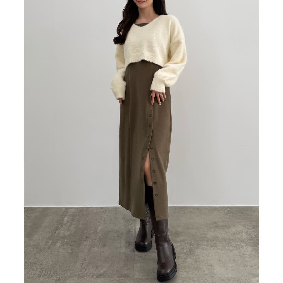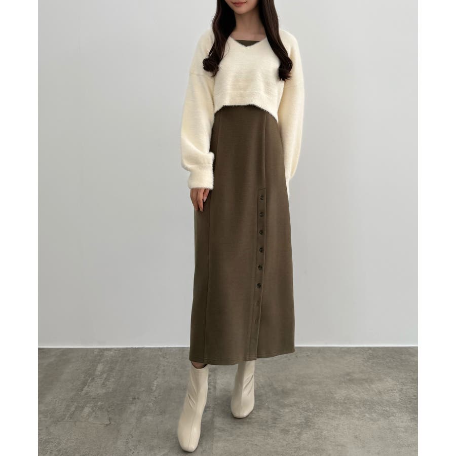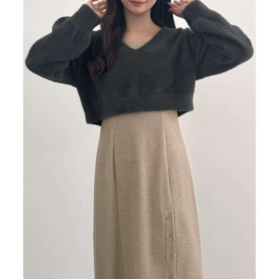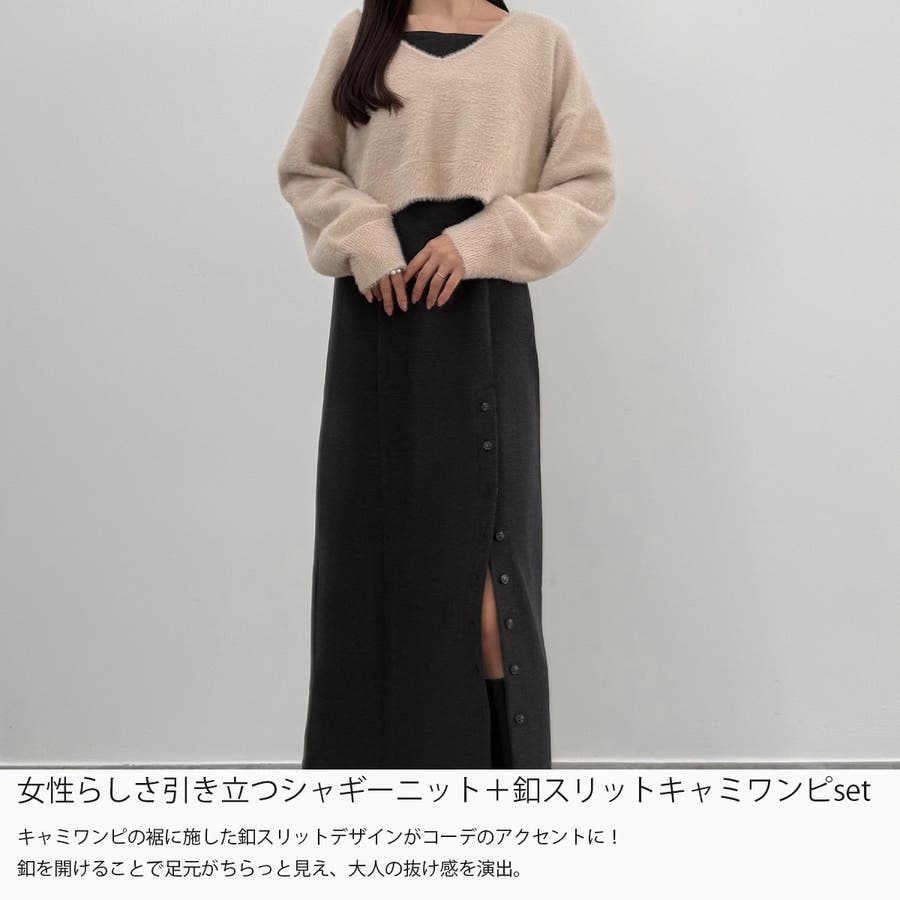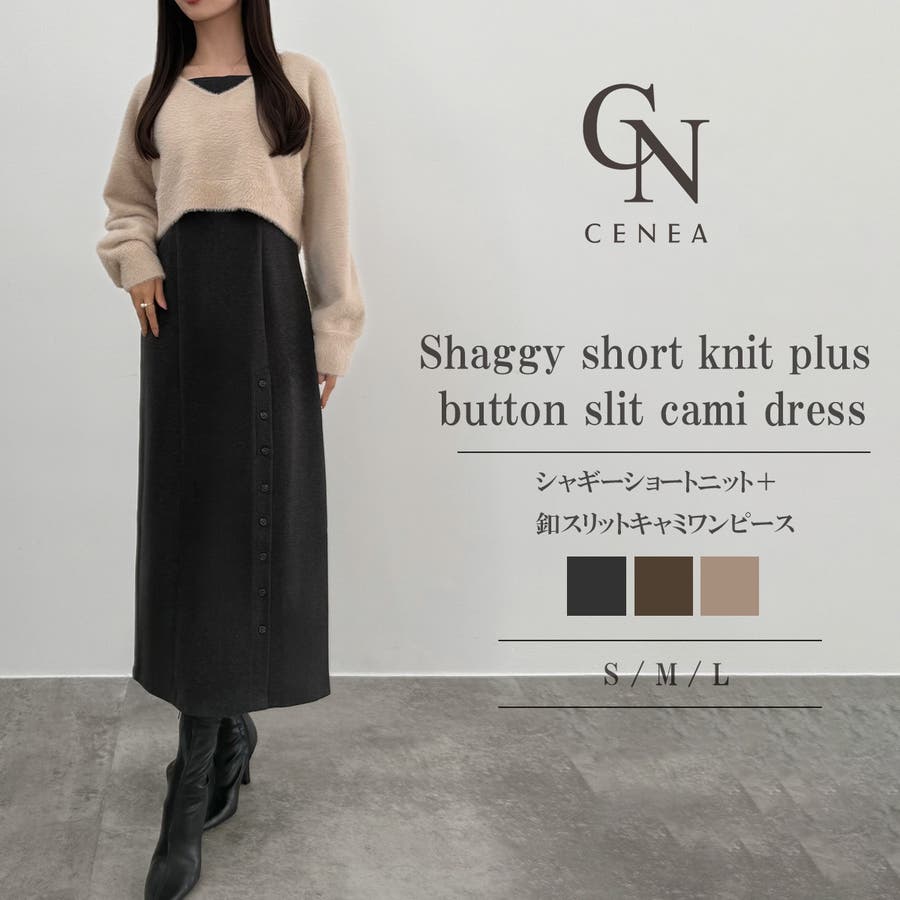 CENEA シャギーショートニット+釦スリットキャミワンピースset