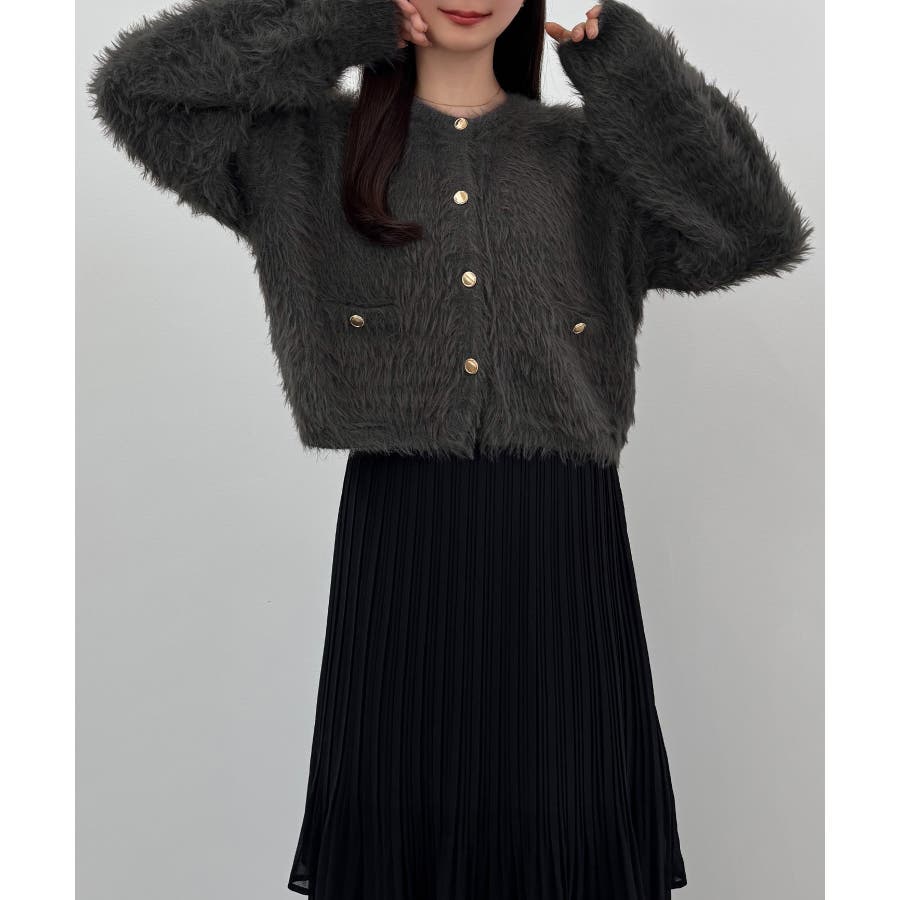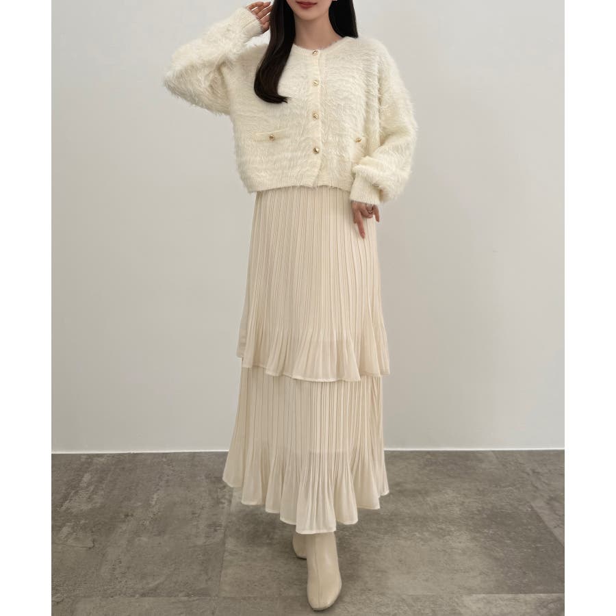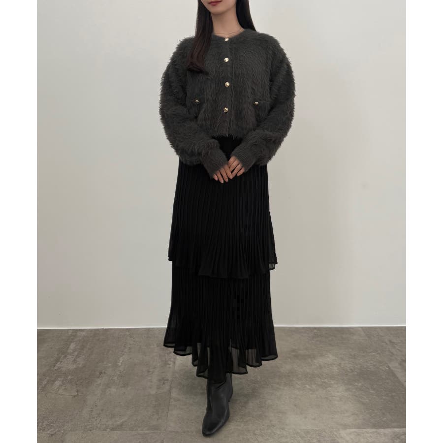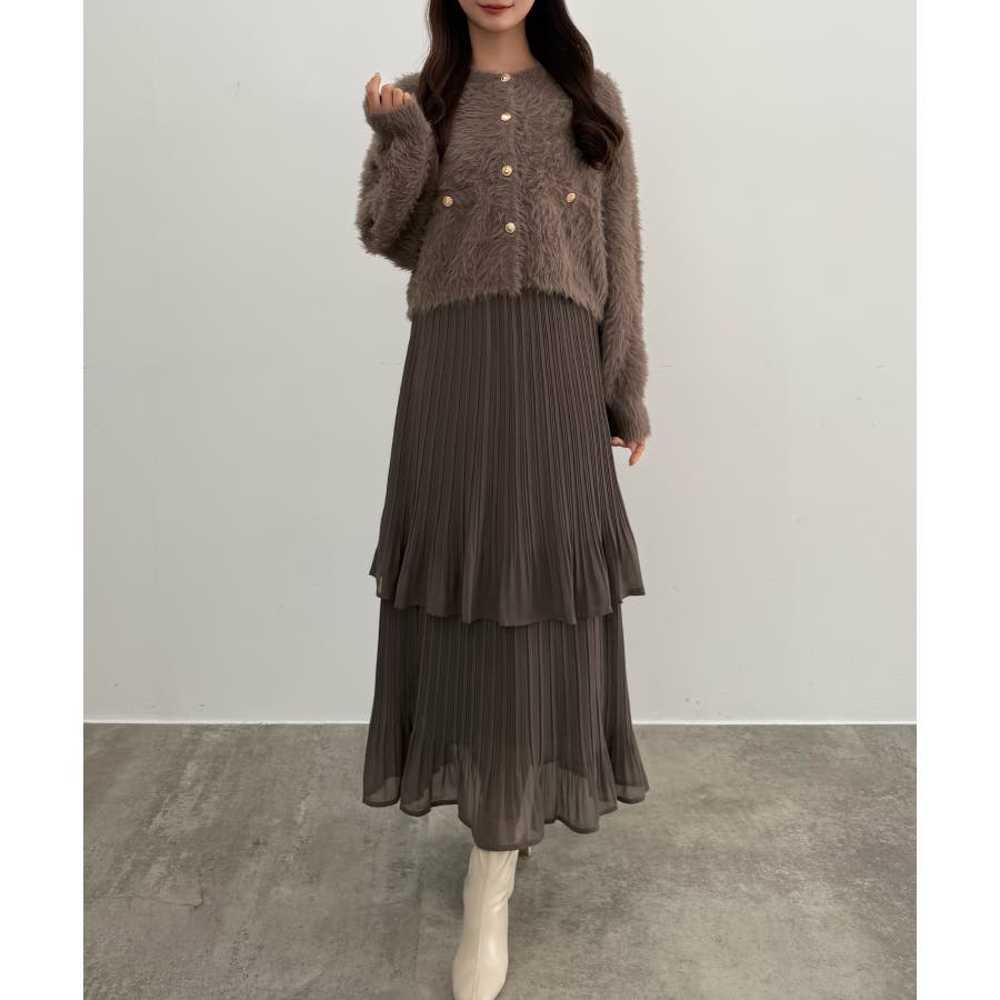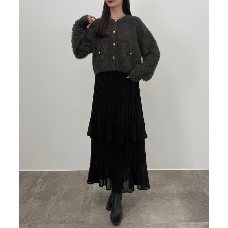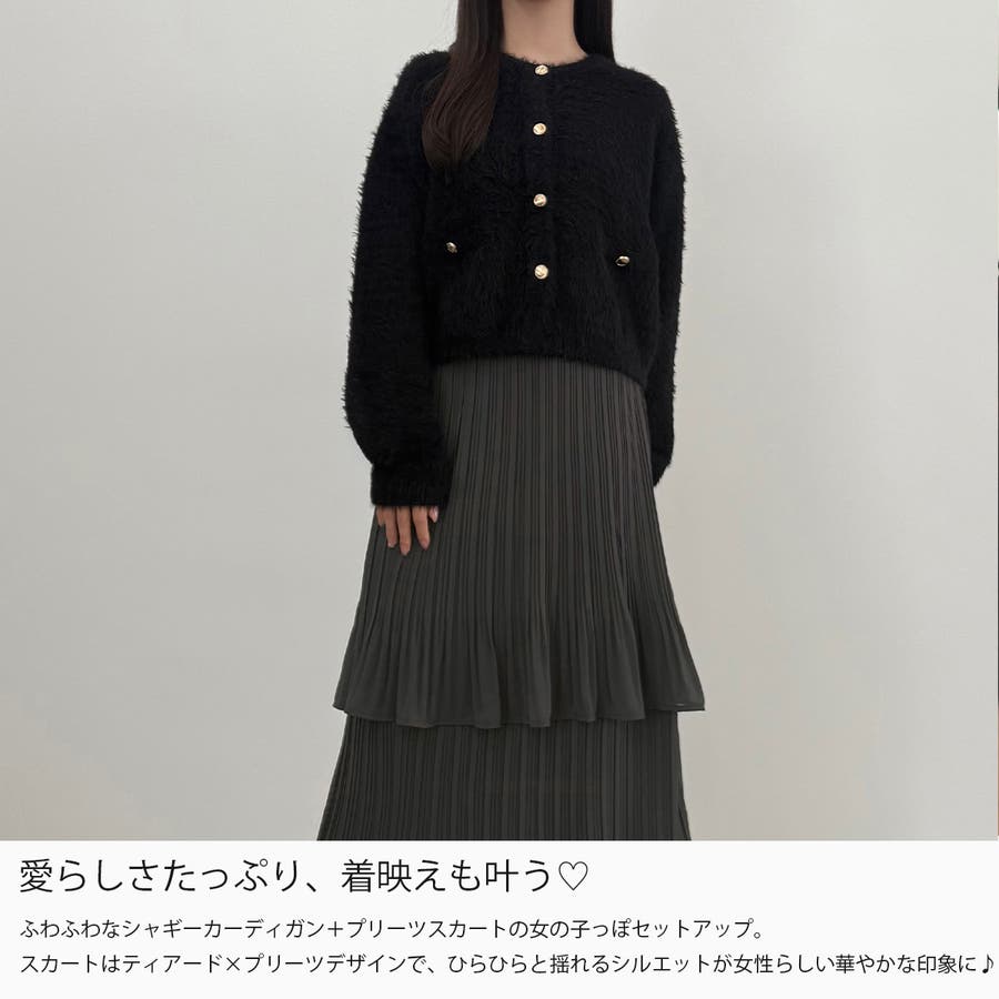 CENEA (薄手)金ボタンシャギーニットカーディガン+プリーツスカートset