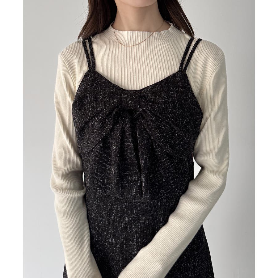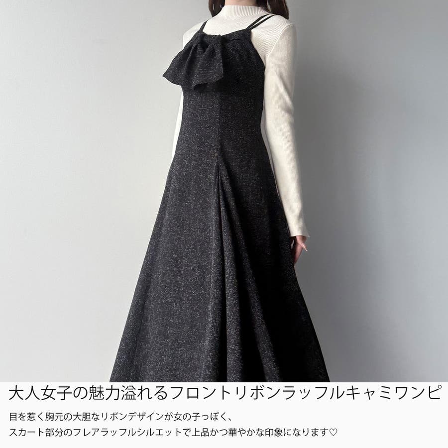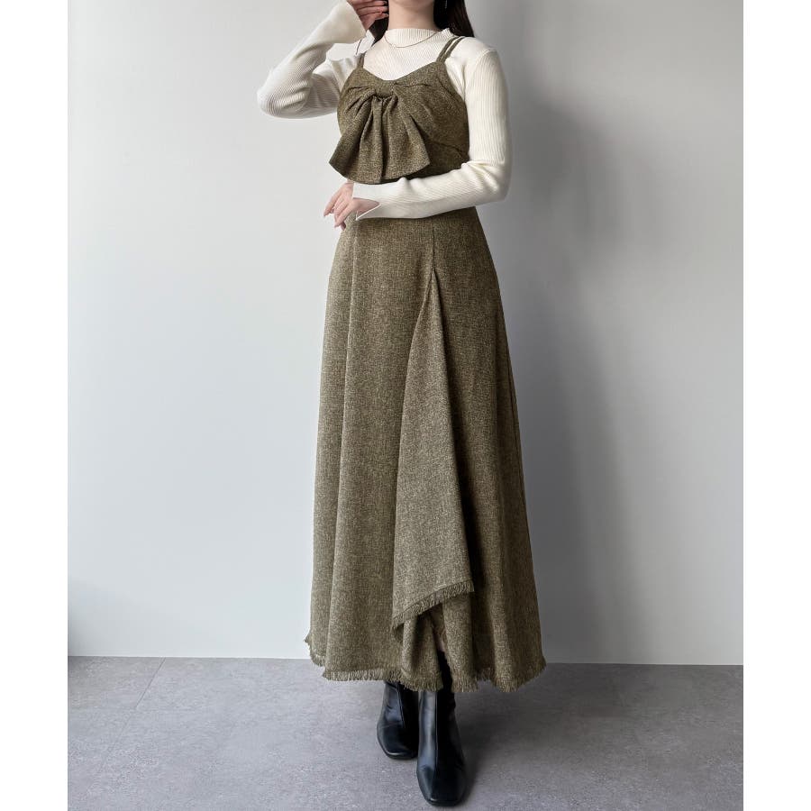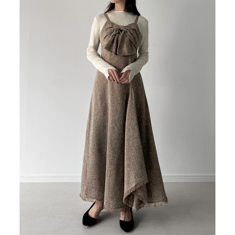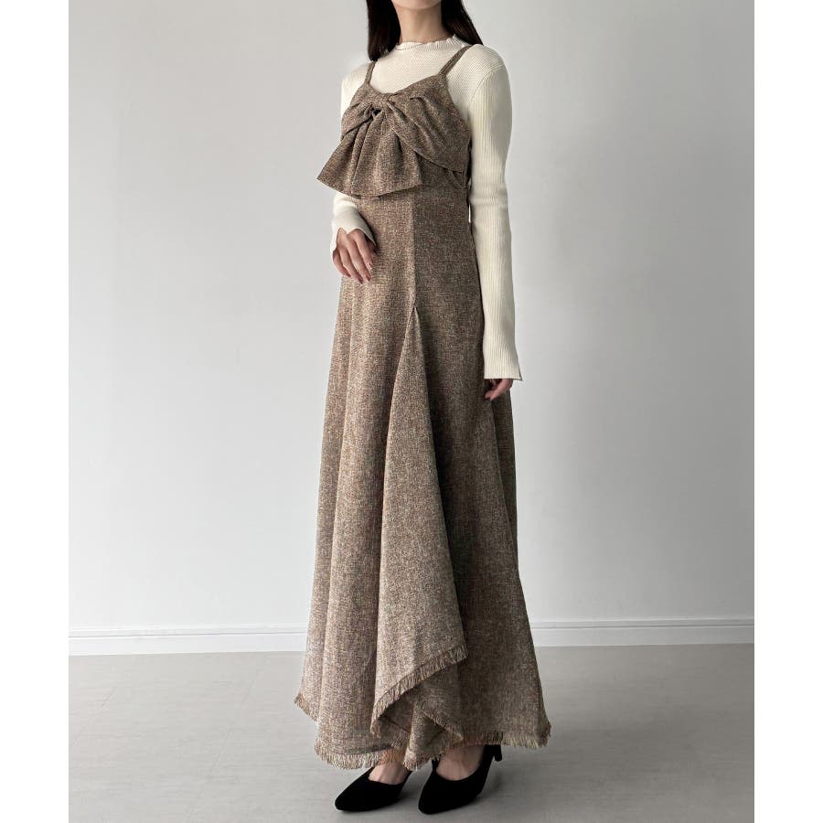 mipiarl 薄手ツイードフロントリボンラッフルキャミワンピース