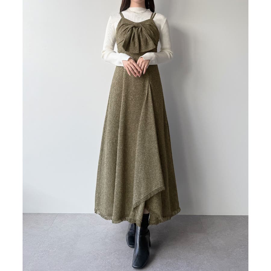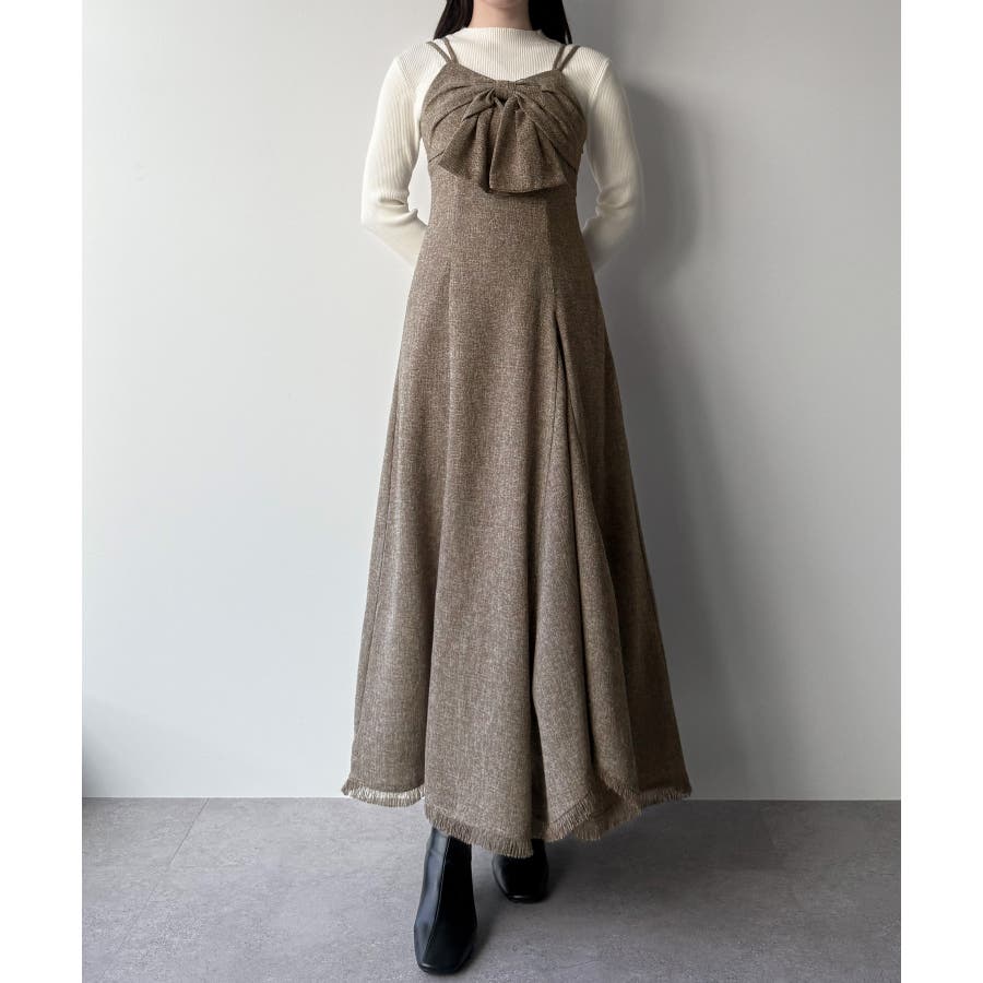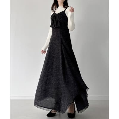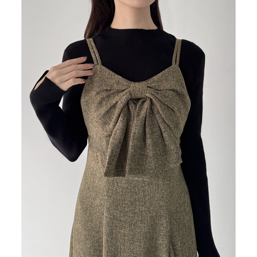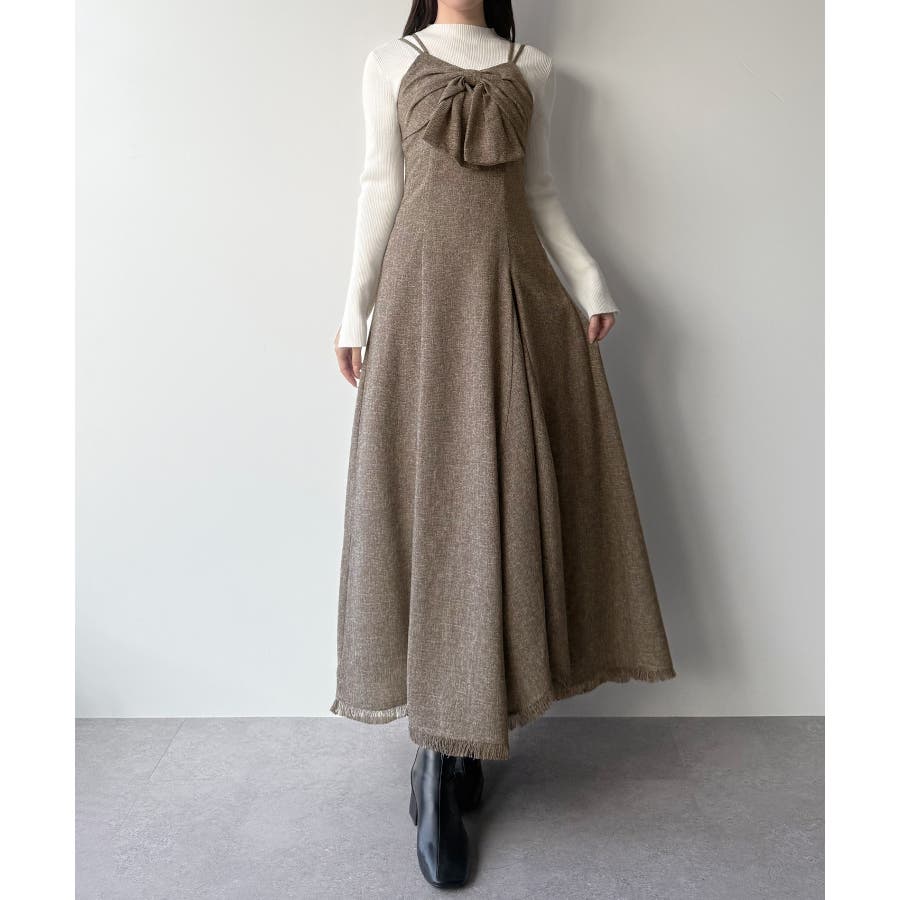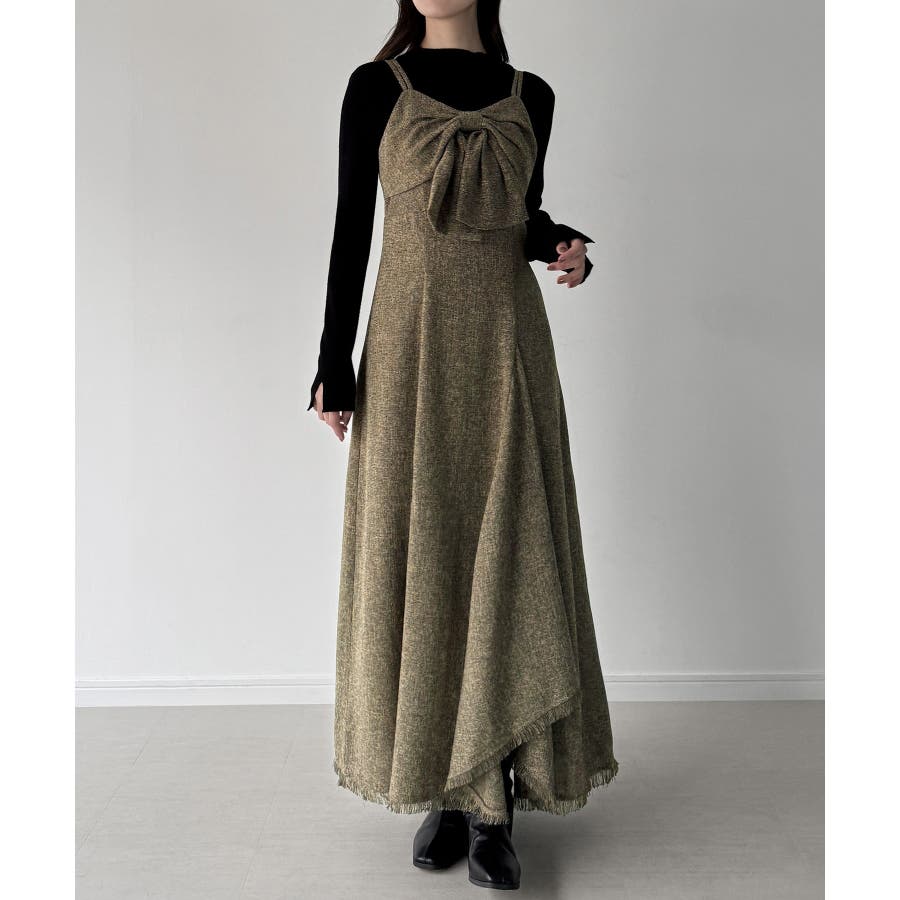 mipiarl 薄手ツイードフロントリボンラッフルキャミワンピース