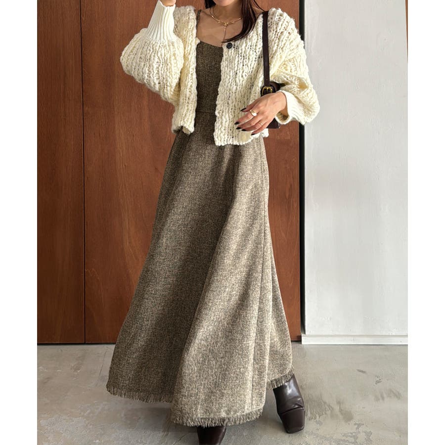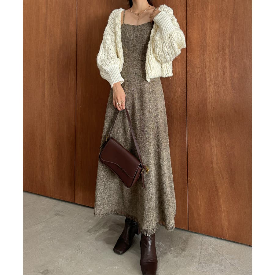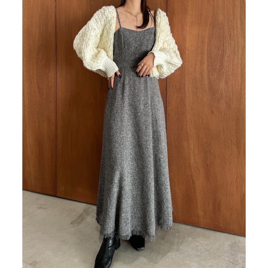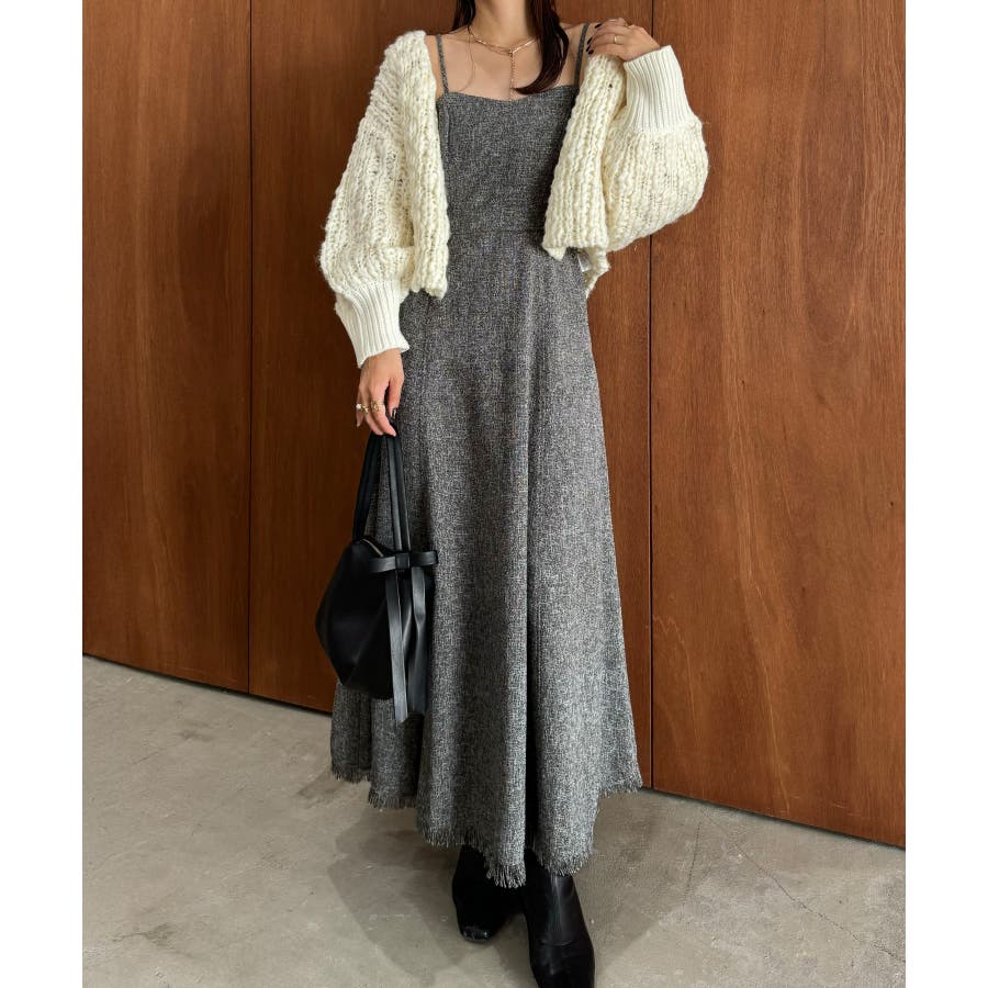 裾フリンジツイードフレアキャミワンピース