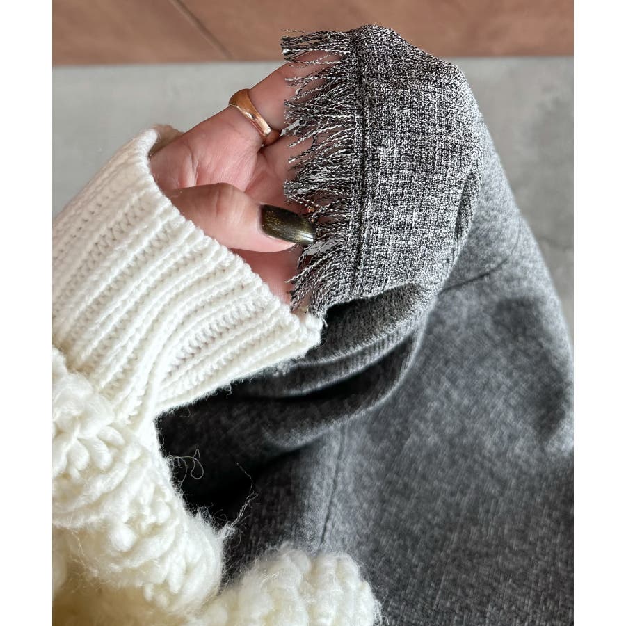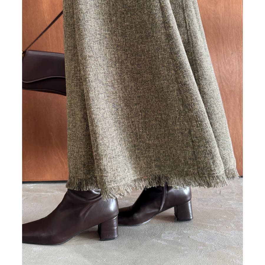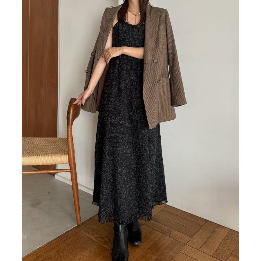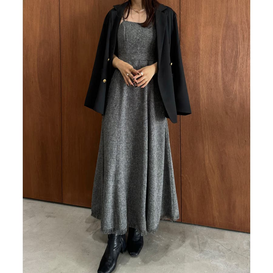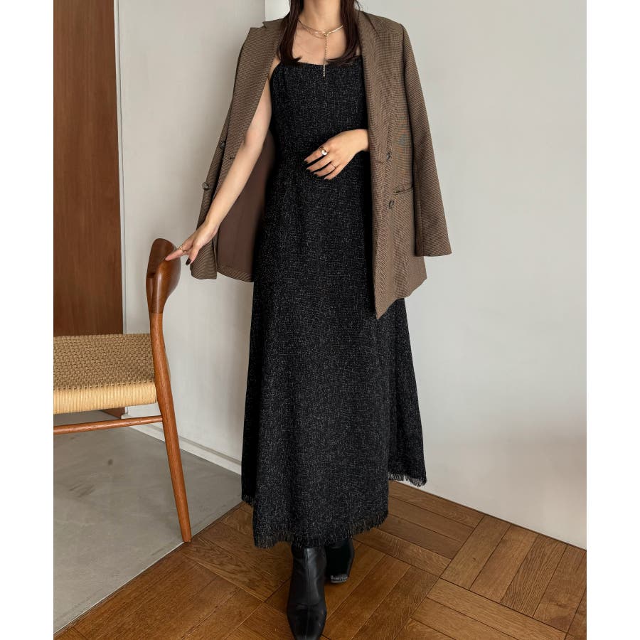 裾フリンジツイードフレアキャミワンピース