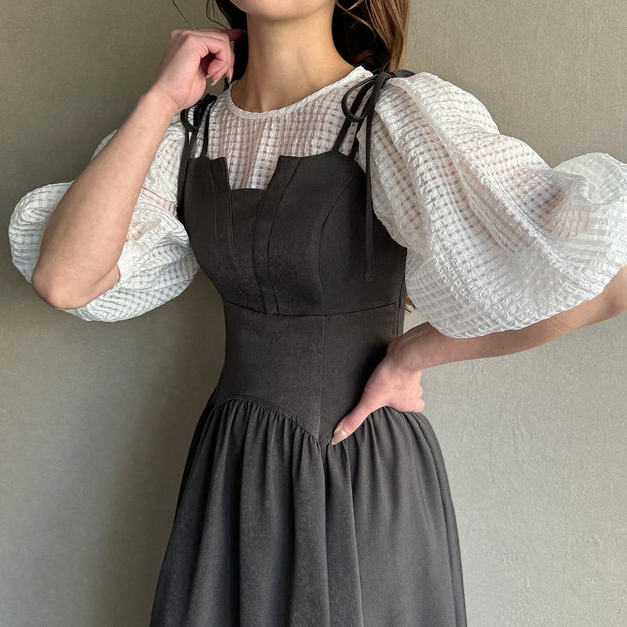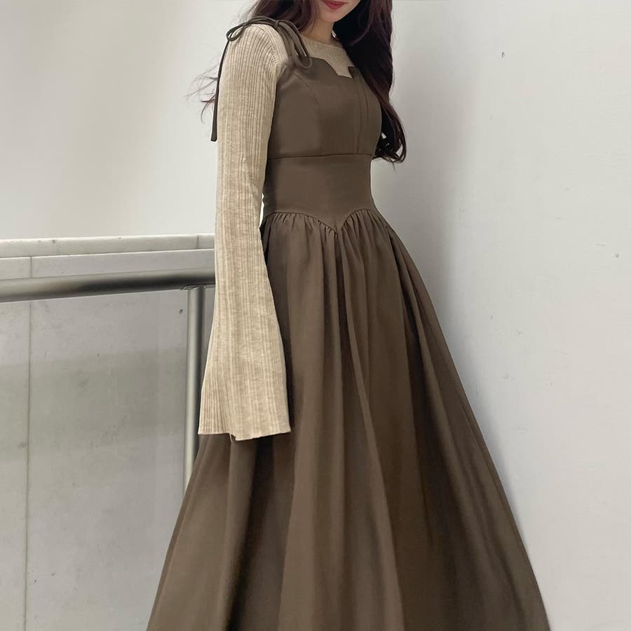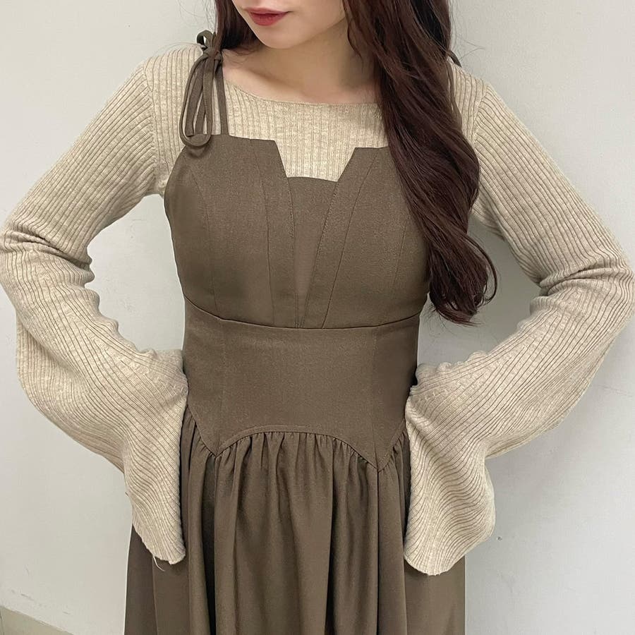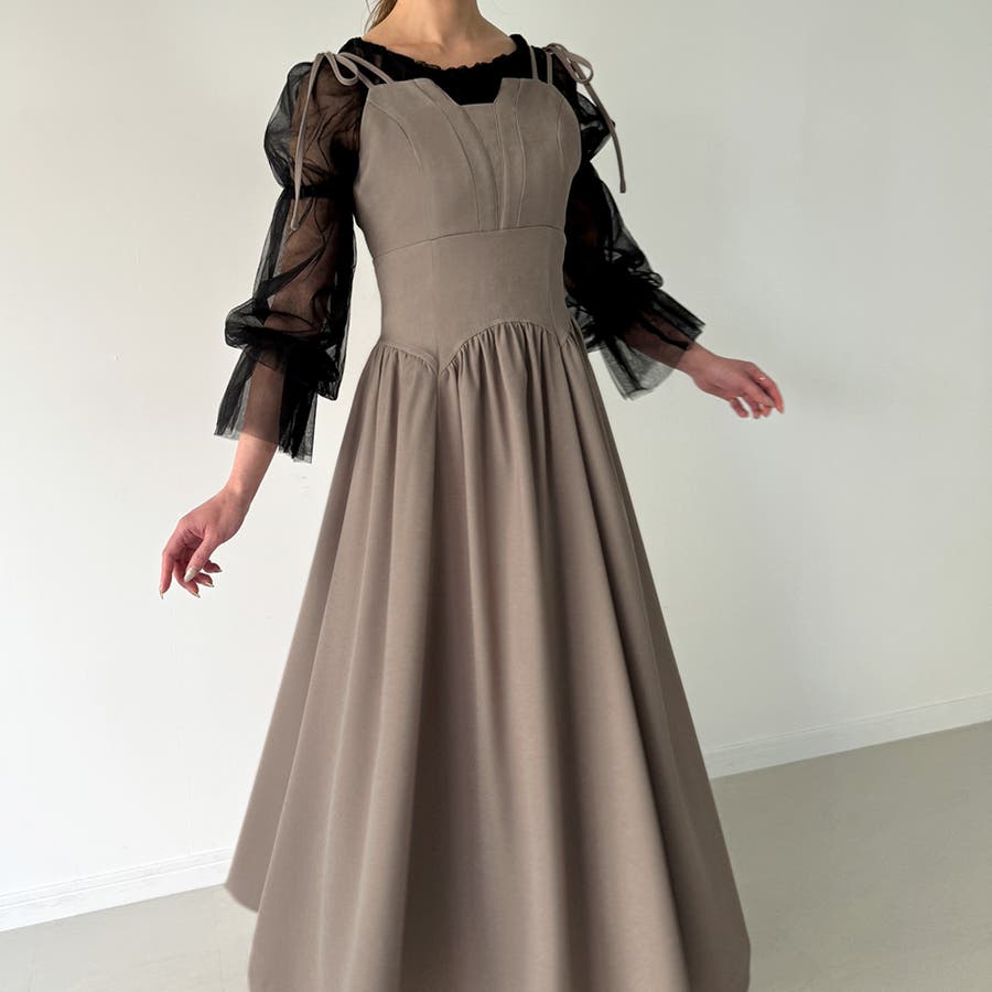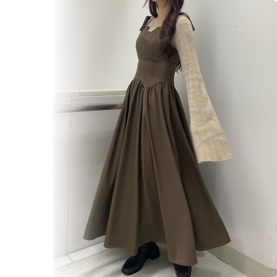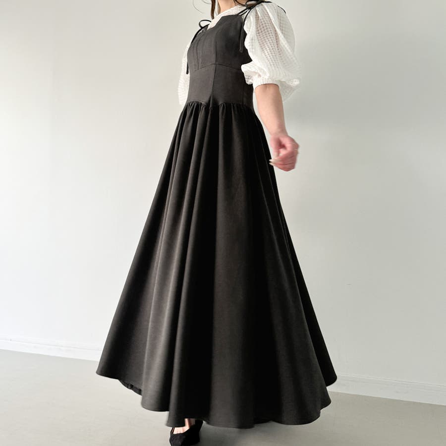 【グレイッシュラベンダー】ショルダーリボンコルセットフレアキャミワンピース