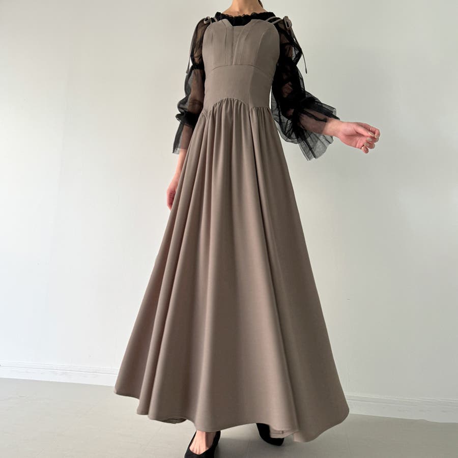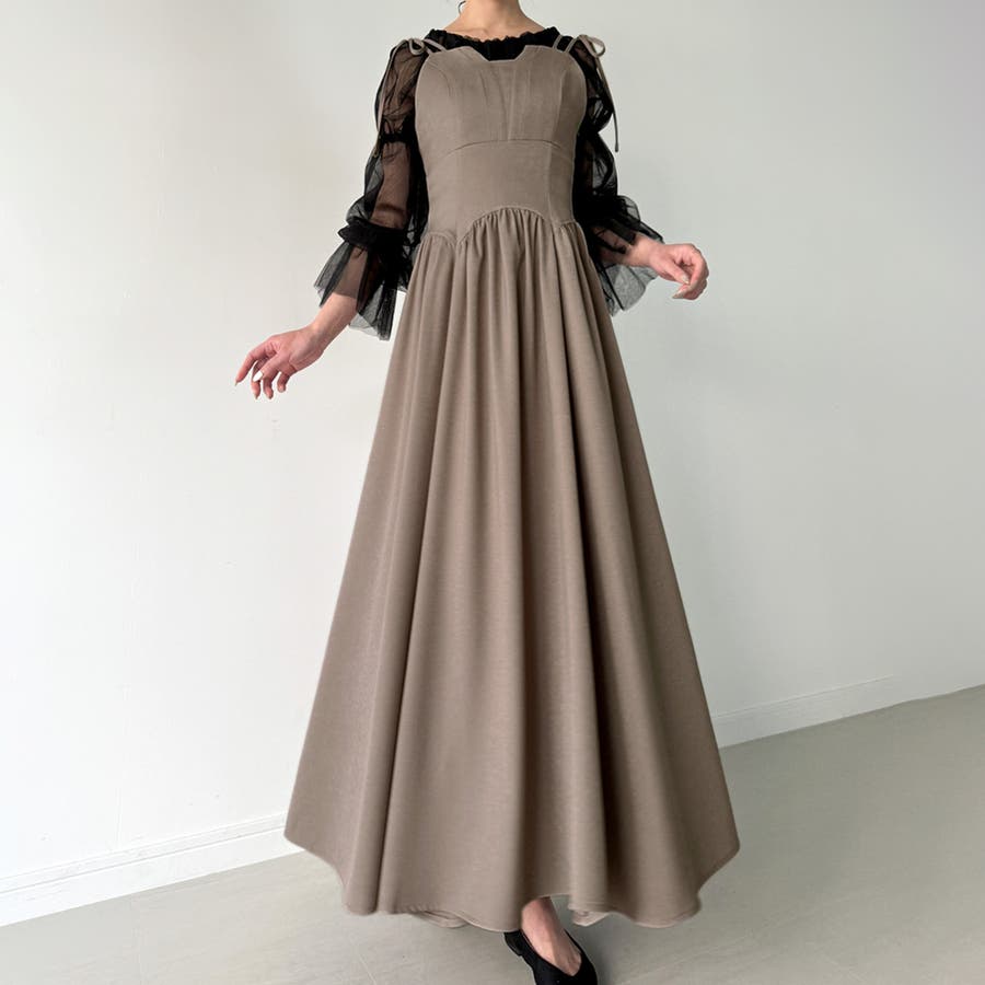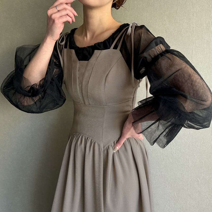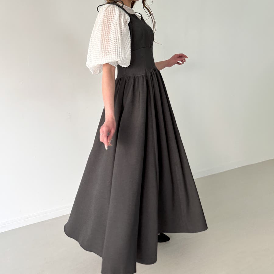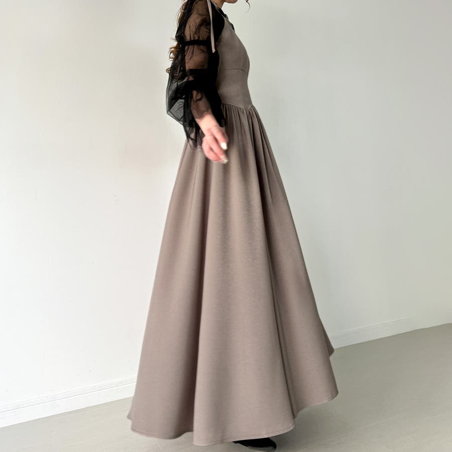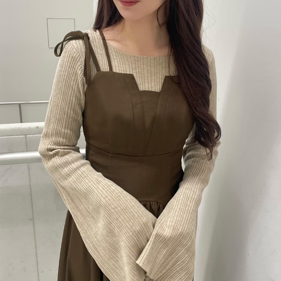 【グレイッシュラベンダー】ショルダーリボンコルセットフレアキャミワンピース