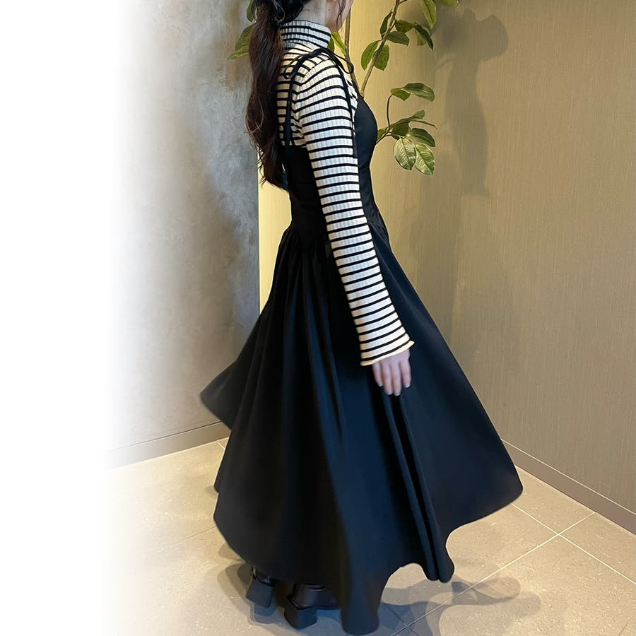 肩リボンも可愛いしリボンじゃない方はちゃんとアジャスター付いてるのでウエストを高めの位置になる様に調整して着てみてほしい。身長149で足首ちょい出る位の丈感。