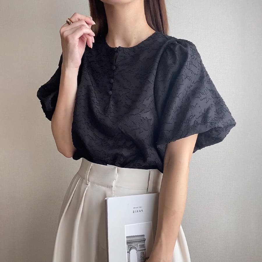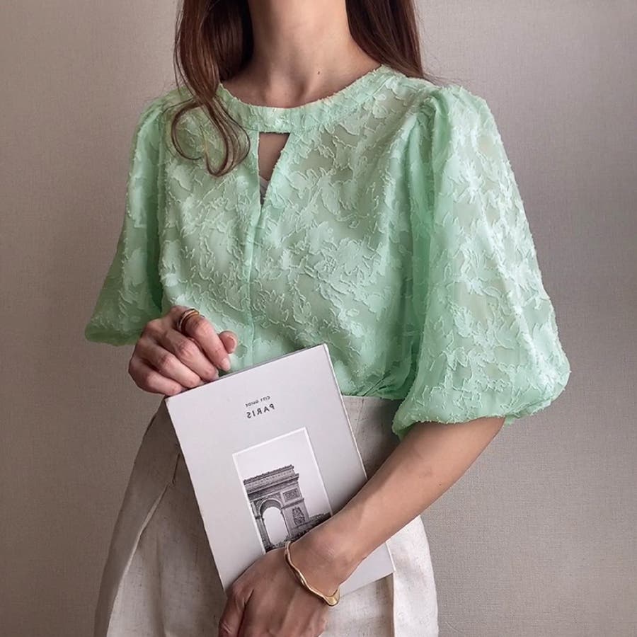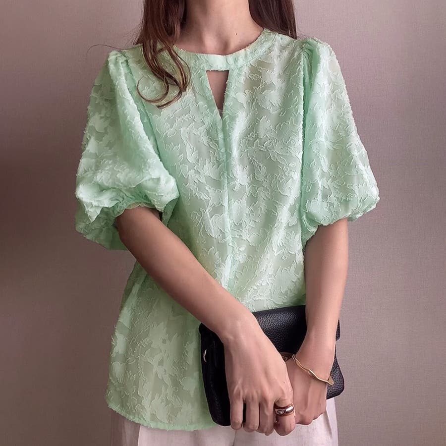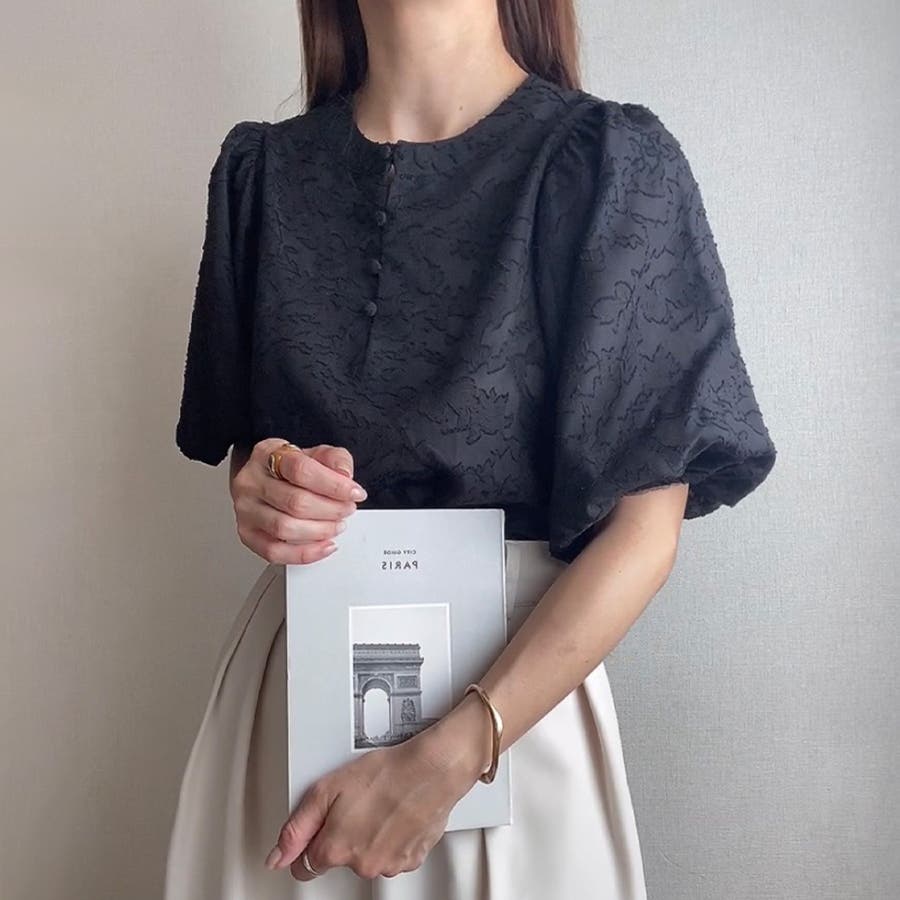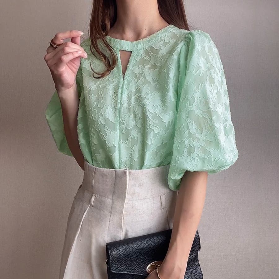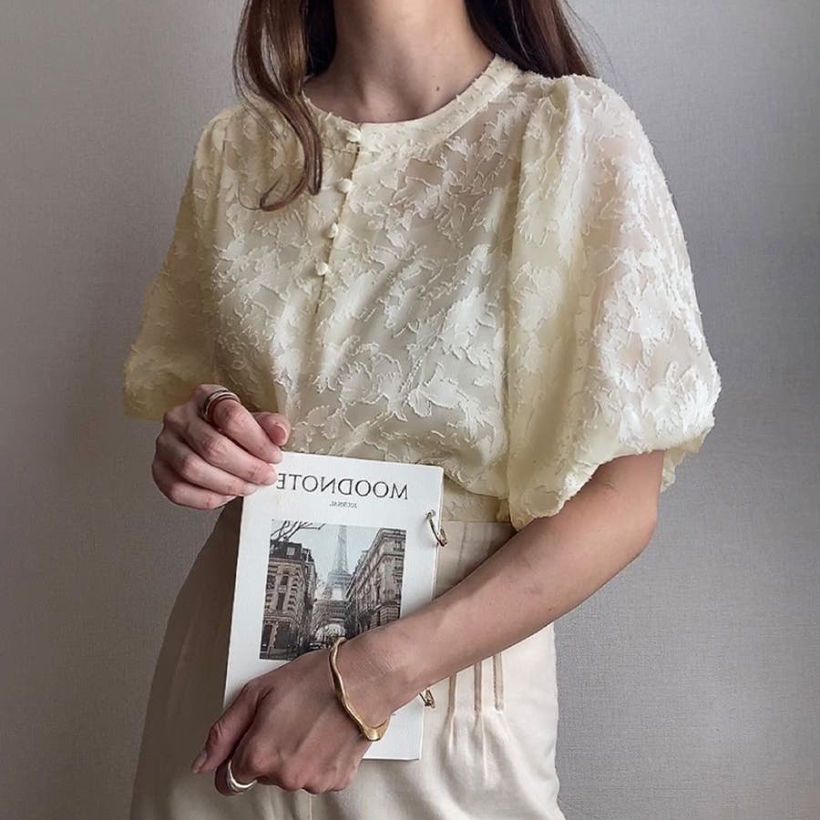 【クリーム】FILLOU 2wayシアーフラワージャガードボリュームスリーブブラウス