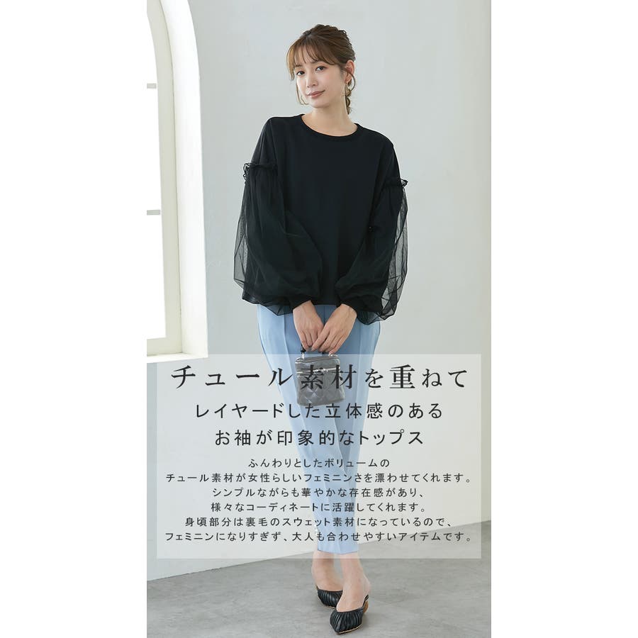 チュール素材を重ねてレイヤードした立体感のあるお袖が印象的なトップス。