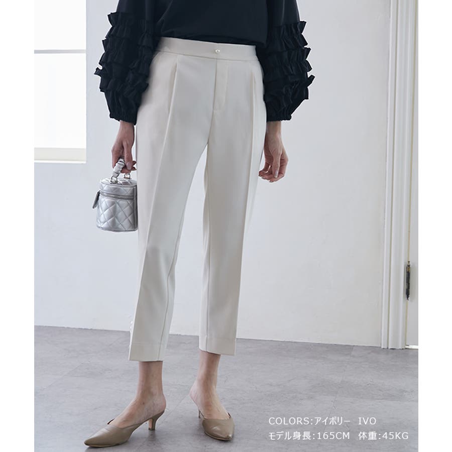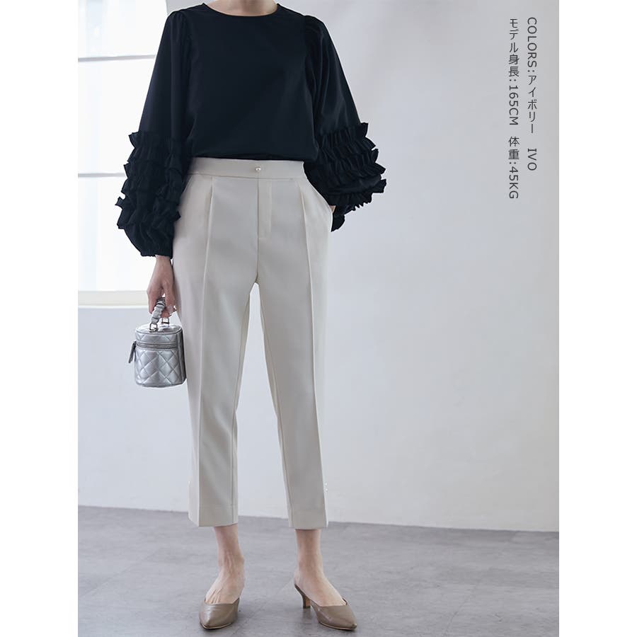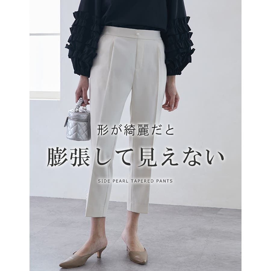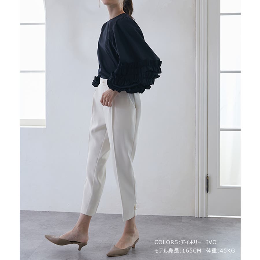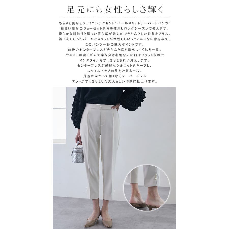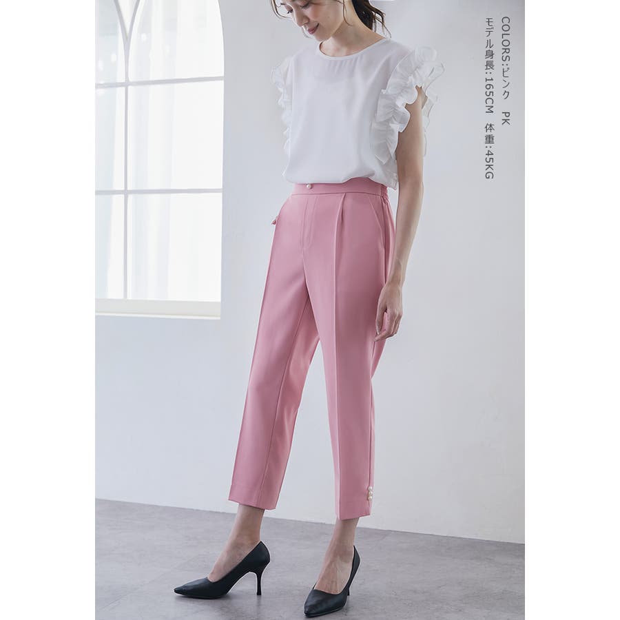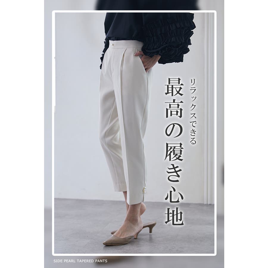 ちらりと見せるフェミニンアクセント“パールスリットテーパードパンツ”