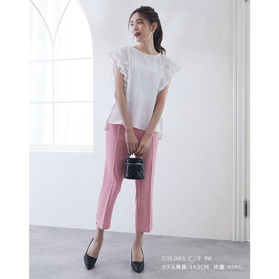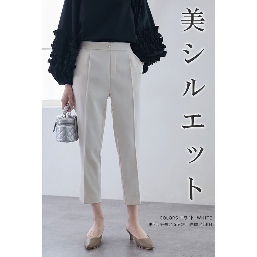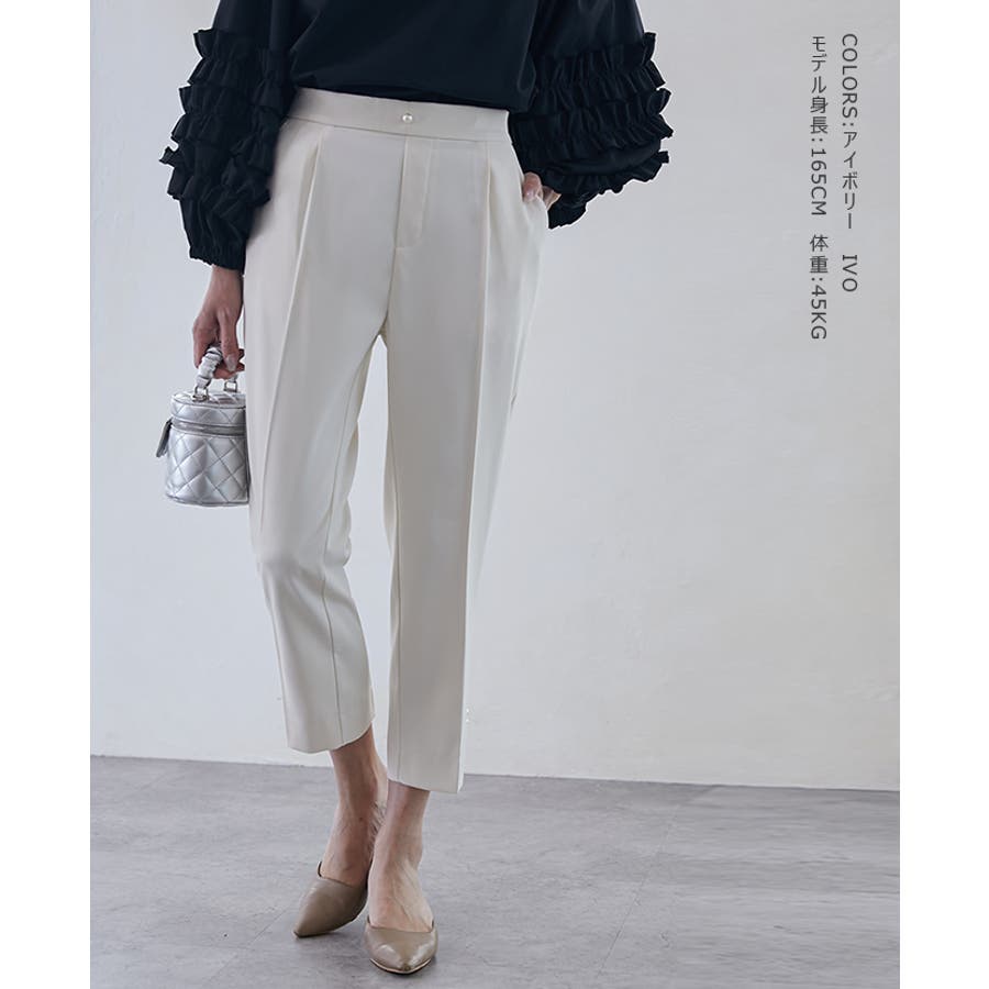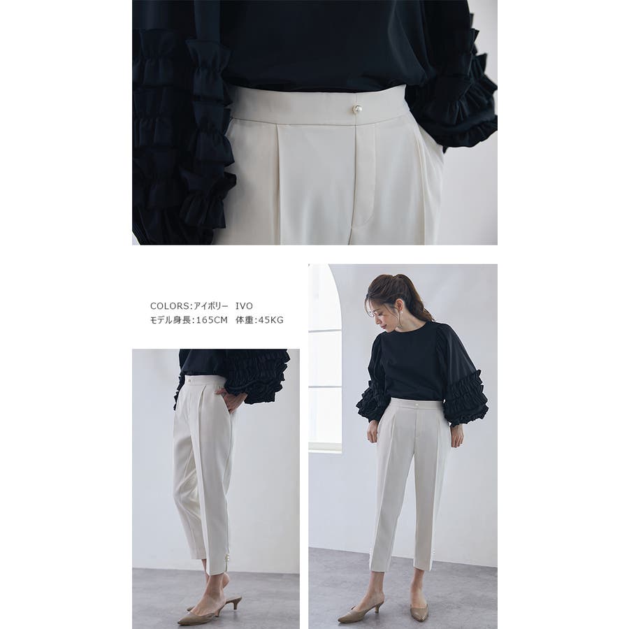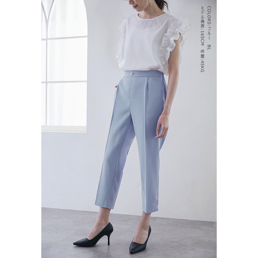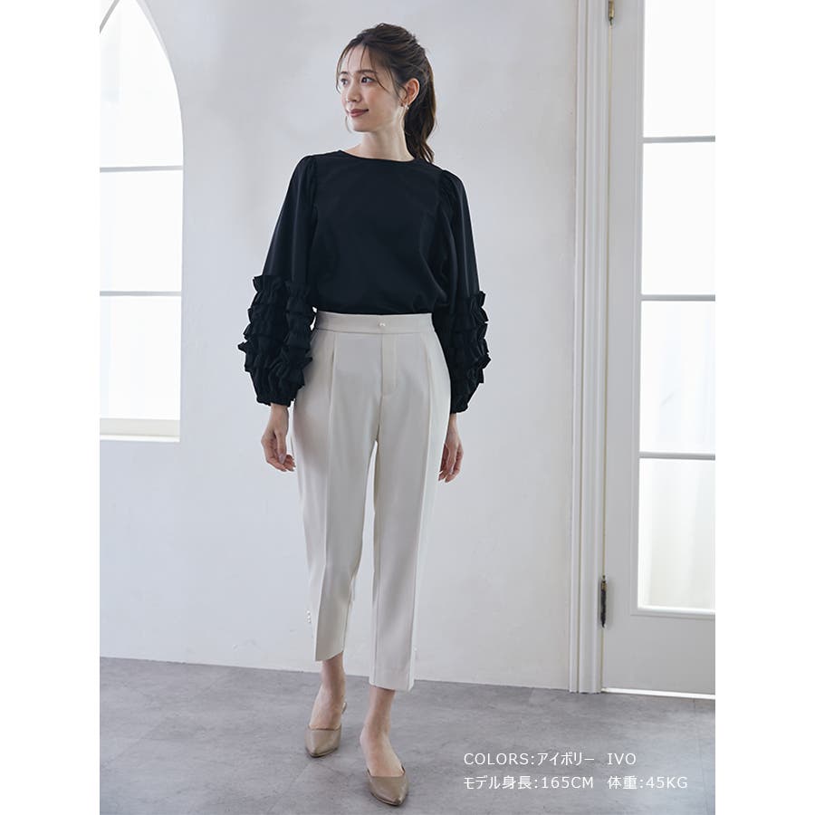ちらりと見せるフェミニンアクセント“パールスリットテーパードパンツ”
