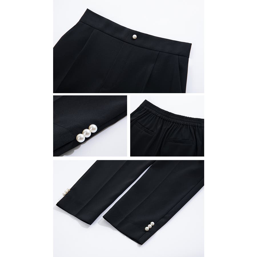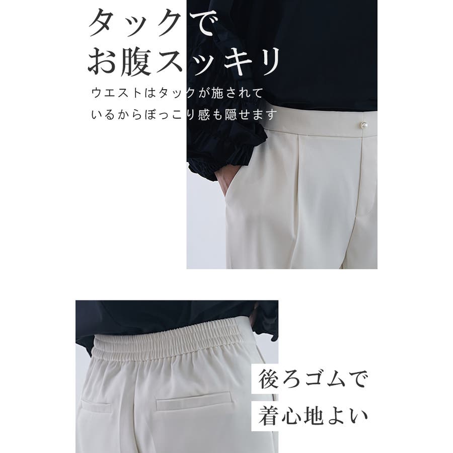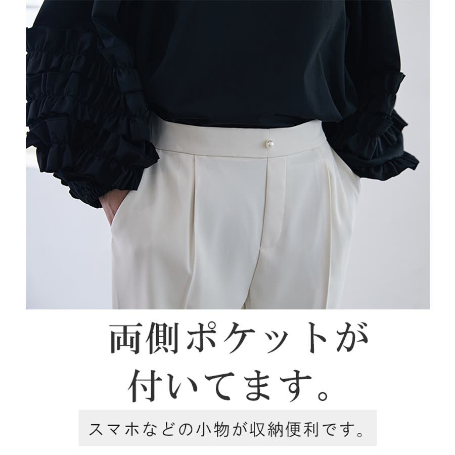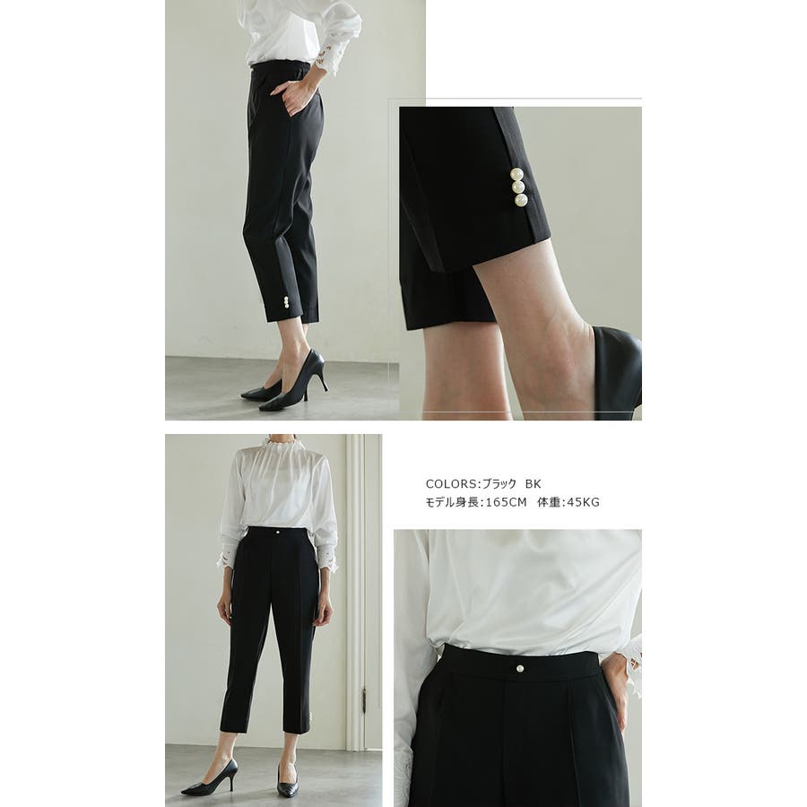 裾にあしらったパールとスリットが女性らしいフェミニンな印象を与え、このパンツ一番の魅力ポイントです。