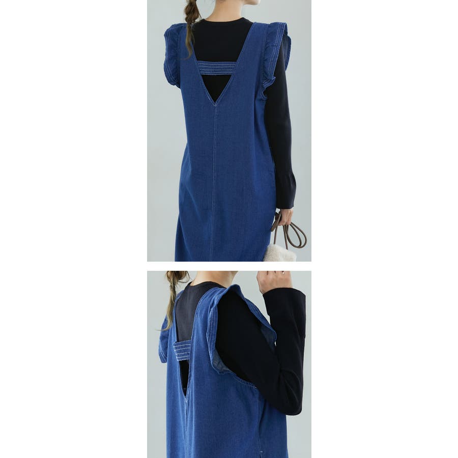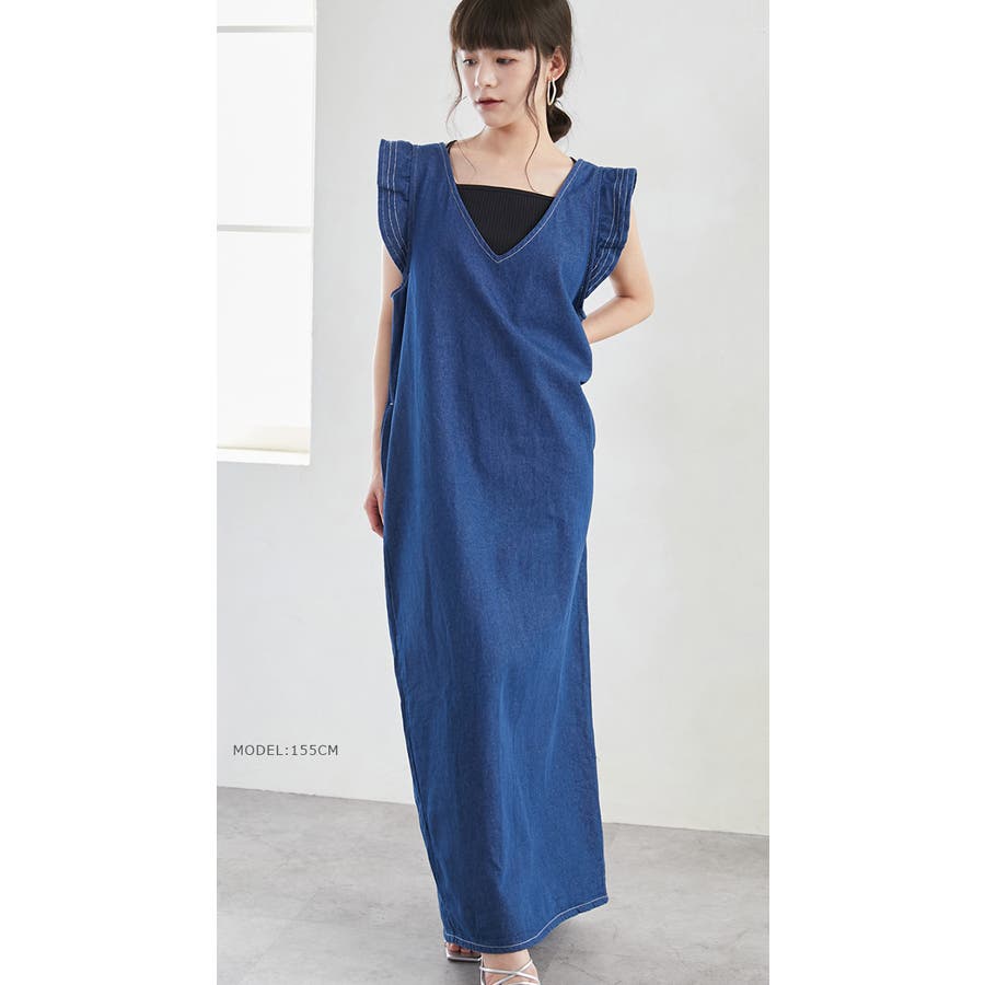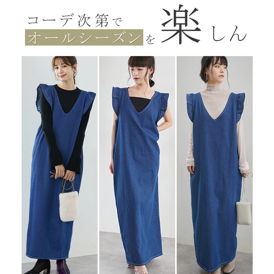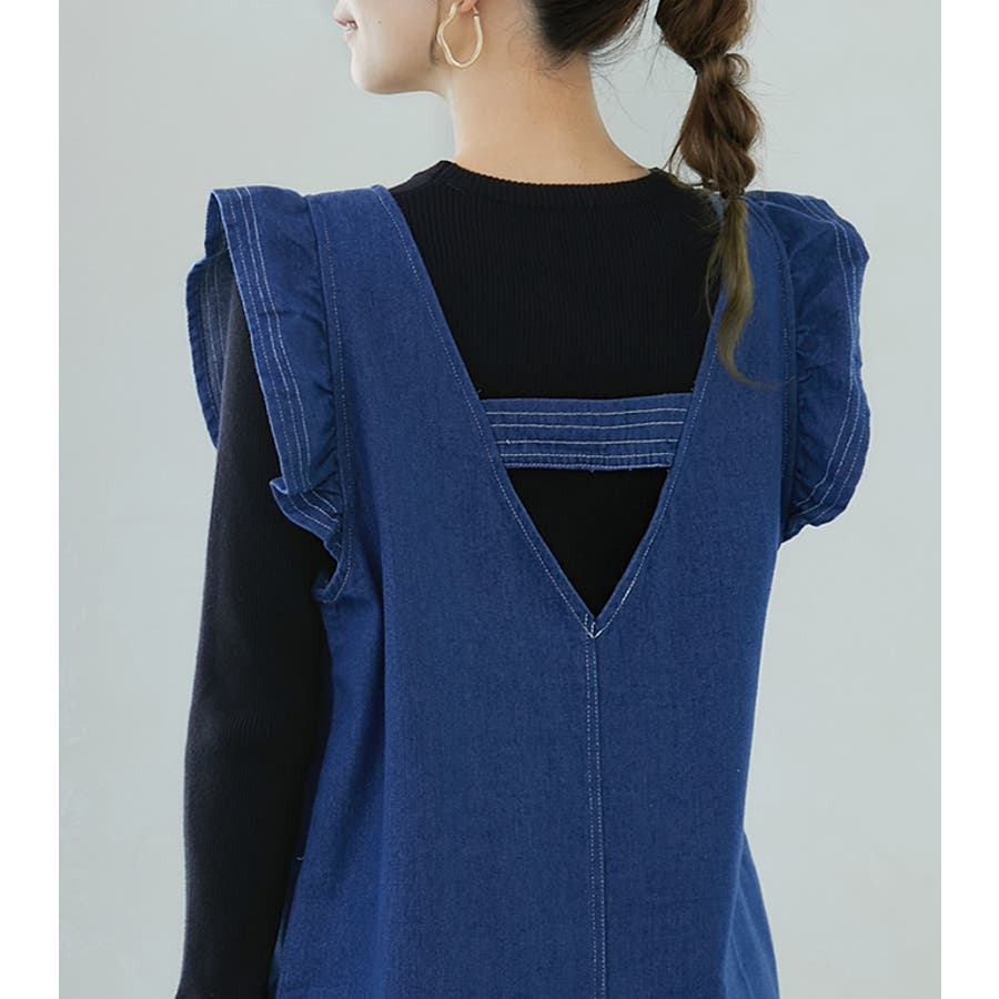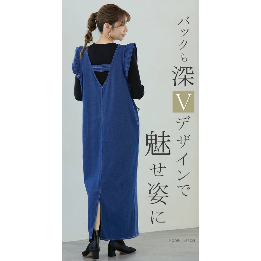 カジュアルながらも女性らしい印象のデニムワンピース。フリルとバックスタイルの大きめに開いたVカットデザインが目を惹き、