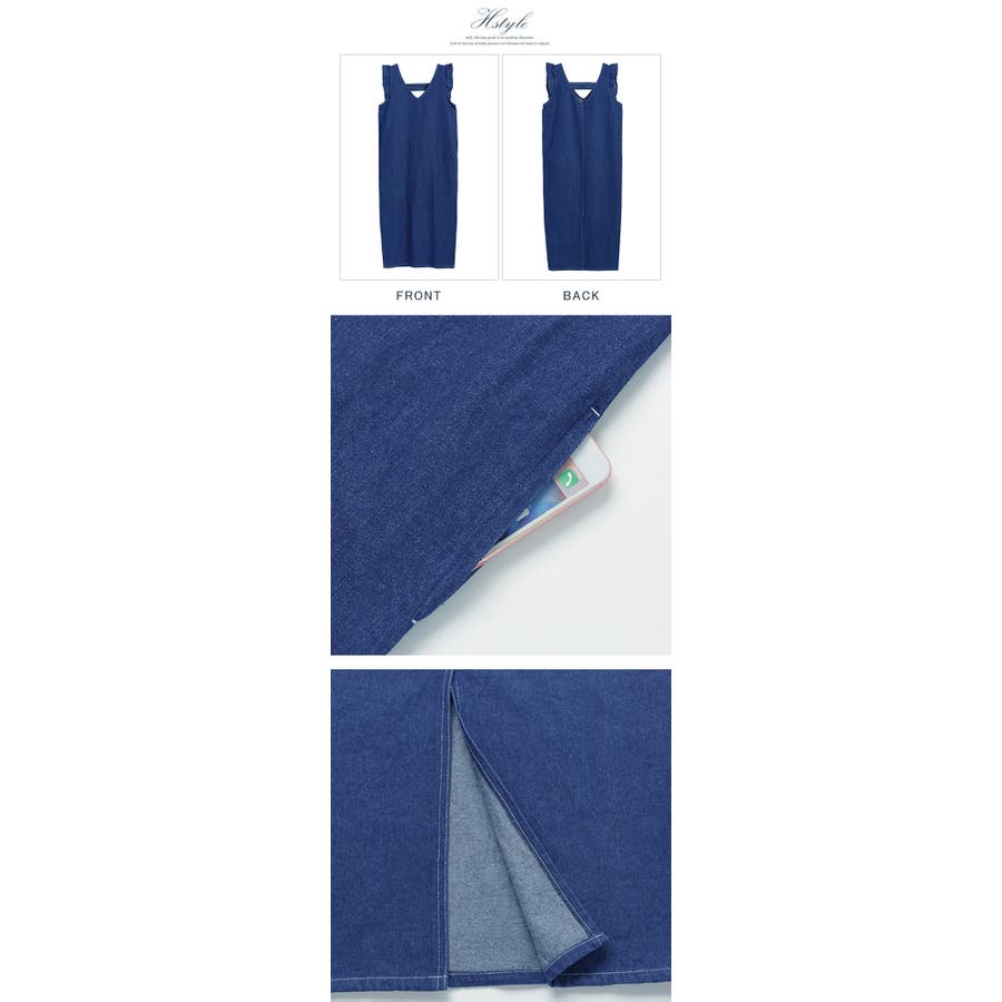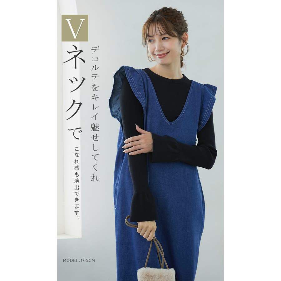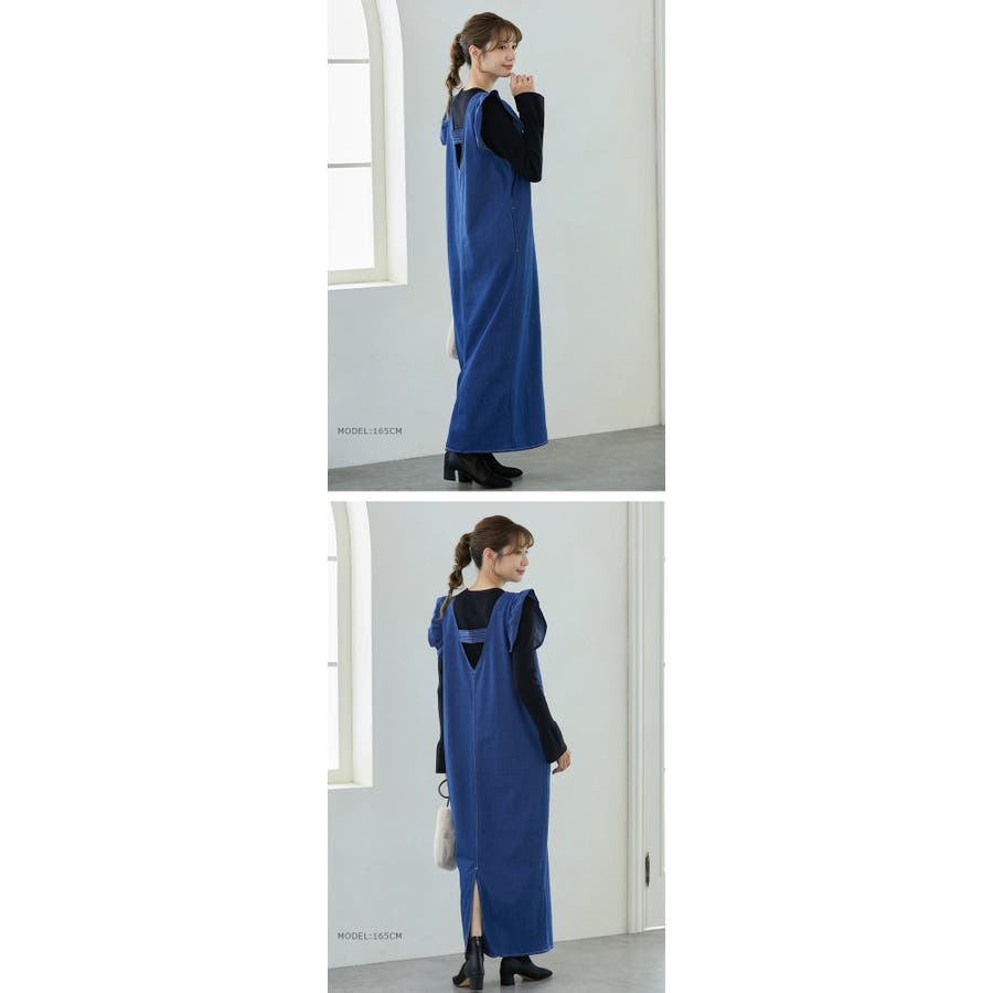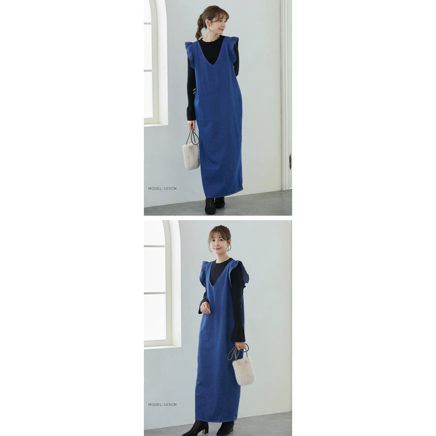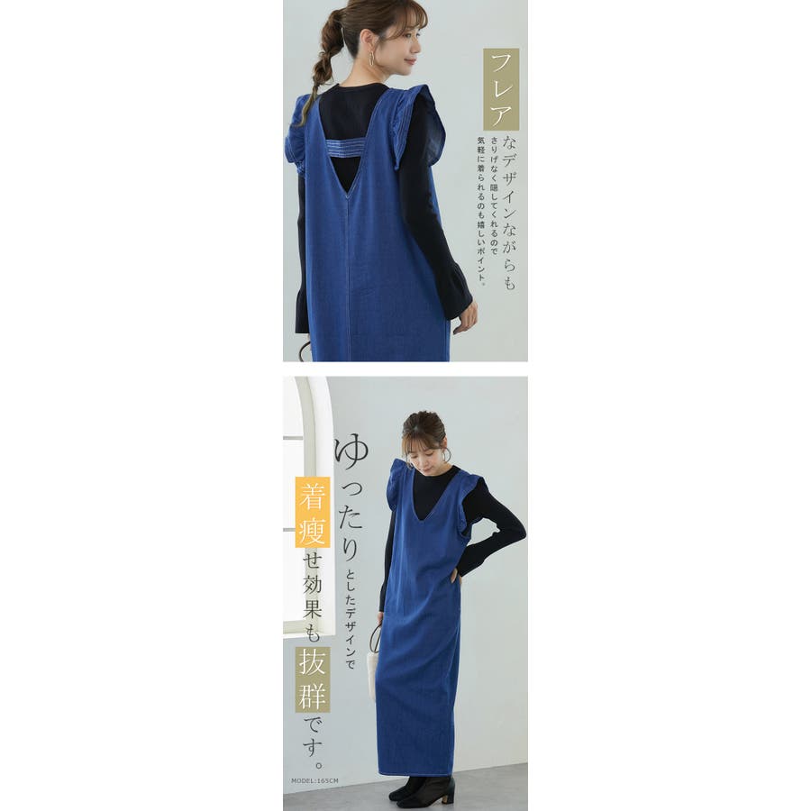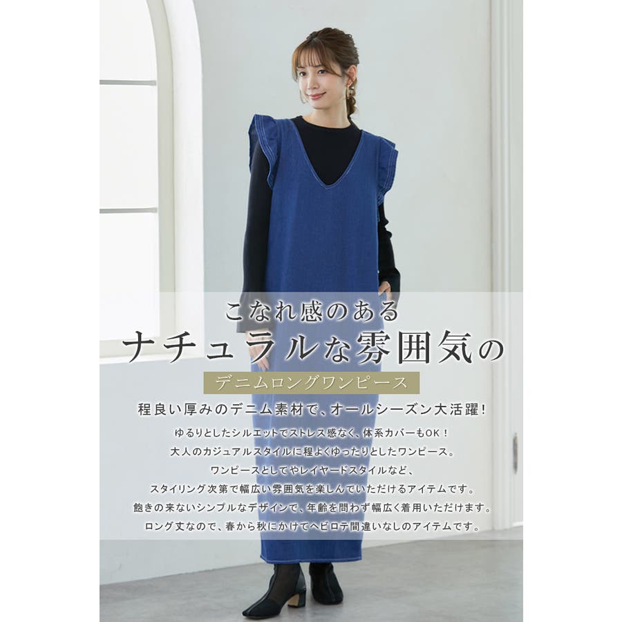カジュアルながらも女性らしい印象のデニムワンピース。フリルとバックスタイルの大きめに開いたVカットデザインが目を惹き、
