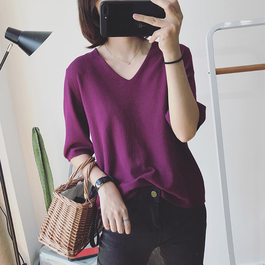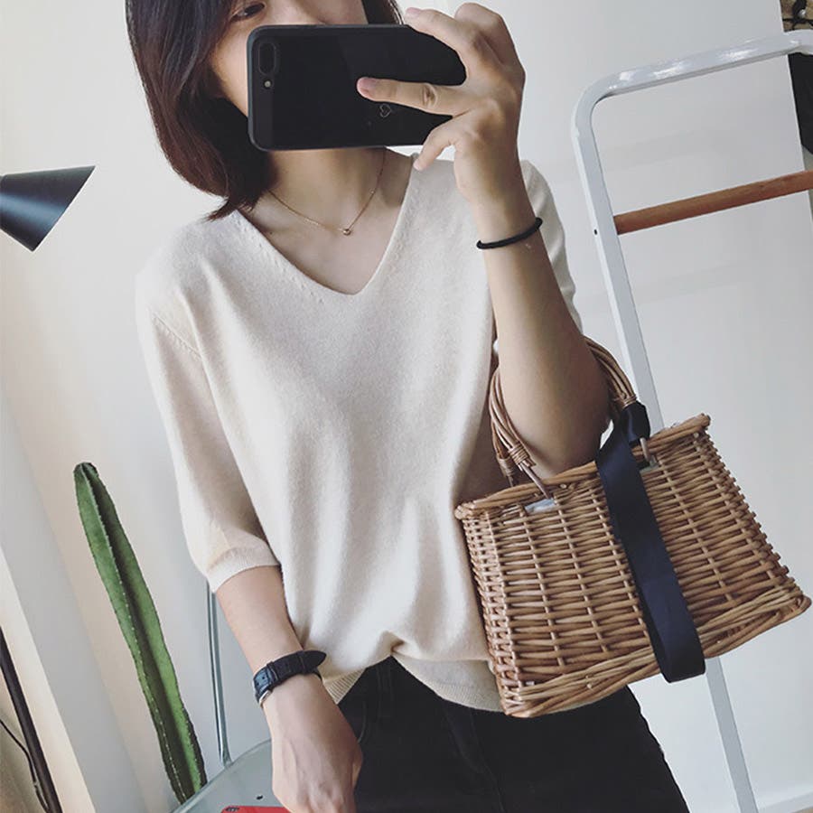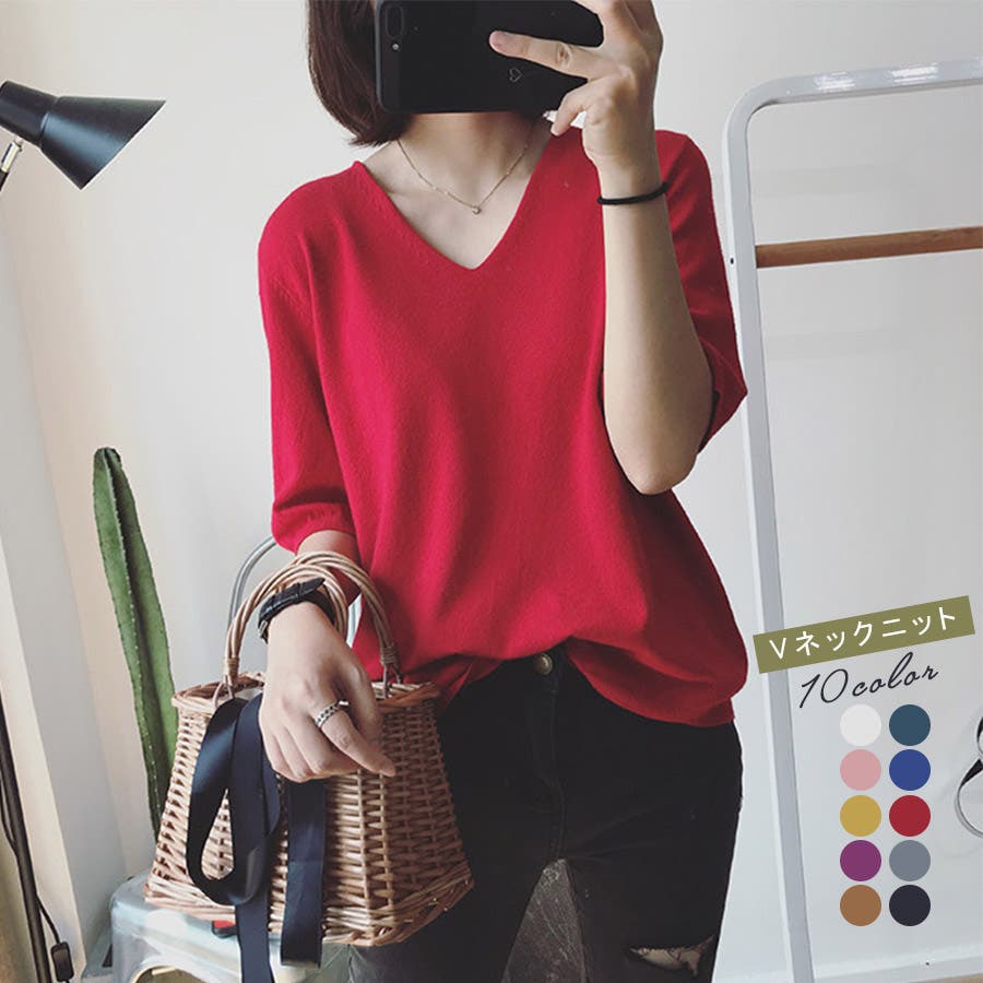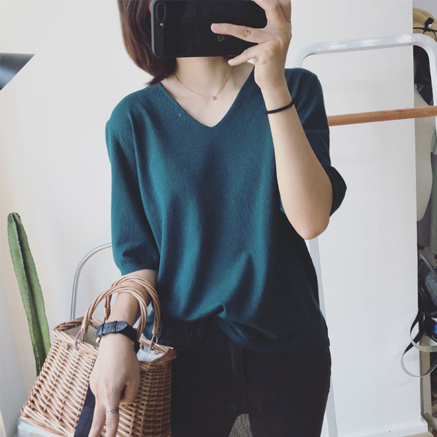 Vネックニット袖丈を短くしているので、長いシーズン着られます。